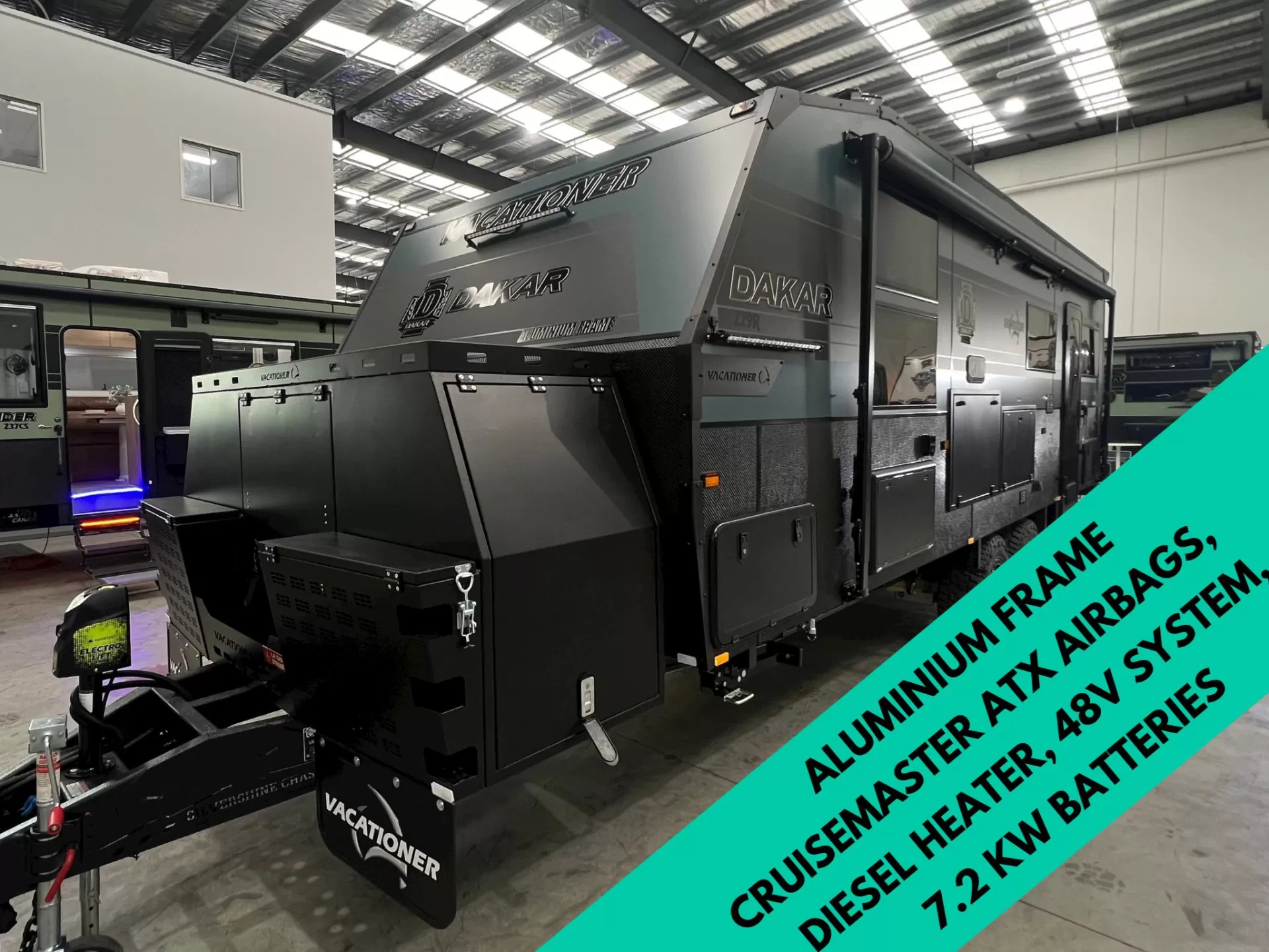 Experience the ultimate off-road journey with the DAKAR caravan. It features the CRUISEMASTER ATX Unleashed 4.5T Stage 4 Auto Air Bag suspension and 17" Mickey Thompson Baja Boss AT tyres for smooth terrain navigation. Powered by a 48V system with Dyness lithium batteries (totalling 7.2kW), a MultiPlus II 5000W-70A inverter, and 1kW of 48V solar panels, it provides ample off-grid power. Its robust aluminium frame, combined with one-piece fibreglass internal walls and roof, ensures both durability and comfort for unforgettable adventures.