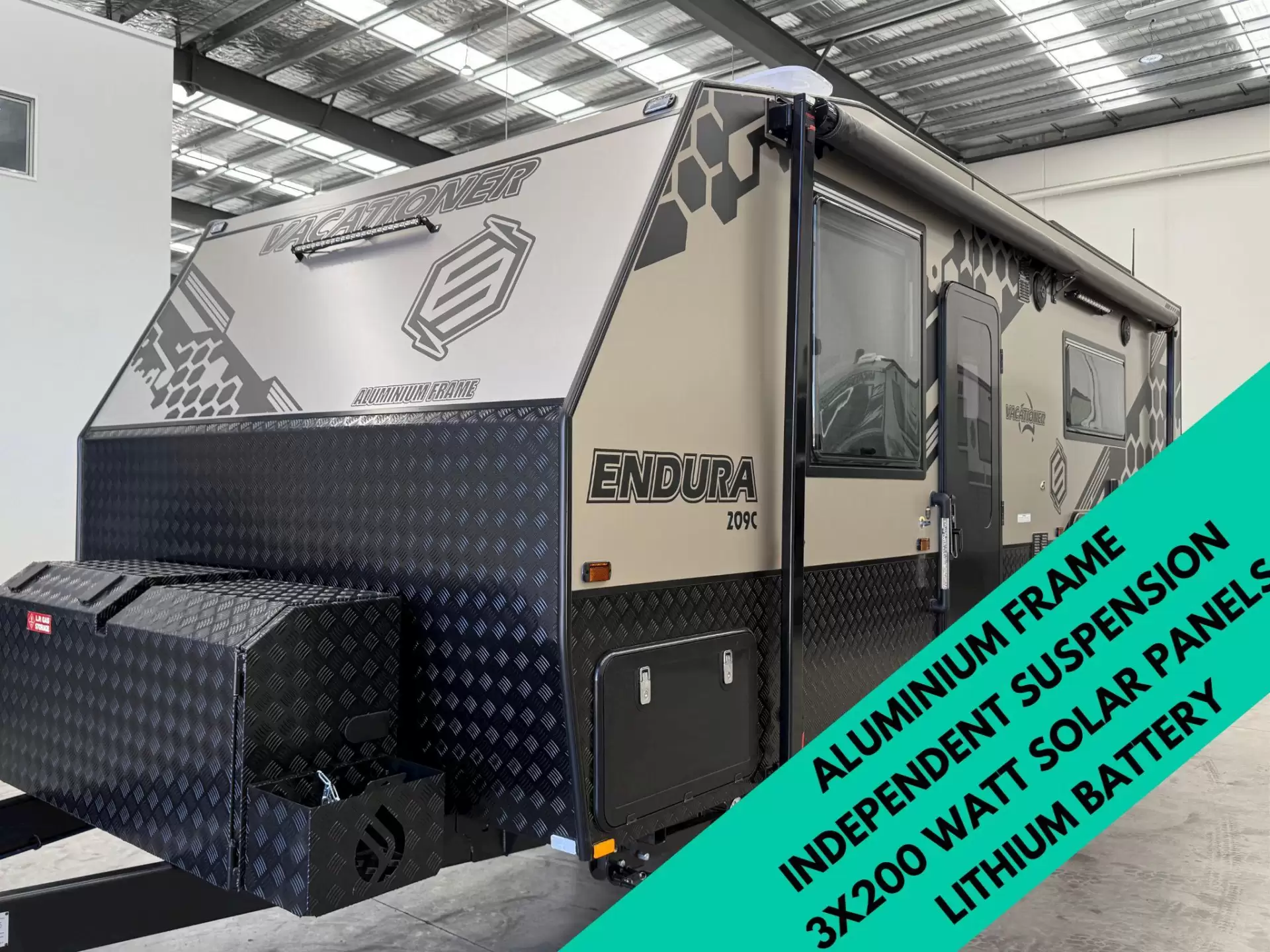 Introducing the Endura by Vacationer Caravans—THE BEST value aluminium frame caravan in Australia. Equipped with an ALKO Enduro-X Coil 4.1T independent suspension, this caravan ensures a smooth and reliable journey across the rugged outback. Its robust construction includes a one-piece honeycomb floor, an external fibreglass roof, and fibreglass internal walls and roof, ensuring both durability and comfort.