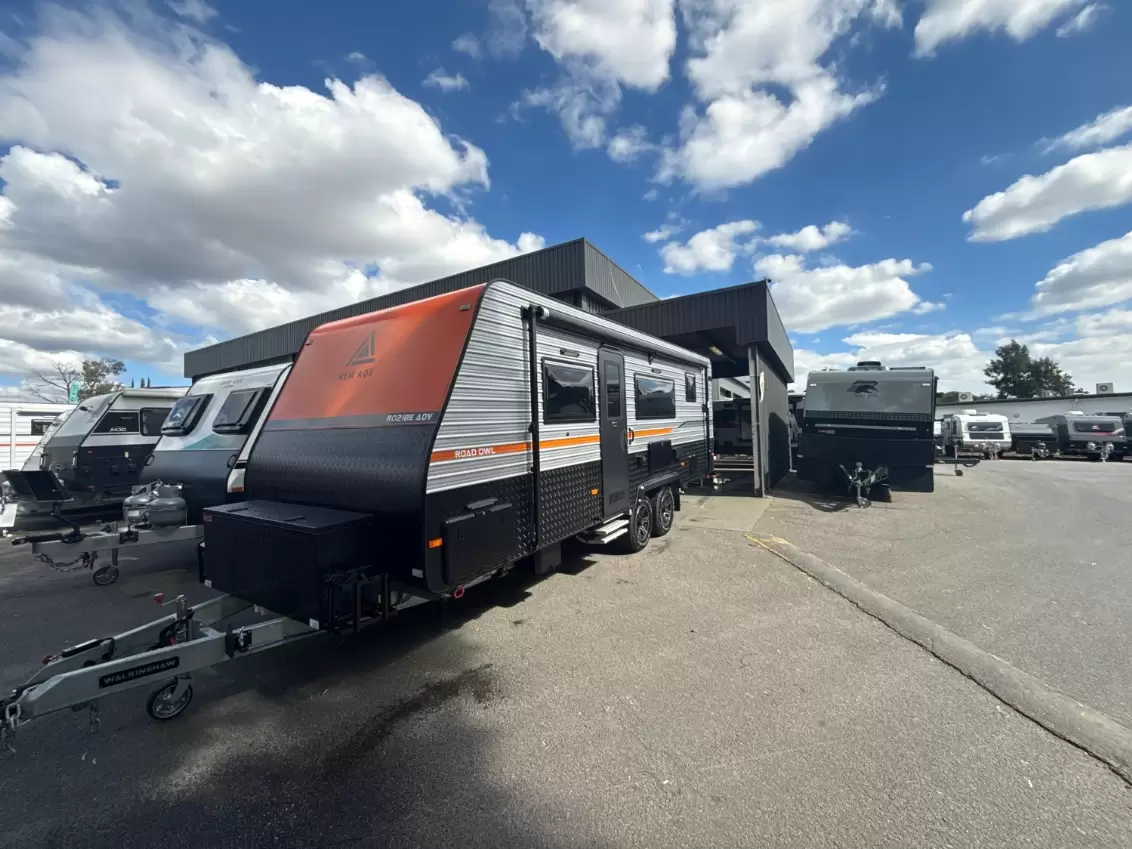 JUST ARRIVED. THE EVER POPULAR NEW AGE ROAD OWL 21 MY24 FAMILY CARAVAN. ONE OWNER. ONE OF THE LAST TRUE WALKINSHAW BUILD NEW AGE CARAVAN. CRUISE MASTER INDEPENDENT SUSPENSION, WALKINSHAW DESIGNED HOT GALV DIPPED CHASSIS, DO35 HITCH 2X110lt FRESH WATER TANKS, 1X110lt GREY WATER TANK. DUAL BATTERIES, 200W SOLAR WITH A SOLAR INPUT PROVISION, ISLAND BED, 3 FULL SIZE BUNKS, BLACK PACK, REVERSE CYCLE AIR CONDITIONING, WASHING MACHINE, BMPro SWAY CONTROL, BALANCE OF 3 YEAR FACTORY WARRANTY. PRICED SHARPLY FOR SALE AT 69,990.00.