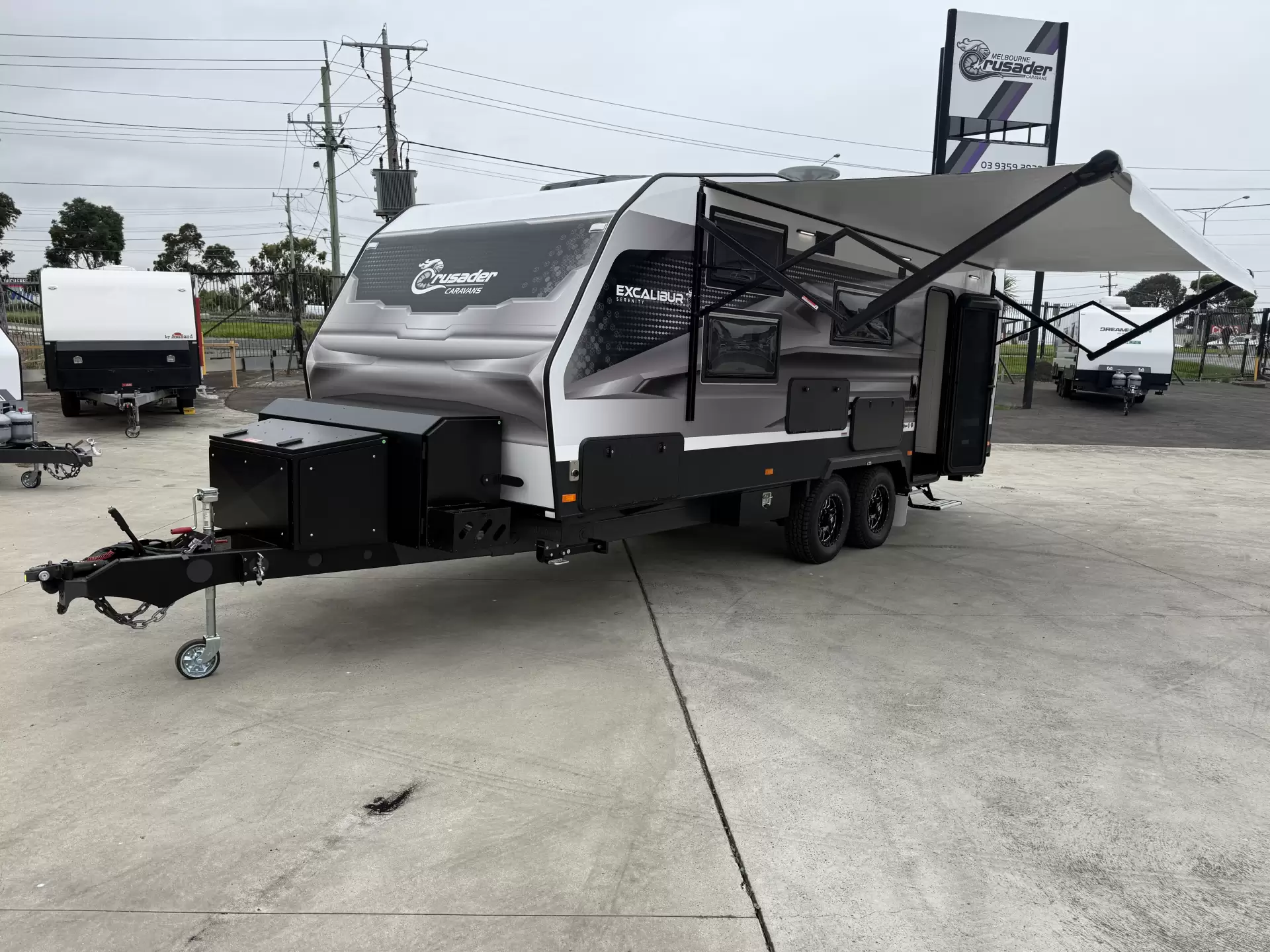 Excalibur Serenity – Luxury ElevatedThe Excalibur Serenity takes luxury to new heights, offering a sophisticated and opulent experience for those who demand the finest in caravanning. Designed for discerning travelers seeking exceptional comfort and style, the Serenity excels on both well-traveled roads and challenging terrains.Built for strength and stability, the Excalibur Serenity features a tandem axle with a premium DO35 Coupling for smooth and secure towing. Its 3.5T Independent Suspension by Tuff-Ride ensures a stable and comfortable ride, even on rugged terrain. The durable one-piece EcoLite panels provide exceptional insulation and weather resistance, with 30mm walls and a 40mm roof and floor.The spacious kitchen includes a Thetford Topline Hybrid Induction Cooktop, Duplex Oven, and a large 274L Thetford Compressor Fridge, ideal for extended journeys. The Grandeur Style Club Lounge offers a stylish and comfortable space for dining, entertaining, or relaxing. The main bedroom features a plush queen-sized bed and Luxury View Windows, creating a serene and comfortable retreat.The modern full ensuite includes an instant gas hot water system, ensuring home-like amenities on the road. Climate control is managed by the Dometic Freshjet 7 Pro Air Conditioner, and a 4kg front-load washing machine provides hassle-free laundry during travels.Energy independence is a key feature, powered by the Victron Pack B system with a 2000W inverter. This is supported by a 300Ah lithium battery and three 200W solar panels, allowing for long-term off-grid adventures.Smart storage solutions include soft-closing drawers, a tunnel boot with a utility drawer and slide-out storage, and a front toolbox equipped with a generator slide, BBQ slide, two jerry can holders, and a gas bottle box with armor plate.Water systems feature dual 110L fresh water tanks, a 110L grey water tank, and an instant gas hot water service for added convenience. Safety is enhanced with durable LT 245/75/R16 tires, a single electric step, and the stylish Camec Invictus entrance door for easy access.This particular stock unit has been upgraded with the following items for even greater comfort and versatility:• Mattress - 6'4 Pillowtop• Extra Shelf X 6 to OHC's• Awning-Electric Altitude W/ Black LED Lightbar• Heater - Aufocus Diesel heater• Camera - Wireless Dual Rear view Camera ILO Wireless SingleWith a van body length of 22 feet and an ATM of 3500kg, the Excalibur Serenity offers a perfect balance of luxury, practicality, and adventure-readiness. Its spacious living area, robust construction, and off-grid capabilities make it the ideal choice for both long-distance explorations and serene getaways.Visit Crusader Caravans RV Melbourne at 1457 Sydney Road, Campbellfield, Victoria. Our friendly team is ready to help you find the perfect caravan for your travels.Open Monday to Friday from 9 am to 4:30 pm and Saturday from 9 am to 2 pm. For more information, call us on (03) 9359 2938.Your next adventure starts with the Excalibur Serenity!
