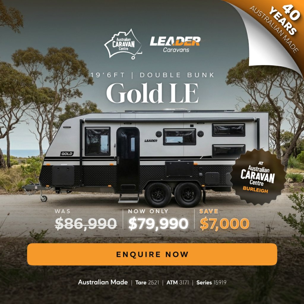 DON'T DELAY CALL NOW -07 5507 6500Australian Caravan Centre - 2 Junction Road Burleigh Heads Sales Opening hours: Monday to Friday 9am - 5pm Saturday 9am - 4pm Sunday: CLOSEDThis family caravan has it all, for optimum privacy and room for the whole household without having to give up comfort and luxury. This beautifully manufactured Caravan comes with so many features & inclusions there is nothing more to add than your camping destinations with your family!2025 Leader Gold LE (1960_C_K1E4B_T)86,990 Drive Away!!Tare: 2521ATM: 3171GVM: 2947Ball: 224This Caravan is loaded with features including:Internal features:*Oven, 3 gas / 1 electric burner and grill*Microwave*Dometic 3-way tropical grade (188 litre) 2 door fridge/freezer*Radio/Bluetooth audio system with 2 internal speakers*Beautiful matte finish interior*Robes with bedside nooks*Lift up under bed storage*240V/12V power points throughout*Large L-shaped lounge*Roof mounted air conditioner with remote*LED lights inc strip light in step well*Combo Ensuite*Ample amounts of storage*Double bunks*Black tapware*4 x 12V wall fans*Camec 4kg front load washing machineExternal features:*Roll out Awning*6 Permagal chassis*Roller Rocker suspension*10" brakes, 16 alloy wheels*1 x spare wheel*2 x Water tanks Grey water tank*Mesh tray under A-Frame*2 x 9kg gas bottles*2 battery on chassis*Smooth silver cladding*2 x solar panels*4 LED annexe Lights*External shower*External tv hatch *Picnic table*2 external speakers*Tunnel boot Front boot*4 arm rear bumper*Pull out step*BBQ gas point*Reverse cameraBe the leader of the pack!2025 Leader Gold LE Stock Number: 15919N Support local manufacturing, we are proudly Australian made and owned. With over 39 years' experience in designing & building modern caravans. There's something uniquely Australian about Supreme and Leader caravans.Over 30% of our stock gets sold before making it onto the web... If you have fine-tuned your search & know what you are looking for, we will help you find it quickly, easily & at a good price! We also provide in-depth, personalised handovers to ensure you are safe and comfortable on your next journey.