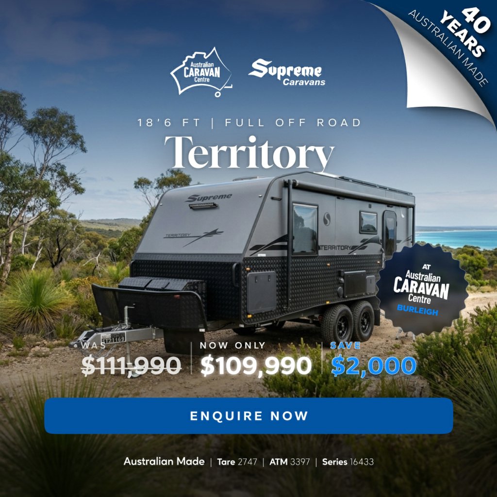 DON'T DELAY CALL NOW -07 5507 6500Australian Caravan Centre -2 Junction Road Burleigh Heads 4220Sales Opening hours: Monday to Friday 9am - 5pm Saturday 9am - 4pm Sunday: CLOSEDThis off-road van has all the amenities you would look for in a caravan and more. It is spacious, modern, and luxurious inside and out, perfect for touring in style! The ultra-comfortable home on wheels with supreme quality appliances will give you a unique experience beyond your expectations.Supreme Territory (1860_C_K3E7_T)111,990 Drive Away!!Tare: 2747ATM: 3397GVM: 3222Ball: 175This Caravan is loaded with features including:Internal features:*Stovetop, 3 gas / 1 electric burner and grill*Convection & Microwave combo*Dometic RUC6408 180L, 2-door compressor fridge/freezer*Lightweight 15mm ply*Robes with bedside nooks*Lift up under bed storage*240V/12V power points throughout*Large rear club lounge*Dometic Freshjet 7 Pro air conditioner with remote*LED lights inc strip light in step well*Full centre en-suite*Ample amounts of storage*Fusion radio with 2 internal speakers*Hidden handles to OHC's *LED strip lights to overhead cupboards*Magazine pocket board*Instant hot water*2x Wall Fans*Black TapwareExternal features:*Roll out Awning*6" Truss Chassis*Cruisemaster XT 3700kg suspension*12" brakes, 16 alloy wheels*DO-35 coupling*800mm high checker plate*Jerry can holder*1 x spare wheel*2 x Water tanks Grey water tank*Mesh tray under A-Frame*Stone guard w/ 300mm a-frame extension*2 x 9kg gas bottles*TB7G toolbox with generator slide*300ah lithium battery *Redarc 3000W inverter wired to all GPO's and appliances*Winegard Air 360 LP Antenna*Sheathing to all PVC pipes *REDARC Alpha 50 BMS w/ Redvision Display*4 x 210W solar panels*5 LED annexe Lights*Front & rear LED light bar*Picnic table*2 x external speakers*Tunnel boot*4 arm rear bumper bar*External shower*Pull out step*BBQ gas point*Reverse camera*External TV box 2025 Supreme Territory Stock Number: 16433NLive your Life,Live your Dream,Live Supreme.Support local manufacturing, we are proudly Australian made and owned. With over 39 years' experience in designing & building modern caravans. There's something uniquely Australian about Supreme and Leader caravans.Over 30% of our stock gets sold before making it onto the web... If you have fine-tuned your search & know what you are looking for, we will help you find it quickly, easily & at a good price! We also provide in-depth, personalised handovers to ensure you are safe and comfortable on your next journey.