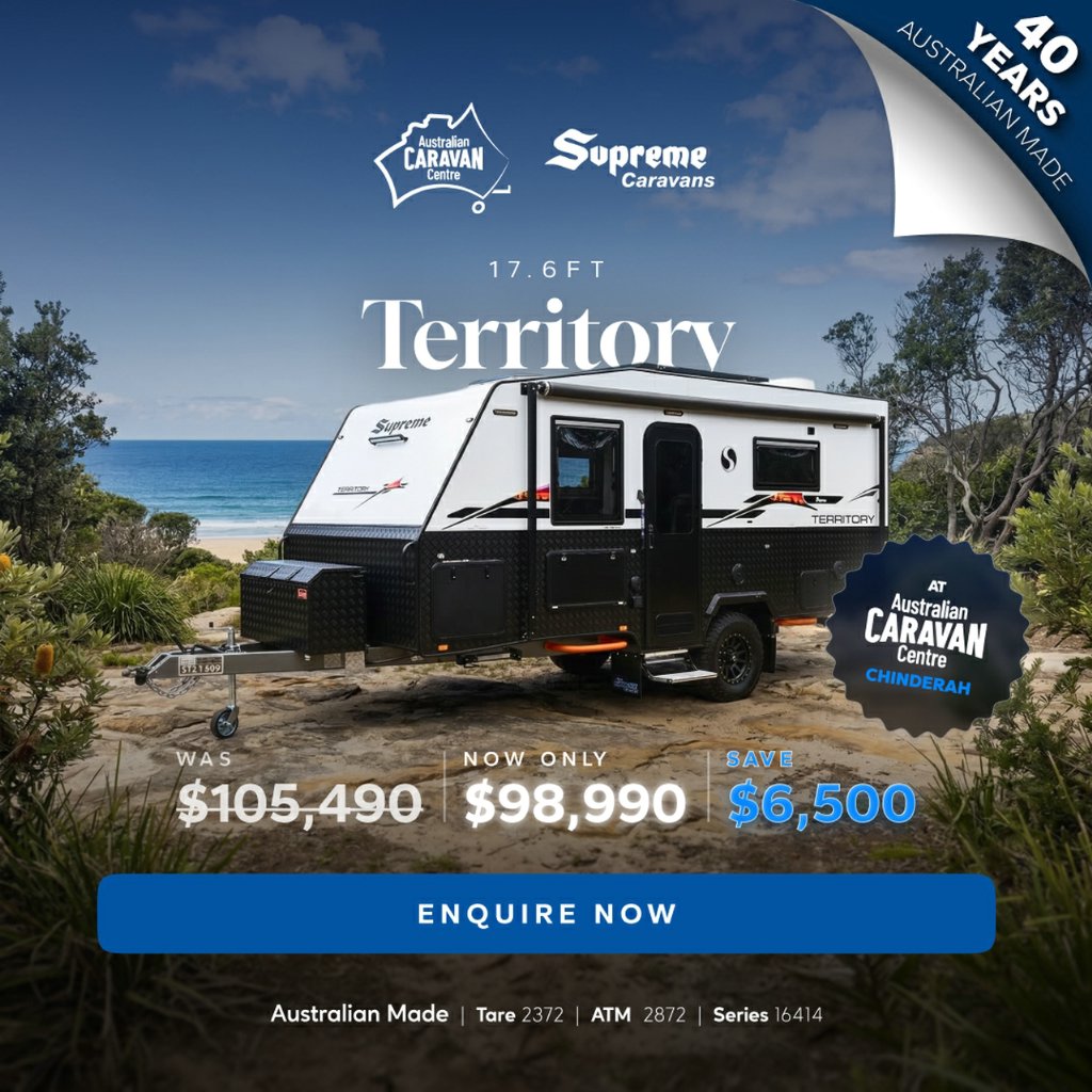 2026 Supreme Territory Full Offroad Couples Van!! 105,490.00 Driveaway!DON'T DELAY CALL NOW - 02 4988 7350Australian Caravan Centre - 14-18 Chinderah Bay Drive, Chinderah 2487Sales Opening hours: Monday to Friday 9am - 5pm Saturday 9am - 4pm Sunday: CLOSEDThis full offroad couples van has all the amenities you would look for in a caravan and more. It is spacious, modern, and luxurious inside and out, perfect for touring in style! The ultra-comfortable home on wheels with supreme quality appliances will give you a unique experience beyond your expectations. Supreme Territory 1760_C_K1E3_S (MY26)Tare: 2372kgATM:2872kgGTM: 26930kgBall: 179kgThis Caravan is loaded with features including:Chillax Electrical Package300amp lithium battery 3000 Watt Redarc Inverter wired to all GPOs and AppliancesRedarc Alpha 50 Battery Management SystemAdditional 210 watt solar panel ( 4 x 210 watt solar panels ini total )120amp grey anderson plug Internal Features:*1 Electric Burner & Grill Convection and Microwave Combo*Ranger Flush Mounted Rangehood*Dometic Compressor (188 Litre) 2 Door Refrigerator*Fusion MS-RA60and 2 upgraded internal speakers*Red Arc Alpha50 Battery Management System With Built In DC2DC Charger and RV display*Lightweight 15mm Ply*Overhead Cupboards*Robes With Bedside Nooks*Lift Up Under Bed Storage*240V/12V Power Points Throughout*Large L Shaped Style Seating with Nuova Mapa Table*Dometic Freshject Pro Roof Mounted Air Conditioner With Remote wired to the inverter*LED Strip Light In Step Well*Dimmable LED Strip Lights Throughout*Full Large Ensuite*Ample Amounts Of Storage*Piano Hinges*Curtains & Pelmets *Instant Hot Water System*2 x 12v Wall Fans*Hidden handles on OHC*3kg wall mounted washing machine wired to the inverterExternal Features:*Roll Out Awning *4" Permagal Australian Steel Chassis*Cruisemaster ATX 3000kg Coil Suspension*12' Brakes, 16" Alloy Wheels* Sheathing to Pipes *1 x Matching Spare Wheel*2" Riser*Scrub Bars*DO-35 Hitch*Recovery Points To Chassis*2 x Water Tanks & Grey Water Tank*Mesh Tray Under A-Frame*2 x 9kg Gas Bottles*300Ah Lithium Battery*4 x 210W Solar Panels* White and orange LED Annexe Lights*Winegard Air 360 LP*LED Light Bar Front & Rear*Picnic Table*Jerry Can Holder*2 x External Speakers*Tunnel Boot*4 Arm Rear Bumper*Pull Out Step*BBQ Gas Point*Reverse Camera*External Shower*External TV Entertainment Hatch*Toolbox With Generator Slide, Stone Guard and 300mm A frame extensionLive your Life, Live your Dream,Live Supreme.2026 Model Supreme Territory Stock Number: 16414NSupport local manufacturing, we are proudly Australian made and owned. With over 39 years' experience in designing & building modern caravans. There's something uniquely Australian about Supreme and Leader caravans.Over 30% of our stock gets sold before making it onto the web... If you have fine-tuned your search & know what you are looking for, we will help you find it quickly, easily & at a good price! We also provide in-depth, personalised handovers to ensure you are safe and comfortable on your next journey.
