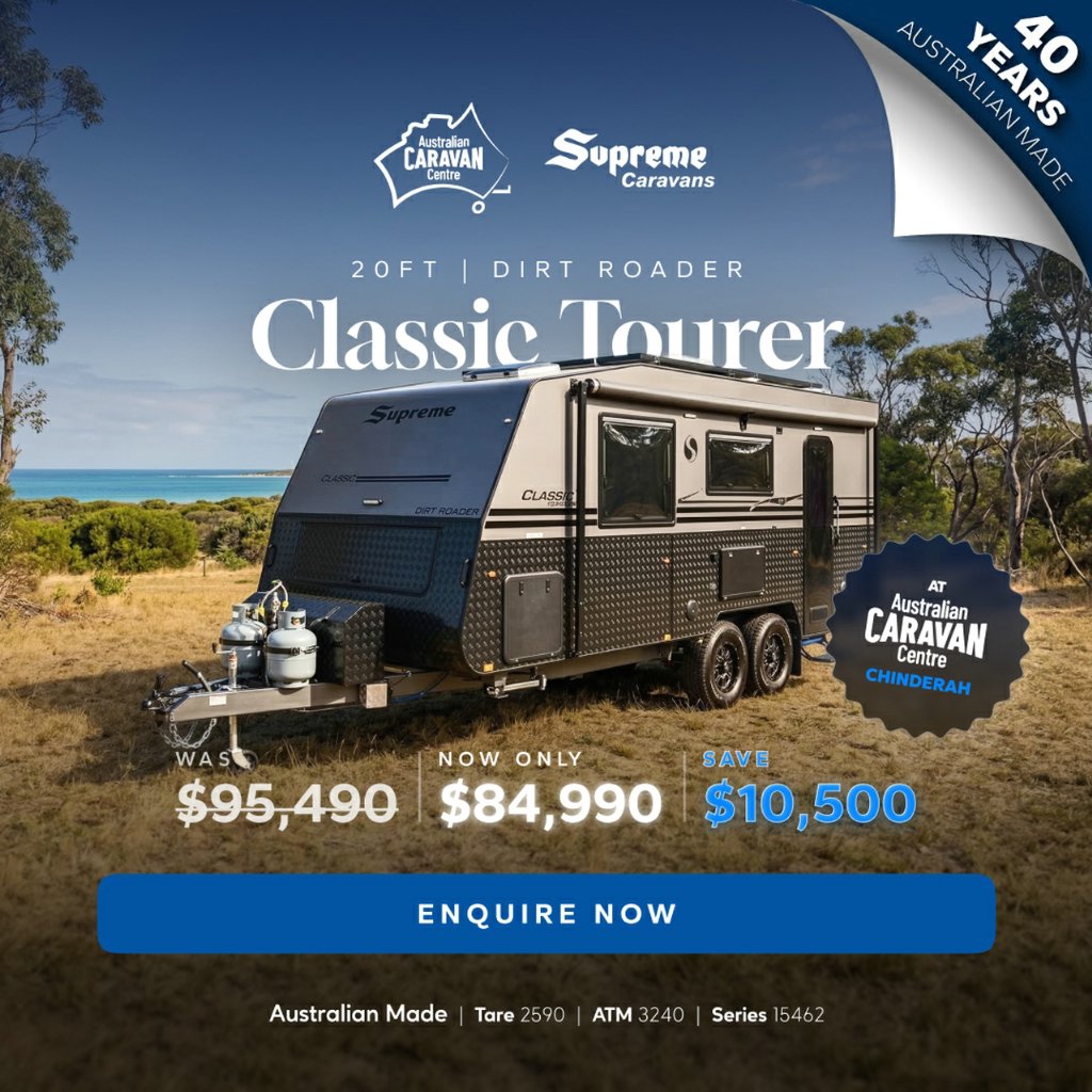 2026 Supreme Classic Tourer couples van with all the modern comforts! 87,490 Driveaway!DON'T DELAY CALL NOW - 02 4988 7300Australian Caravan Centre - 1 Whealan Close, Heatherbrae, NSW 2324Sales Opening hours: Monday to Friday 9am - 5pm Saturday 9am - 4pm Sunday: CLOSEDThis semi-off road couples van has all the amenities you would look for in a caravan and more. It is spacious, modern, and luxurious inside and out, perfect for touring in style! The ultra-comfortable home on wheels with supreme quality appliances will give you a unique experience beyond your expectations.2026 Supreme Classic Tourer (2000_R_K1E1_T)Tare: 2528kgATM: 3178kgGVM: 3030kgBall: 148kgThis Caravan is loaded with features including:Internal features:*Oven, 3 Gas / 1 Electric Burner, Grill, Comvectional & Microwave Combo Unit*Dometic Compressor (180 Litre) 2 Door Refrigerator*Radio/Bluetooth Audio System With 2 x Internal Speakers*Lightweight 15mm Ply*Robes With Bedside Nooks*Lift Up Under Bed Storage*240V/12V Power Points Throughout*L-Shape Lounge and Nuova Mapa table*Roof Mounted Air Conditioner With Remote*LED Strip Light In Step Well*LED Strip Lights Throughout*Full Large Ensuite*Ample Amounts Of Storage*Gold Tapware Package*3KG Top Loader Washing MachineExternal Features:*Roll Out Awning *6" Permagal Australian Steel Chassis*3200KG Roller Rocker Suspension*10' Brakes, 16" Alloy Wheels*1 x Matching Spare Wheel*2 x Water Tanks & Grey Water Tank*Mesh Tray Under A-Frame*2 x 9kg Gas Bottles*1 x 200Ah Lithium Battery*Red Arc Manager 30 Battery Management System With Built In DC2DC Charger*2 x 210W Solar Panels*LED Annexe Lights*Winegard Air 360 LP*Picnic Table*2 x External Speakers*Tunnel Boot *Front Boot*4 Arm Rear Bumper*Pull Out Step*BBQ Gas Point*Reverse CameraLive your Life, Live your Dream,Live Supreme.2026 Model: Supreme Classic TourerStock Number:16899NSupport local manufacturing. We are proudly Australian made and owned with over 39 years' experience in designing & building modern caravans. There's something uniquely Australian about Supreme and Leader caravans.Over 30% of our stock gets sold before making it onto the web... If you have fine-tuned your search & know what you are looking for, we will help you find it quickly, easily & at a good price! We also provide in-depth, personalised handovers to ensure you are safe and comfortable on your next journey.