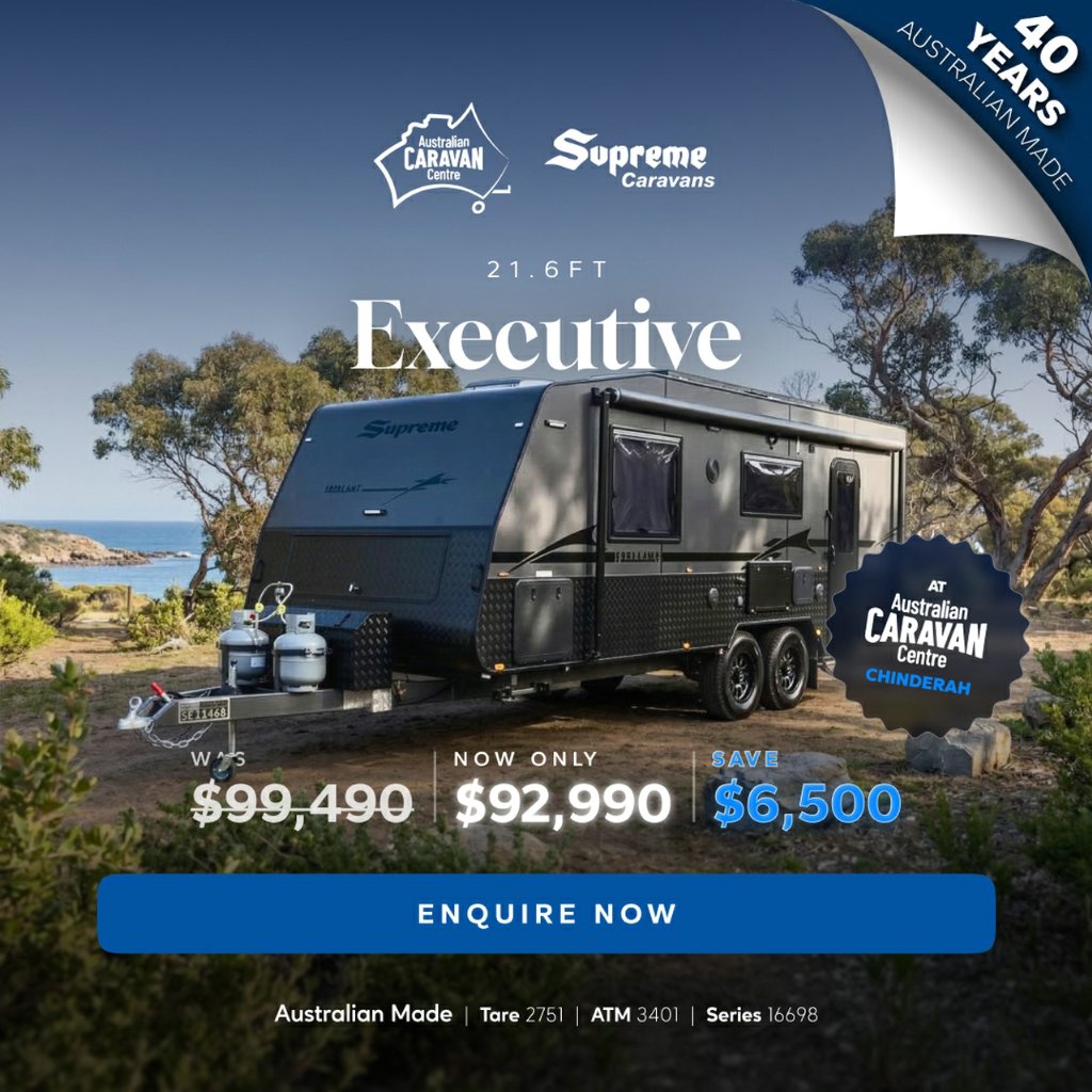 DON'T DELAY CALL NOW - 02) 4988 7350Australian Caravan Centre - 14-18 Chinderah Bay Drive, Chinderah (Tweed Heads) NSW 2487Sales Opening hours: Monday to Friday 9am - 5pm Saturday 9am - 4pm Sunday: ClosedThis semi-off road couples van has all the amenities you would look for in a caravan and more. It is spacious, modern, and luxurious inside and out, perfect for touring in style! The ultra-comfortable home on wheels with supreme quality appliances will give you a unique experience beyond your expectations.2025 Supreme Executive (2160_R_K1E1_T)99,490 Drive Away!!Tare: 2751kgATM: 3401kgGTM: 3210kgBall: 191kgThis Caravan is loaded with features including:Internal features:*Stovetop/ grill 4 in 1 Convection Microwave Combo*Convection & Microwave combo*Dometic RUC6408 180L, 2-door compressor fridge/freezer*Radio/Bluetooth audio system with 2 internal speakers*Lightweight 15mm Ply*Robes With Bedside Nooks*Lift Up Under Bed Storage*240V/12V Power Points Throughout*Large Cafe Lounge Seating with Table*Dometic Freshjet 7 Pro air conditioner with remote*Instant Hot Water System*Camec Compact RV 4kg front loader washing machine*LED Strip Light in Step Well*LED Strip Lights to OHC's *Full Ensuite*Ample amounts of storage*Curtains & Pelmets*2 x 12V Wall Fans*Gold TapwareExternal Features:*6" Permagal Chassis *300mm A-frame Extension*2" Chassis Riser*Roller Rocker 3500kg Suspension*16" Alloy Wheels*12" Brakes *1 x Matching Spare Wheel*Toolbox For Added Storage*2 x Water Tanks & Grey Water Tank *Mesh Tray Under A-Frame*2 x 9kg Gas Bottles*Roll Out Awning*300ah Lithium Battery*Red Arc Manager 30 battery Management System with Built in DC2DC Charger & Redvision Display*2 x 210W Solar Panels*Dimmable LED Annexe Lights*Picnic Table *2 x External Speakers*Winegard Air 360 Antenna*Tunnel Boot*4 Arm Rear Bumper*Aluminium Pull-Out Step*BBQ Gas Point*Reverse Camera*External TV Entertainment Hatch*External ShowerLive your Life, Live your Dream, Live Supreme.2025 Supreme Executive Stock No. 16698NSupport local manufacturing. We are proudly Australian made and owned with over 39 years' experience in designing & building modern caravans. There's something uniquely Australian about Supreme and Leader caravans. Over 30% of our stock gets sold before making it onto the web... If you have fine-tuned your search & know what you are looking for, we will help you find it quickly, easily and at a good price! We also provide in-depth, personalised handovers to ensure you are safe and comfortable on your next journey.