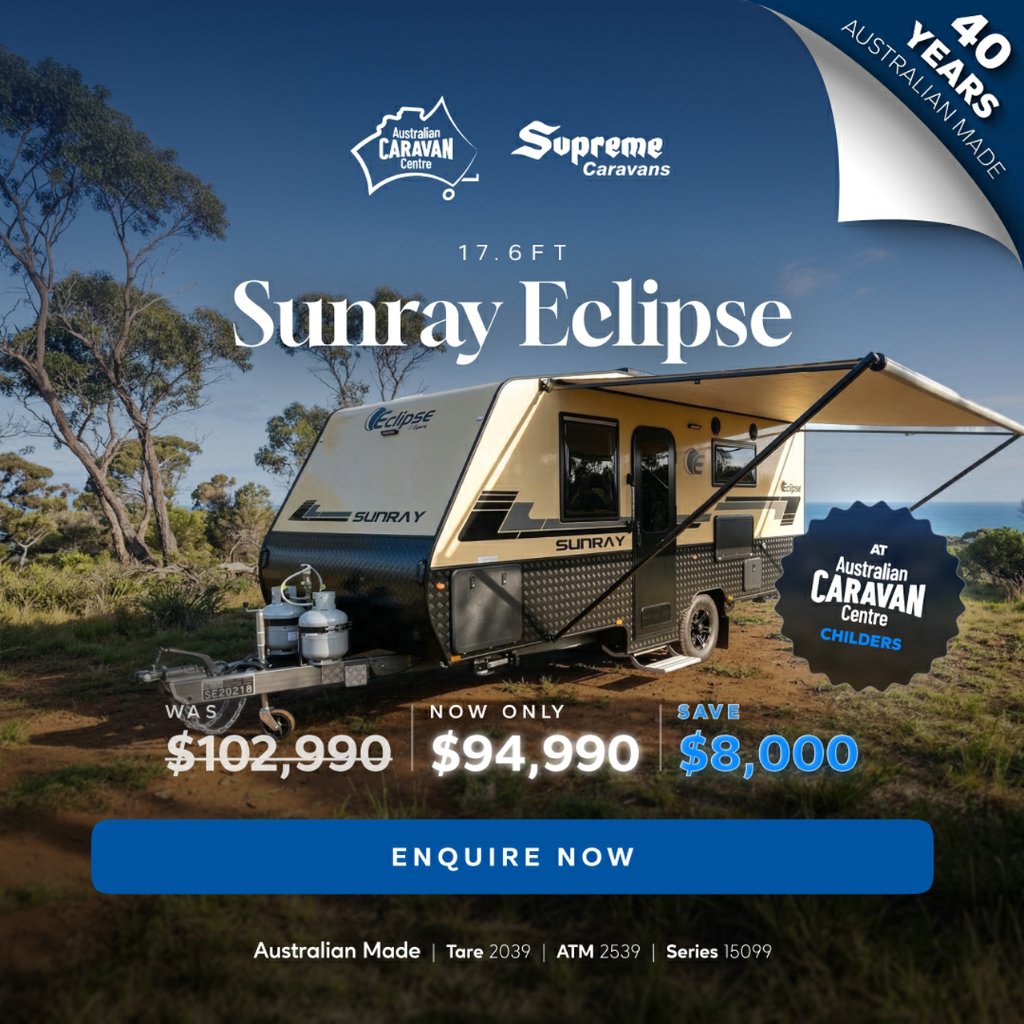 DON'T DELAY CALL NOW - 07 4179 0112Australian Caravan Centre - 25 Black Smith Court Childers, QLD 4660Sales Opening hours: Monday to Friday 830am - 430pm Saturday 9am - 4pm Sunday: CLOSED2025 Supreme Eclipse Sunray couples van with all the modern comforts! 102,990 Driveaway!This semi-off road couples van has all the amenities you would look for in a caravan and more. It is spacious, modern, and luxurious inside and out, perfect for touring in style! The ultra-comfortable home on wheels with supreme quality appliances will give you a unique experience beyond your expectations.2025 Supreme Eclipse Sunray 1760_C_K2E3_S Tare: 2039kgATM: 2539kgGVM: 2232kgBall: 216kgExt Colour: Sandy fibreglassInt Colour: Opal lightThis Caravan is loaded with features including:Internal features:*Dometic Compressor (180 Litre) 2 Door Refrigerator*Radio/Bluetooth Audio System with 2 x Internal Speakers*Sandy Fibreglass Sandwich Panel (29mm thick)*Lift Up Under Bed Storage*240V/12V Power Points Throughout*Large L shaped Style Seating with Nuova Mapa Table*Roof Mounted Dometic fresh jet 7 Air Conditioner with Remote*LED Strip Light in Step Well *LED Strip Lights Throughout*Full large Ensuite*Ample Amounts of StorageExternal features:*Roll Out Awning*6" Permagal Australian Steel Chassis*Torsion bar suspension 2700kg*12' Brakes, 15" Alloy Wheels*1 x Matching Spare Wheel*2 x Water Tanks & Grey Water Tank*2 x 9kg Gas Bottles*Chillax electrical package includes 300ah lithium battery, 3 x 210W Solar Panels, 3000w redarc inverter and Red Arc Alpha 75 Battery Management System with Built In DC2DC Charger*Dimmable LED Annexe Lights*Picnic Table*2 x External Speakers*Tunnel Boot*2 Arm Rear Bumper*Pull Out Step*BBQ Gas Point*Cruisemaster Do35 hitch*2 x 12v wall fans*Reverse Camera Live your Life,Live your Dream, Live Supreme.2025 Model: Eclipse SunrayStock Number: 15372N\Support local manufacturing, we are proudly Australian made and owned. With over 40 years' experience in designing & building modern caravans. There's something uniquely Australian about Supreme and Leader caravans.Over 30% of our stock gets sold before making it onto the web... If you have fine-tuned your search & know what you are looking for, we will help you find it quickly, easily & at a good price! We also provide in-depth, personalised handovers to ensure you are safe and comfortable on your next journey.