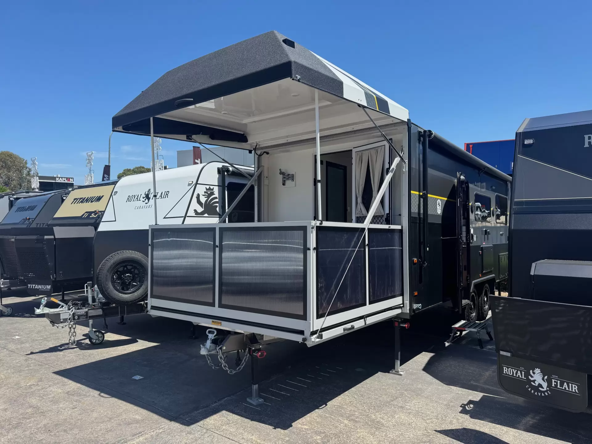 Royal Flair has been an independent family-owned business since 1975, striving on craftsmanship and innovation in premium caravans, blending luxury, durability and adventure into all their models. With RVMAP accreditation and built in Victoria, their award-winning caravans have made them a house-hold name, with the industry’s best values, craftsmanship, innovation and genuine family pride into every caravan that leaves their factory.The Piazza range is redefining the touring range, designed for couples who value space, comfort and relaxed living while they explore our vast country. Known for its signature extension deck, this blends indoor living and outdoor leisure into one van. Touring is made effortless with the space to breathe and relax.The Piazza 18’6-1 compacts all your necessities into an 18ft home on wheels, with a club lounge to relax and enjoy, and when your day of adventures comes to a close for the day, your drop-down electric bed takes over, allowing you to enjoy both amenities without compromising space. With the deck folding out to allow a comfortable outdoor space, this van is ready to be enjoyed anywhere around Australia.The Piazza 18’6-1 comes with the following features:•Lightweight Supagal Chassis•Torflex Independent Suspension with 12” Electric Brakes•50mm Ball Coupling•BMPro Sway Control•Underslung Spare Wheel•16” Rims & All Terrain Tyres•Honeycomb Composite Flooring•Aluminium Composite Panel Back & Sides•Pressure Hatch•Full Insulation•Galvanised Tunnel Boot•Triple Lock Main Door•Double Glazed Windows•Dual Reverse Camera•Picnic Table with Light•Café Screen on Front Deck•BMPro BMS with Odyssey Digital Monitoring System•2x 120amp Lithium Batteries•2x 200w Solar Panels with Regulator•208L 3-Way Fridge•Swift Gas / Electric HWS•External Speakers•Cowfish Gen2 ‘Vantenna’ for TV / Radio•24” Smart TV•Wifi•Dometic FreshJet 7 Series Pro Air Conditioner•23L Flatbed Microwave•Pillowtop Mattress•Soft Close Drawers•Telescopic Table•Leatherette Upholstery•Electrical Drop-Down Bed•BBQ Slide-Out with Gas Bayonet•Top Loader Washing Machine•Cassette Toilet•Water Filter with 3-Way Mixer Tap•2x 95L Fresh Water Tanks with Stone Guard•Mini Grill with Gas / Electric Cooktop•2x 9kg Gas BottlesTo learn more about this caravan, please enquire with us and one of our trusted sales technicians will be happy to assist with any enquiries you may have.All possible attempts have been made to ensure the above information is accurate and correct, however, the accuracy cannot be guaranteed. Please make sure you confirm all item details/features with the seller before you decide. Prices quoted may not include Fees & Charges that may be due on this item. Listed features are available on most items. Contact the selling Dealer for specific details & weights.