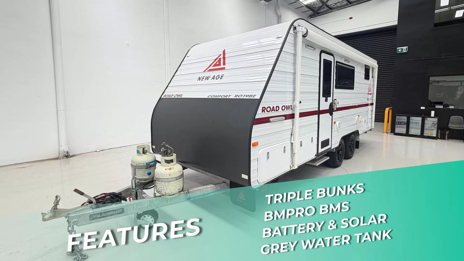 FAMILY TOURER, SLEEPS FIVE - READY TO GO!The 2021 New Age Road Owl RO19BR Comfort is a well-laid-out family caravan designed to make travelling with kids easy and comfortable, featuring triple bunks with a privacy curtain, a massive club lounge, and a concertina door to the toilet for added convenience. Riding on Rocker Roller suspension and supported by a BMPRO battery management system with a battery and solar panel, plus a fresh water tank, it’s ideal for relaxed touring, while inclusions like the Thetford four-burner mini grill, 170L fridge/freezer, NCE microwave, and Gree air-conditioner round out a practical, family-friendly package — enquire today to secure this popular family layout before it’s gone.KEY FEATURESBMPRO Battery Management SystemOne BatteryOne Solar Panel1 X Fresh Water Tank1 X Grey Water TankRocker Roller SuspensionTriple BunksMassive Club LoungeThetford Four Burner Mini GrillThetford 170l Fridge FreezerGree Air-ConditionerNce MicrowaveCurtain To Bunk RoomConstantina Door To ToiletFULL LIST OF FEATURES****Outside****Bmpro Battery Management SystemOne BatteryOne Solar Panel1 X Fresh Water Tank1 X Grey Water TankRocker Roller SuspensionFull Awning235/70 5r 15 Tyres2 X 9kg Gas BottlesWater Tap On A Frame3 X Awning Lights2 X External Speakers ****Inside****Triple BunksMassive Club LoungeThetford Four Burner Mini GrillThetford 170l Fridge FreezerGree Air-ConditionerNce MicrowaveCurtain To Bunk RoomConstantina Door To Toilet24 Inch TvLarge Roof HatchReading Light In All Bunks And Over Main BedThetford Cassette ToiletInternal Fusion SpeakersTare: 2180KGATM: 2730KGBALL: 120KGInternal Size: 19FT External Size: 19FTExplore our latest caravan models, now available with financing options. We accept trade-ins and offer consignment services. Additionally, we provide servicing, maintenance, and a wide range of accessories.Our Hours:Monday to Friday: 9:00 am - 5:00 pmSaturday: 9:00 am - 3:00 pmPlease note that we are closed on public holidaysABOUT USStep into a new age of travel with our exceptional caravan selection, where urban sophistication meets the sunseeker's delight. As you journey through uncharted landscapes, our caravans redefine what's possible. From family getaways to off-road escapes, our models offer a retreat from the ordinary. Picture yourself as a true Lotus, blossoming amidst diverse terrains with grace and elegance, whether you're conquering tough landscapes or setting up bunks for a cozy night's sleep.Our caravans are crafted with a supreme level of design and care, standing as masterpieces ready to withstand the test of time, the rugged outdoors, and the discerning eye of design enthusiasts. Just like a Snowy River carving its path, our caravans navigate through challenges effortlessly, making you a Patriot of exploration. With features like 4x4 capability, ensuite facilities, and inbuilt toilets, you have the freedom to embrace the off-road journey fully.Imagine being on the move through beautiful landscapes, unwinding in a club lounge after a day of adventure, or taking a refreshing shower amidst nature's bounty. Whether you're setting off on an off-road adventure or enjoying a night in a cozy bunk setup, our caravans are designed to offer maximum comfort and convenience. So go ahead, embrace the off-road freedom, and set out on a semi off-road journey where you become the hero of your own story.From the urban jungle to the untouched wilderness, let our caravans be your Atlas. This is your caravan – your titanium haven in an ever-changing world, designed to thrive in both urban environments and off-road adventures. Embody the spirit of a true crusader as you discover unforgettable experiences with Royal Flair – the essential companion for your journey, linking you to a vast network of possibilities, including the Great Aussie spirit that fuels your wonderland.We're not just limited to our own brand. We proudly trade in a number of reputable brands, including Jayco Lotus JB Caravans Avan Kedron and NextGen ensuring you have a diverse range to choose from to suit your caravaning needs. We also have many different vans with a range of features and layout options, including ensuite, 4x4, toilets, showers, off road options, single beds, bunks, 4WD, and a Club lounge!