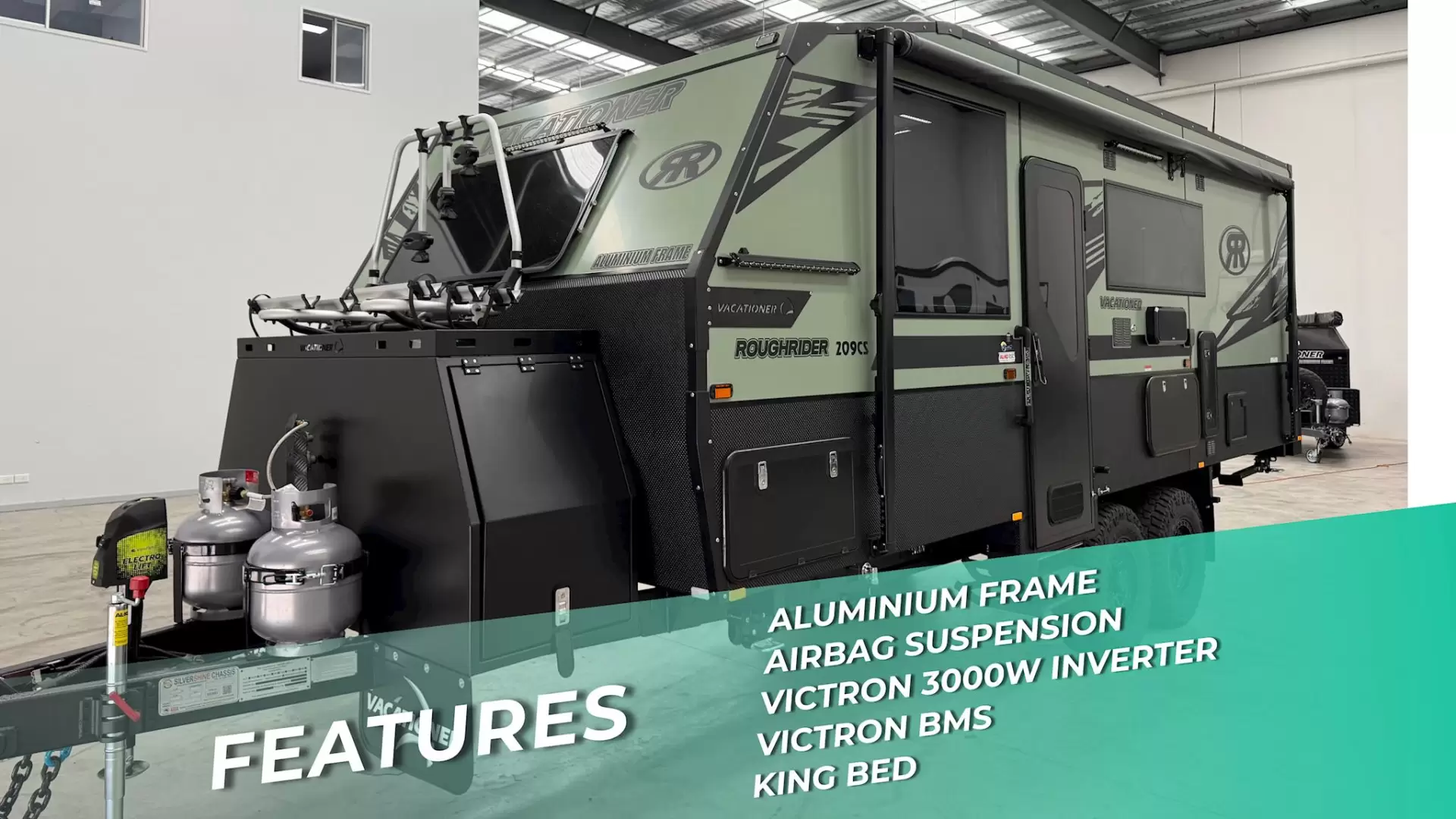 USED ONECE!! FULL OFF-ROAD ALUMINIUM FRAME CARAVAN WITH AIRBAGS AND VICTRON OFF GRID POWER SYSTEM!209 FT KING BED WITH BUNKS LAYOUT - FULL OFF-ROAD AND OFF GRID Introducing the Rough Rider: your ultimate off-road companion, featuring ALKO Enduro-X Air Ride suspension (AIR BAGS) and a robust aluminium frame for enduring strength. Equipped with a cutting-edge Victron 12V battery management system and 800W solar panels, it delivers all the power you need for off-grid comfort, including running your air conditioner.KEY FEATURESALKO ENDURO-X MANUAL PREMIUM AIR RIDEAIR BAG SUSPENSION ALUMINIUM FRAMEONE PIECE WATERPROOF INTERNAL WALLS AND ROOFONE PIECE EXTERNAL FIBREGLASS ROOFONE PIECE HONEYCOMB FLOORROUGH RIDER 12V VICTRON BATTERY MANAGEMENT SYSTEMMULTIPLUS II 3000W-120A INVERTER-CHARGER300AH HIGH DISCHARGE LITHIUM BATTERYVICTRON DC-DC CHARGER4 X 200 WATT SOLAR PANELS (800W)MINI X-GEN FRONT BOX WITH VACATIONER MUDFLAPSREAR WOODBOX WITH LID & 2 X JERRY CAN HOLDERS12V DUST SUPRESSION SYSTEMVACATIONER X-CAPPINGVACATIONER EXCLUSIVE ENGINEERED TRUSS CHASSISRAPTOR PAINT TO CHASSISALKO ESC (ELECTRONIC STABILLITY CONTROL)2 X 95L MAIN WATER TANKS110L GREY WATER TANK270L COMPRESSOR FRIDGESWIFT INDUCTION EW COVECTION AIRFRYER COMBOMICKEY THOMPSON BAJA BOSS AT TYRES (265/75R16)RECESSED DO-45COUPLING4 X BAR LIGHTSPLUS MUCH MORETHIS VAN HAS BEEN UPGRADE WITHTRIPLE BUNKSWALL MOUNT WASHING MACHINE UPGRADE DIESEL HEATER Introducing the Rough Rider – a rugged and versatile caravan built to conquer any terrain with ease. Designed with a durable aluminium frame, ALKO Enduro-X Premium Air Ride suspension, and tough Mickey Thompson Baja Boss AT tyres, this caravan provides the confidence to explore the most challenging landscapes. Its engineered truss chassis with Raptor paint ensures it withstands the harshest conditions.Experience the freedom of off-grid living with the Rough Rider's advanced power system. It features a 300AH high-discharge lithium battery, a Victron MultiPlus II 3000W-120A inverter-charger, 4 x 200W solar panels (800W total), a Victron DC-DC charger, and a 12V dust suppression system to keep you powered in comfort. You can even run your air conditioner directly from the batteries, providing convenience without sacrificing comfort.Crafted with precision and quality, the Rough Rider boasts a lightweight yet robust aluminium frame, ensuring durability and agility. The one-piece waterproof internal walls and roof, along with the external fibreglass roof and honeycomb floor, deliver structural integrity and a resilient living space. The Rough Rider elevates your off-road adventures with unmatched comfort and reliability.FULL LIST OF FEATURES:***CHASSIS***ALKO ENDURO-X MANUAL PREMIUM AIR RIDEAIR BAG SUSPENSION VACATIONER EXCLUSIVE ENGINEERED TRUSS CHASSISRAPTOR PAINT TO CHASSISONE PIECE HONEYCOMB FLOORREAR WOODBOX WITH LID & 2 X JERRY CAN HOLDERS6" A-FRAME 5MM THICKRECESSED DO-45 COUPLINGRATED CHAINS WITH HAMMER LOCKS BRACKETS12V ELECTRO JACK-JOCKEY WHEEL12" BRAKES16" WRATH RIMSMICKEY THOMPSON BAJA BOSS AT TYRES (265/75R16)4-ARM STRAIGHT OFF-ROAD REAR BARCHECKERPLATE WATER TANK GUARDSCHECKERPLATE GREY WATER TANK COVERDROP DOWN LEGS*** ELECTRICAL***ROUGH RIDER 12V VICTRON BATTERY MANAGEMENT SYSTEMMULTIPLUS II 3000W-120A INVERTER-CHARGER300AH HIGH DISCHARGE LITHIUM BATTERYVICTRON DC-DC CHARGER4 X 200 WATT SOLAR PANELS (800W)ALKO ESC (ELECTRONIC STABILLITY CONTROL)STARLINK PROVISIONFUSION SOUND PANELLIGHT, 12V USB/USBC, DOUBLE 240V P/POINTS IN BEDROOMLIGHT, 12V USB/USBC, DOUBLE 240V P/POINTS AT SEATING AREABAR LIGHT WHITE/AMBER LIGHTS FRONT AND BACKBAR LIGHT WHITE/AMBER ROADSIDEBAR LIGHT WHITE/AMBER DOORSIDEBAR LIGHT WHITE/AMBER ABOVE TUNNELBOOT DOORSIDE12V FAN AT BEDROOM12V FAN AT LOUNGE12V FAN AT EACH BUNK – (IF APPLICABLE) SAFETY DAVE REAR VIEW CAMERA WITH 7" CAR MONITORANDERSON PLUG ROADSIDE FOR PORTABLE SOLARLED STRIP LIGHT AROUND STEPWELLWINEGARD SENSAR HV TV ANTENNA***PLUMBING***2 X 95L MAIN WATER TANKS110L GREY WATER TANKGREY WATER BYPASS12V PUMPBRASS MANIFOLD SYSTEMEXTERNAL SHOWER2 X 9KG GAS BOTTLESGAS BAYONET3 WAY SINK MIXER TAP WITH BUILT IN WATER FILTER OUTLETTHETFORD CERAMIC TOILET***EXTERIOR***MINI X-GEN FRONT BOX WITH VACATIONER MUDFLAPSONE PIECE EXTERNAL FIBREGLASS ROOFVACATIONER X-CAPPING12V DUST SUPRESSION SYSTEMLED SKYLIGHT IN ROOFELECTRIC EUROFLEK BLACK LED PULLOUT STEPPICNIC TABLE, KEYLESS WITH LED LIGHTSAIL TRACK ROADSIDELED ROLL OUT AWNINGEUROFLEK LED HATCH OVER SHOWER & TOILETEUROFLEK FLAT BLIND WINDOWSMOULDED STEPWELL WITH LEDACCESS HATCH UNDER BED ROADSIDE CS LAYOUTS ONLY)ACCESS UNDER LOUNGE (CS LAYOUTS ONLY)FRONT WINDOW AND SHADE (CS LAYOUTS ONLY)BIKE CARRIER TO TOOLBOX (BUNK LAYOUTS ONLY)DOUBLE BLACK LED PULL OUT STEP***INSIDE***ALUMINIUM FRAMEONE PIECE WATERPROOF INTERNAL WALLS AND ROOFTITUS TECFORM METAL SIDED SOFT CLOSE DRAWER RUNNERSWATERFALL SQUARE EDGE BENCHTOPSMOOD LIGHTING ABOVE OVER HEAD CUPBOARDSLUXURY SOFT FURNISHINGS WITH A DISTINCT HIGH-END FEELPREMIUM PILLOW TOP INNERSPRING MATTRESSLUXURY VINYL FLOORING WITH FELT UNDERLAYPREMIUM SPLASHBACKSBLACK SINK, VANITY BASIN, TAPWARE & BATHROOM ACCESSORIESROBE CUTOUTSLARGE SHOWER WITH MIRRORED DOORFRAMELESS ENSUITE MIRROR WITH BACKLIT LEDSLIDING DOOR TO ENSUITE ***APPLIANCES***GREE 3.5KW INVERTER AIRCONFUSION MARINE AUDIO ENTERTAINMENT270L COMPRESSOR FRIDGESWIFT INDUCTION EW COVECTION AIRFRYER COMBOSWIFT 12V RANGEHOOD24" LED SMART TV INTERNALEXTERNAL ENTERTAINMENT HATCHFUSION EXTERNAL STEREO PANELTare: 2969 KGATM: 4318 KGBALL: 218 KGInternal Size: 20.9 FT External Size: 20.9 FTExplore our latest caravan models, now available with financing options. We accept trade-ins and offer consignment services. Additionally, we provide servicing, maintenance, and a wide range of accessories.Our Hours:Monday to Friday: 9:00 am - 5:00 pmSaturday: 9:00 am - 3:00 pmPlease note that we are closed on public holidaysABOUT USStep into a new age of travel with our exceptional caravan selection, where urban sophistication meets the sunseeker