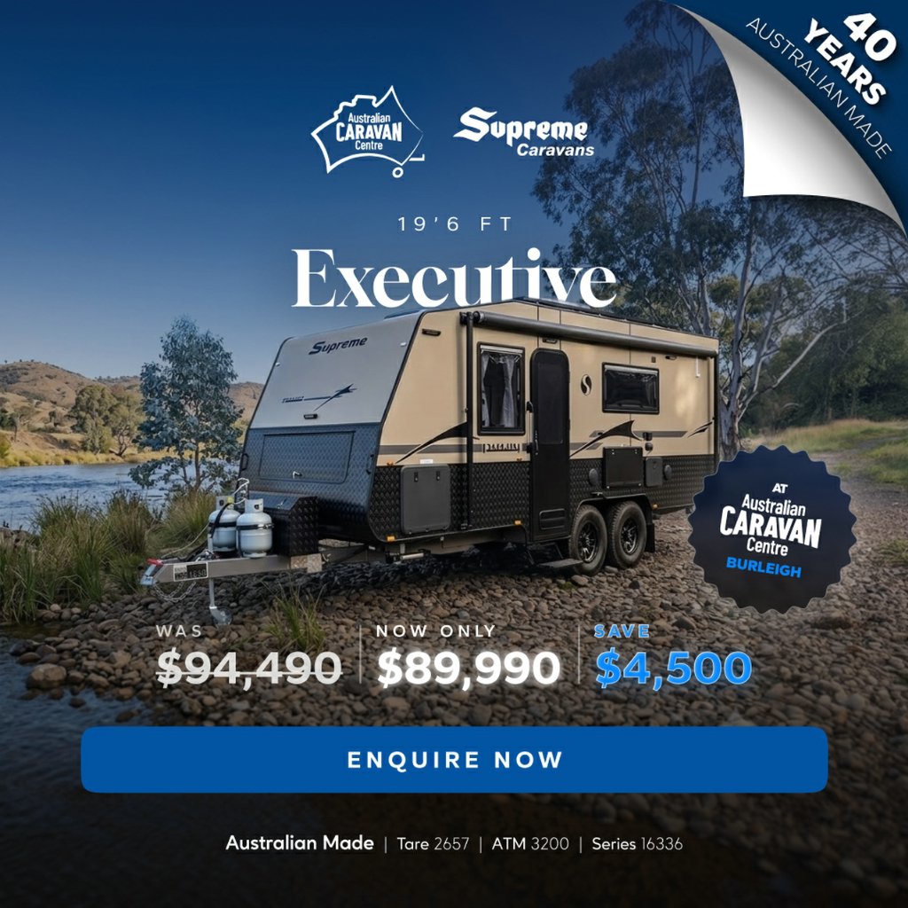 2025 Supreme Executive couples van with Loads of Space and Storage! 94,490 Driveaway! DON'T DELAY CALL NOW - 07 5507 6500Australian Caravan Centre -2 Junction Road Burleigh Heads 4220Sales Opening hours: Monday to Friday 9am - 5pm Saturday 9am - 4pm Sunday: CLOSEDThis semi-off road couples van has all the amenities you would look for in a caravan and more. It is spacious, modern, and luxurious inside and out, perfect for touring in style! The ultra-comfortable home on wheels with supreme quality appliances will give you a unique experience beyond your expectations.2025 Supreme Executive (1960_C_K1E2_T) Tare: 2657kgATM: 3200kgGVM: 3014kgBall: 191kgThis Caravan is loaded with features including:Internal features:*Oven, 3 Gas / 1 Electric Burner & Grill*Microwave*Dometic RUC6408x (180 Litre) 2 Door Refrigerator*Radio/Bluetooth Audio System With 2 x Internal Speakers*Lightweight 15mm Ply*Robes With Bedside Nooks *Lift Up Under Bed Storage *240V/12V Power Points Throughout*Café Lounge*Roof Mounted Air Conditioner With Remote*LED Strip Light In Step Well*Dimmable LED Strip Lights Throughout*Full Large Ensuite*Ample Amounts Of Storage*Curtains & Pelmets*Gold Tapware Package*Feature kitchen with waterfall benchtops*Instant Hot Water System*2 x Wall Mount FansExternal Features:*Roll Out Awning *6" Permagal Australian Steel Chassis*3200KG Roller Rocker Suspension*10' Brakes, 16" Alloy wheels*1 x Matching Spare Wheel*2" Riser*2 x Water Tanks & Grey Water Tank*Mesh Tray Under A-Frame*2 x 9kg Gas Bottles*200ah lithium battery*Red Arc Manager 30 Battery Management System With Built In DC2DC Charger and RV display*2 x 210W Solar Panels*Dimmable LED Annexe Lights*Picnic Table*Toolbox*2 x External Speakers*Cowfish Vantenna*External Shower*Tunnel Boot *Front Boot*4 Arm Rear Bumper*Pull Out Step*BBQ Gas Point*Reverse Camera*External TV Entertainment HatchLive your Life, Live your Dream,Live Supreme.2025 Model: Supreme ExecutiveStock Number: 16336NSupport local manufacturing. We are proudly Australian made and owned with over 39 years experience in designing & building modern caravans. There's something uniquely Australian about Supreme and Leader caravans.Over 30% of our stock gets sold before making it onto the web... If you have fine-tuned your search & know what you are looking for, we will help you find it quickly, easily & at a good price! We also provide in-depth, personalised handovers to ensure you are safe and comfortable on your next journey.