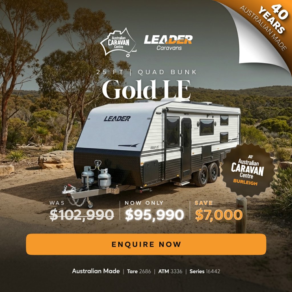 Australian Caravan Centre - 2 Junction Rd, Burleigh Heads 4220Sales Opening hours: Monday to Friday 9am - 5pm Saturday 9am - 4pm Sunday: CLOSED07 5507 6500102,990 Drive-away!This semi-off road model van has all the amenities you would look for in a caravan and more. It is spacious, modern, and luxurious inside and out, perfect for touring in style! The ultra-comfortable home on wheels with supreme quality appliances will give you a unique experience beyond your expectations.LEADER GOLD LE QUAD BUNK FAMILY VANTare: 2686kgATM: 3336kgGTM: 3129kgBall: 166kgThis Caravan is loaded with features including:Includes:-Gold Tapware Bundle-6x Wall Fans-3kg Top Loader Washing Machine -Hidden HandlesInternal features:*Stove Top 3 gas / 1 electric burner and grill*Convection & Microwave Combo*Dometic (188 Litre) 2 door Refrigerator Compressor Fridge*Radio/Bluetooth system with 2 internal speakers*Lightweight 15mm ply with beautiful gloss finish interior*Robes with bedside nooks*Lift up under bed storage*240V/12V power points throughout*Large L-shape seating*Roof mounted air conditioner with remote*LED lights inc strip light in step well*Full en-suite*Ample amounts of storage*Ranger Flush Mount Rangehood*Piano HingesExternal features:*Roll out Awning*6" Permagal Australian steel chassis*Roller Rocker Suspension 3500kg*12" brakes*Alloy rims & tyres*1 x spare wheel*2 x95l Water tanks 1x95l Grey water tank*Mesh tray under A-Frame*2 x 9kg gas bottles*200A/h Lithium battery on chassis*Red Arc Manager 30 battery management system within built DC2DC charger*2 x 210w solar panels*4 LED annexe Lights*Picnic table*2 external speakers*External Shower*Tunnel boot*4 arm rear bumper*Pull out step*BBQ gas point*Reverse cameraBe the Leader of the pack.Support local manufacturing. We are proudly Australian made and owned with over 39 years experience in designing & building modern caravans. There's something uniquely Australian about Supreme and Leader caravans.Over 30% of our stock gets sold before making it onto the web... If you have fine-tuned your search & know what you are looking for, we will help you find it quickly, easily & at a good price! We also provide in-depth, personalised handovers to ensure you are safe and comfortable on your next journey.