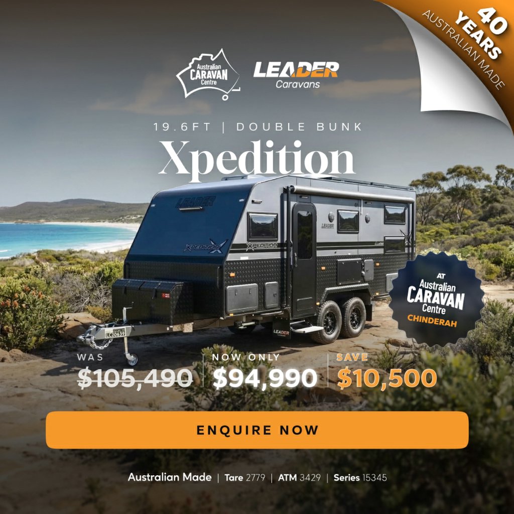 DON'T DELAY CALL NOW - 02 4988 7350Australian Caravan Centre - 14-18 Chinderah Bay Drive, ChinderahSales Opening hours: Monday to Friday 9am - 5pm Saturday 9am - 4pm Sunday: CLOSEDThis off-road Family van has all the amenities you would look for in a caravan and more. It is spacious, modern, and luxurious inside and out, perfect for touring in style! The ultra-comfortable home on wheels with supreme quality appliances will give you a unique experience beyond your expectations.2026 Leader Xpedition (1960_C_K1E10B_T)105,990 Drive Away!!Tare: 2779kgATM: 3429kgGVM: 3315kgBall: 114kgThis Caravan is loaded with features including:Internal Features:* Stovetop, 3 gas / 1 electric burner and grill*Convection & Microwave combo*Dometic RUC6408 180L, 2-door compressor fridge/freezer*Lightweight 15mm Ply with wood finish interior*Robes with Bedside Nooks*Double bunks*Lift Up Under Bed Storage*240V/12V Power Points Throughout*L-shaped lounge*Dometic Freshjet 7 Pro air conditioner with remote*Instant hot water*LED Strip Light in Step Well*LED Strip Lights to OHCs*Full Ensuite*Ample Amounts of Storage*Curtains & Pelmets*Piano Hinges*Ranger RSL skylight*Hidden handles to OHC's*4 x 12V wall fans*4kg Camec Front Loader Washing MachineExternal features:*Roll Out Awning*6" Permagal chassis*2" Chassis Riser*300mm a-frame extension w/ stone guard*TB7G Toolbox w/ generator slide*Cruisemaster XT 3700kg suspension*12" Brakes*RKC Ammo 16" Alloy Wheels*1 x Matching Spare Wheel*Scrub Bars*Recovery Points to Chassis*2 x Water Tanks & Grey water tanks*Mesh Tray Under A-Frame*2 x 9kg Gas Bottles*800mm high checker plate*300ah Lithium Battery*3000W Redarc ATS inverter wired to all GPOs & appliances*4 x 210W Solar Panels*Redarc Alpha 50 BMS with Redvision Display and built in DC2DC Charger*LED Annexe Lights*LED Light Bar Front & Rear*Jerry can holder*Picnic Table*2 x External Speakers* Winegard Air 360 Antenna*Tunnel Boot*4 Arm Rear Bumper*Pull Out Step*BBQ Gas Point*Reverse Camera*External Shower*External TV BoxBe The Leader of the Pack!2026 Leader XpeditionSupport local manufacturing. We are proudly Australian made and owned with over 39 years' experience in designing & building modern caravans. There's something uniquely Australian about Supreme and Leader caravans.Over 30% of our stock gets sold before making it onto the web... If you have fine-tuned your search & know what you are looking for, we will help you find it quickly, easily & at a good price! We also provide in-depth, personalised handovers to ensure you are safe and comfortable on your next journey.