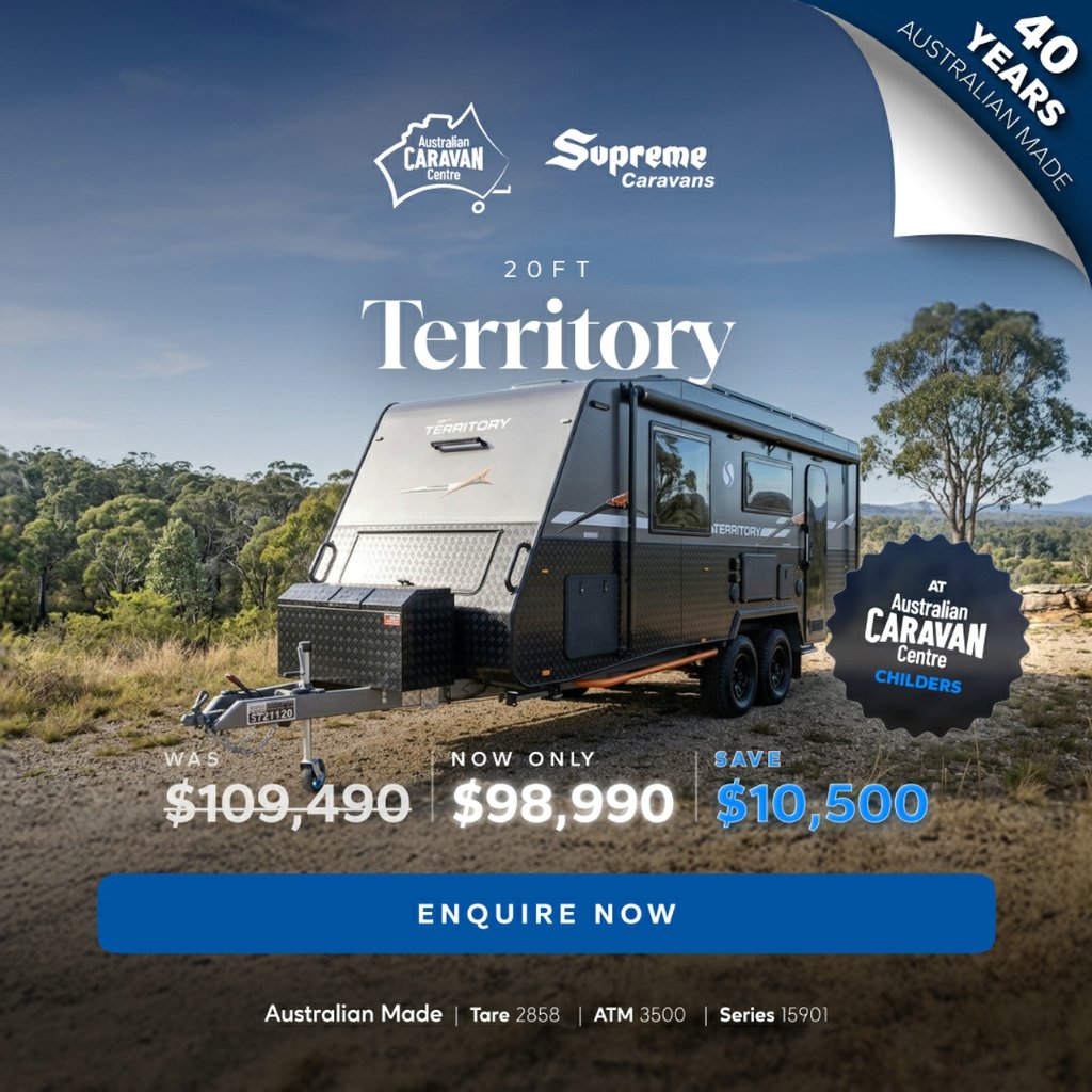 DON'T DELAY CALL NOW - 07 4179 0112Australian Caravan Centre - 25 Blacksmith Court, Childers, QLD 4660Sales Opening hours: Monday to Friday 8:30am - 4:30pm Saturday 9am - 4pm Sunday: ClosedThis full offroad couples van has all the amenities you would look for in a caravan and more. It is spacious, modern, and luxurious inside and out, perfect for touring in style! The ultra-comfortable home on wheels with supreme quality appliances will give you a unique experience beyond your expectations.Supreme Territory 2000_R_K1E8_T109,490.00 Drive Away!Tare: 2858ATM: 3500GTM: 3314Ball: 186Ext Colour: TitaniumInt Colour: Opal lightThis Caravan is loaded with features including:*Chillax package - 3000w RedArc inverter, 4 x 210w Solar Panels and 300Amp Lithium Battery*Hidden Handles*TB7G Toolbox (Includes 300mm A-frame extension)*Wall Fans x 2*Fusion Panel Bluetooth StereoInternal Features:*Oven, 3 gas / 1 Electric Burner & Grill*Microwave*Dometic Compressor (188 Litre) 2 Door Refrigerator*Radio/Bluetooth Audio System With 2 x Internal Speakers*Lightweight 15mm Ply*Overhead Cupboards*Robes With Bedside Nooks*Lift Up Under Bed Storage*240V/12V Power Points Throughout*Large Café Lounge*Roof Mounted Fresh Jet Series 7 Air Conditioner With Remote*LED Strip Light In Step Well*Dimmable LED Strip Lights Throughout*Full Large Ensuite*Ample Amounts Of Storage*Piano Hinges*Curtains & Pelmets*Instant Hot Water System*2 x 12v Wall Fans*3KG Top Loader washerExternal Features:*Roll Out Awning*6" Permagal Australian Steel Chassis*Cruisemaster XT3700kg suspension*12' Brakes, 16" Alloy Wheels*1 x Matching Spare Wheel*2" Riser*Scrub Bars*DO-35 Hitch*Recovery Points To Chassis*2 x Water Tanks & Grey Water Tank*Mesh Tray Under A-Frame*2 x 9kg Gas Bottles*300ah Lithium Battery*4 x 210W Solar Panels*Red Arc Manager 30 Battery Management System With Built In DC2DC Charger and RV display*Dimmable white and orange LED Annexe Lights*Cowfish Vantenna*LED Light Bar Front & Rear*Picnic Table*Jerry Can Holder*Tunnel Boot*4 Arm Rear Bumper*Pull Out Step*BBQ Gas Point*Reverse Camera*External Shower*External TV Entertainment Hatch*Toolbox With Generator Slide, Stone Guard and 300mm A frame extensionLive your Life,Live your Dream,Live Supreme.2025 Model Supreme TerritoryStock Number 15901NSupport local manufacturing. We are proudly Australian made and owned with over 40 years' experience in designing & building modern caravans. There's something uniquely Australian about Supreme and Leader caravans.Over 30% of our stock gets sold before making it onto the web... If you have fine-tuned your search & know what you are looking for, we will help you find it quickly, easily & at a good price! We also provide in-depth, personalised handovers to ensure you are safe and comfortable on your next journey.