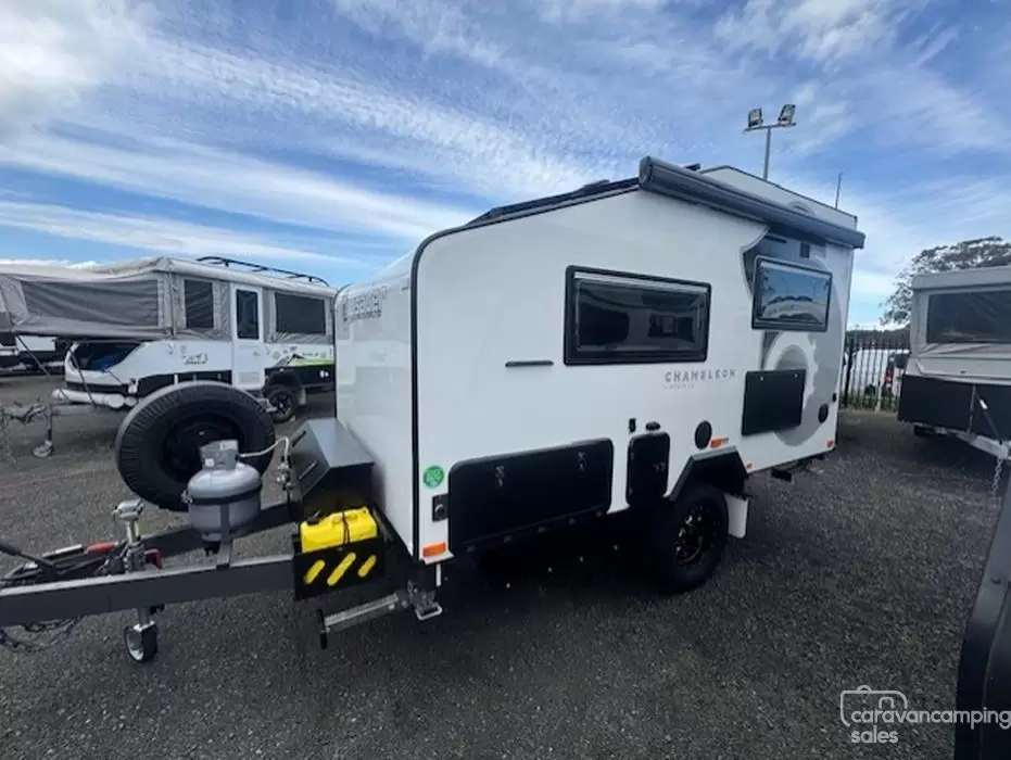 The Chameleon Liberty SV is a rugged yet compact caravan built for adventure. Lightweight, and well-insulated for all weather conditions. The unique rear door provides easy access and extra storage space Tandem/Single Chassis Single Axle Coupling DO35 Brakes 12'' Electric (Drum) Tyres LT 245/75 R16 All-Terrain Spare Wheel & Bracket on A-Frame Gas Cylinders x 2 Drop Leg Each Corner Standard Step Double Pull-Out Jockey Wheel 8" Standard Safety Chain Standard Suspension Independent 2.7T - TuffRide (Coil) A-Frame 150 x 50 (6" x 2") Primal Rush (Black Machine) Rims Shock Absorbers Double Extended A-Frame Double Gas Bottle Slide, BBQ Slide w/Strap Toolbox Located 2 hours East of Melbourne