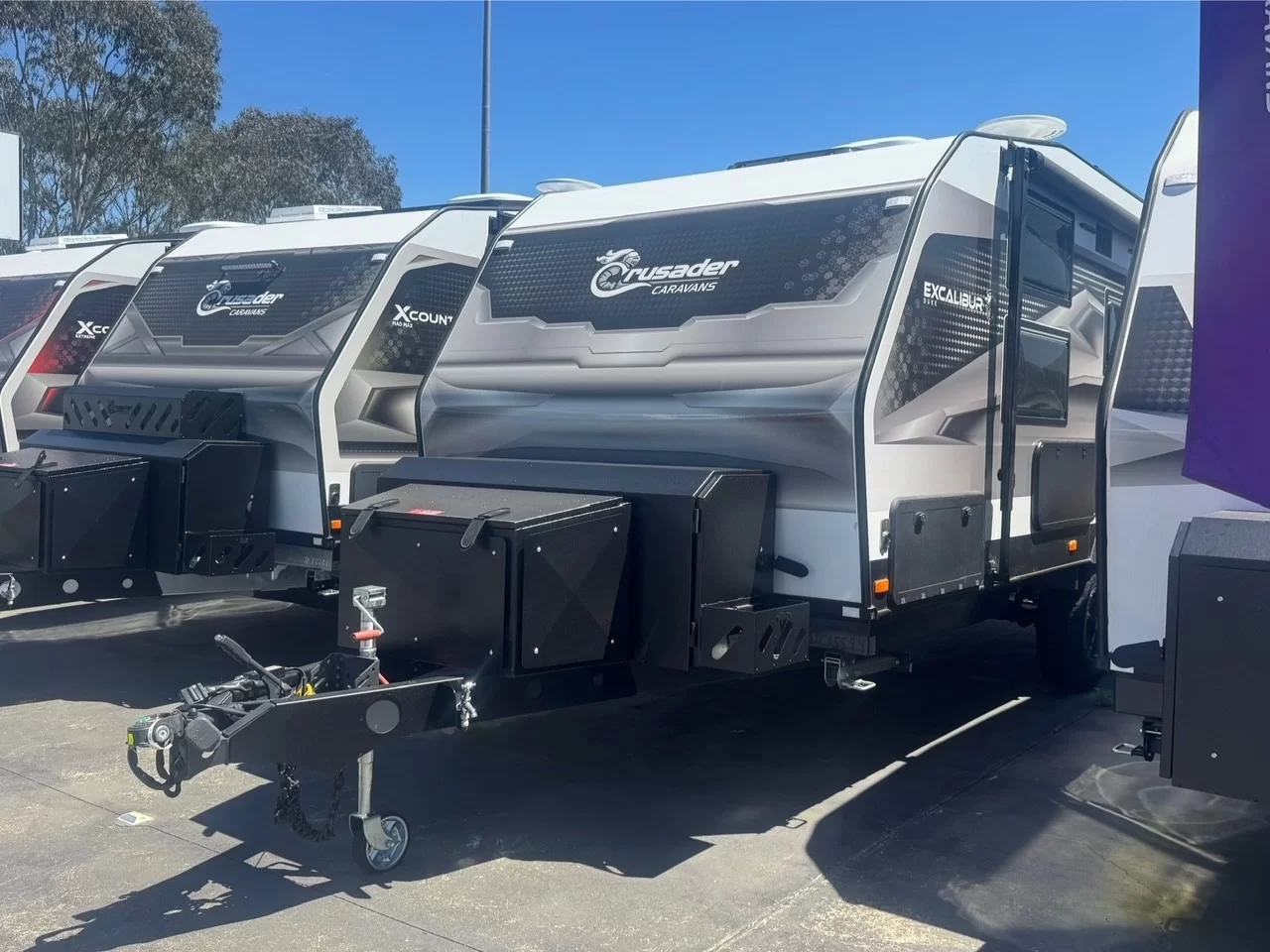 * * * * * * * PRE-EASTER PLATE CLEARANCE SALE * * * * * * * * * * * * NEVER BEEN DONE, AND WILL NEVER BE DONE AGAIN! * * * * ** * * WAS 126,425, NOW 109,990 * * *Crusader Caravans proudly presents the revolutionary 2025 model range. Completely reimagined, this highly anticipated line up offers a perfect blend of innovation, comfort, and durability, whether you are a seasoned traveller or just beginning your caravaning journey. Following the incredible honour of winning Caravan Manufacturer of the Year for the fourth time, Crusader continues to set the standard in the industry. With over 30 unique models, the 2025 range caters to all adventurers, offering a variety of features and price points to suit your needs.The Excalibur range allows you to have Off-Road luxury and enjoy our amazing country in upmost style and comfort. The Excalibur Duke MY25 allows you to enjoy space and solace, while enjoying your thrilling adventures in this 21ft caravan, fitted with an array of standard features, which makes any trip a breeze!The Excalibur Duke MY25 comes standard with the following options:•Full Composite Sides, Roof & Flooring•2x 110L Fresh Water Tanks•1x 110L Grey Water Tank•1x 300a/h Lithium Battery•3x 200w Solar Panels•Victron Electrical System•2000w Victron Inverter•3.7T Independent Coil Suspension with 12″ Brakes•16″ Tyres and Alloy Wheels•1x Spare Wheel and Bracket on Rear Bumper Bar•Tandem Axle•Milenco Power 900L Antenna•Toolbox with Generator Slide, BBQ Slide & 2x Jerry Can Holders•Gas Bottle Box and Armour Plate•Utility Drawer in Tunnel Boot•DO-35 Hitch•Front Tunnel Boot Lined with Checker Plate•Single Electric Step•Double Glazed Windows•2x 9kg Gas Bottles•2x Cabin Fans•27″ Smart TV•OHC LED Mood Lighting•Thetford Topline Induction & Gas Cooktop•Duplex Oven•Kitchen & Ensuite Mixer Tap•Soft Close Drawer Runners•Café Dinette Seating with Sliding Bi-Fold Table•Portable Bluetooth Speaker•Dometic FreshJet 7 Pro Air Conditioner•2x Maxi Roof Hatches in Main Area•274L Thetford Compressor Fridge•Front Loader Washing Machine•23L Flatbed Microwave•Wireless Single Rear View Camera•External TV Hatch•External Shower•Tap on A-Frame•Heavy Duty Jack•Instantaneous Hot Water System•6’4 Innerspring MattressTo learn more about this caravan, please enquire with us and one of our trusted sales technicians will be happy to assist with any enquiries you may have.All possible attempts have been made to ensure the above information is accurate and correct, however, the accuracy cannot be guaranteed. Please make sure you confirm all item details/features with the seller before you decide. Prices quoted may not include Fees & Charges that may be due on this item. Listed features are available on most items. Contact the selling Dealer for specific details & weights.