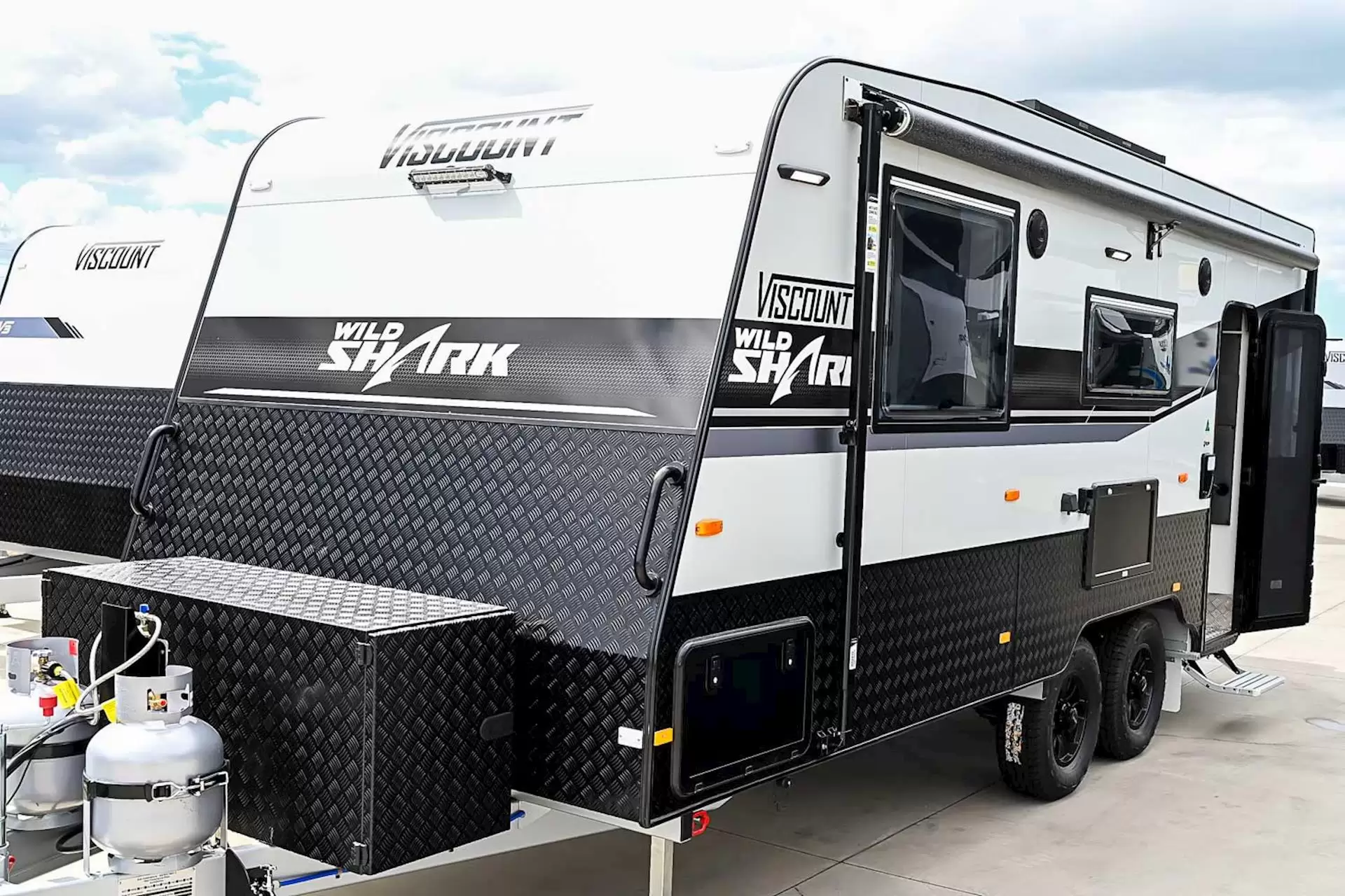 2025 PLATE RUNOUT!! WAS 87,990 NOW 83,990Extra options fitted to this van;Shark 25 Special pack includes Straight lounge dining, Matt black TC8 Rims, 200 ah lithium battery & DC/DC Charger, black checkerplate & J mould, Thetford T2208 Compressor fridge, 12 v usb a/c combo outlets, amber/ white switching annex lights, integrated water filter, instantaneous hot water, TB1400 black toolbox.2 Sirocco fans and additional anderson plug for solar input.The Viscount Wild Shark is designed for every adventurer at heart. Key exterior features include:•Heritage Grey Rear Composite Aluminium Panel, 550mm High BLACK Checkerplate & Front/Back Panel,•A spacious generator slide-out checkerplate toolbox, •And upgraded lighting with powerful front and rear floodlights. Get ready to be impressed as you enter the contemporary interior of the Wild Shark Key Interior features:•sleek black tapware throughout, •A stunning large black sink and vanity, •Premium upholstery with exquisite stitching, •Enhanced lighting, •A BMPRO battery management system with a digital Trek Display, •And Viscount Caravans’ signature computer-cut cabinetry with stylish dual-colour cupboard door options. Other features include: China Bowl Toilet ; 2 x 200w Solar Panel ; Grey Water Tank ; N2408 Thetford Fridge ; 200 ah Lithium Battery mounted to chassis ; DC-DC Miniboost ; Roof hatches with built-in LED lights ; Heritage Grey Rear Composite Aluminium Panel ; AL-KO Enduro Cross Country Independent Coil Suspension ; New Gloss Black Jackyl Rims ; Premium Upholstery and Stitching ; 550mm High Grey Checkerplate & Front/ Back Panel ; Grey Composite Aluminium Sides ; BMPRO Trek Display with digital water tank gauge and battery monitoring ; Shelves in OHC in Kitchen & Dinette ; Additional Annexe Light fitted above tunnel boot ; Bank of Drawers ; Dual Colour Cupboard Doors* ; Full Padded Bed Head ; Large Generator Slide-out Checkerplate Toolbox ; Strip light fitted to OHC in Kitchen & Dinette ; BMPRO Lithium-Compatible Battery Management System ; Black Flood Lights fitted to front &Rear ; *OHC Doors in Kitchen & Dinette in alternate colour ; 2 x 6’2” Bunk Beds ; 12v Outlets fitted to cubbyholes, Dinette and bunk beds ; 15” All Terrain Wheels & Tyres ; ‘Black Pack’ throughout including vanity, sink and tapware ; Perfect for that off-grid getaway....this Viscount Wildshark is ready to go....features include : Alko Enduro Cross Country independent suspension, full 6" chassis with optional extra 2" raiser, Optional 16" Black Jackal rims with 245 all terrain tyres, 2 x 200 watt solar panels, Full ensuite with separate shower & toilet, Top load washing machine, Grey water tank plus 2 x 95 litre fresh water tanks, Front toolbox, Optional Sirocco 12 volt fans, and much more....