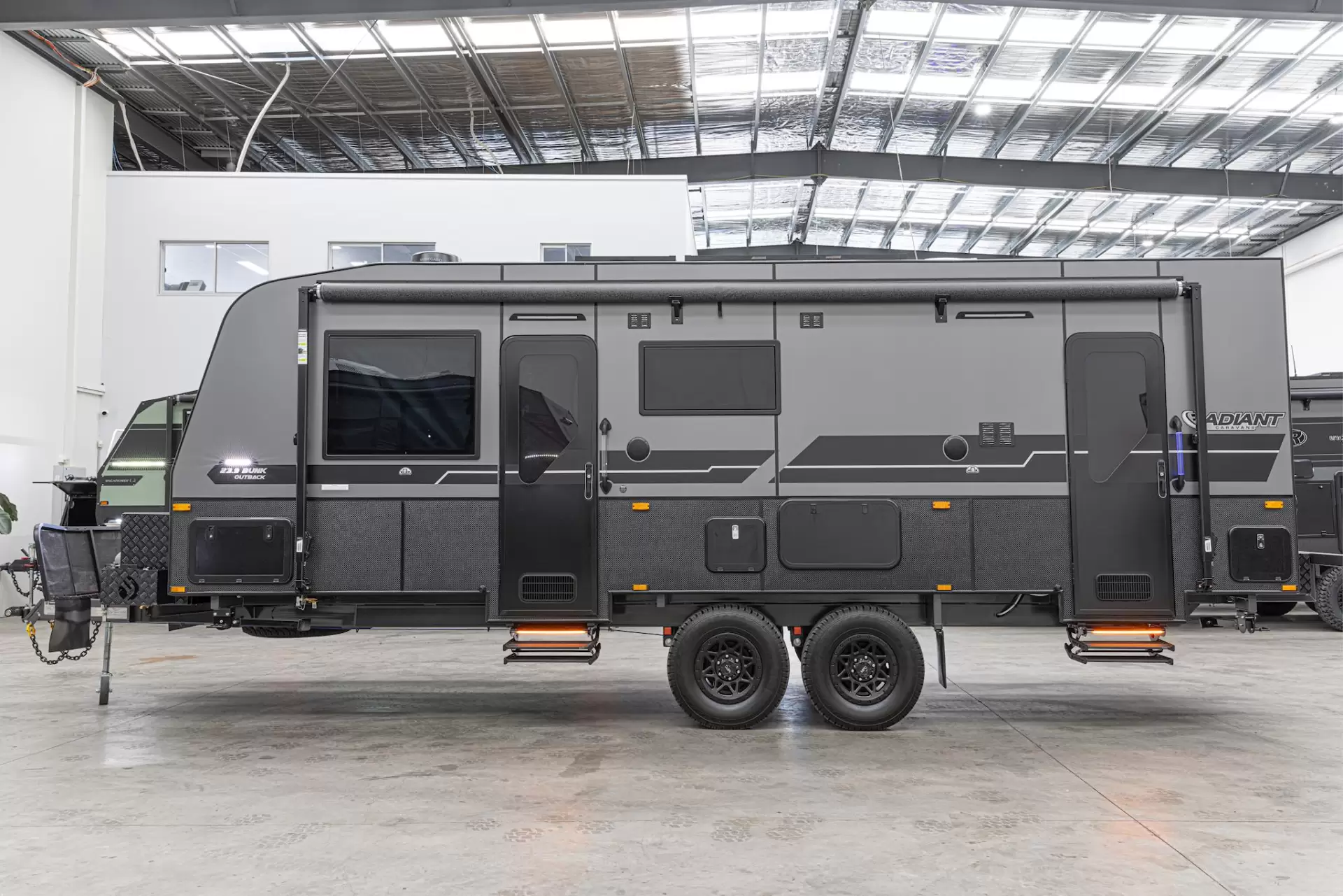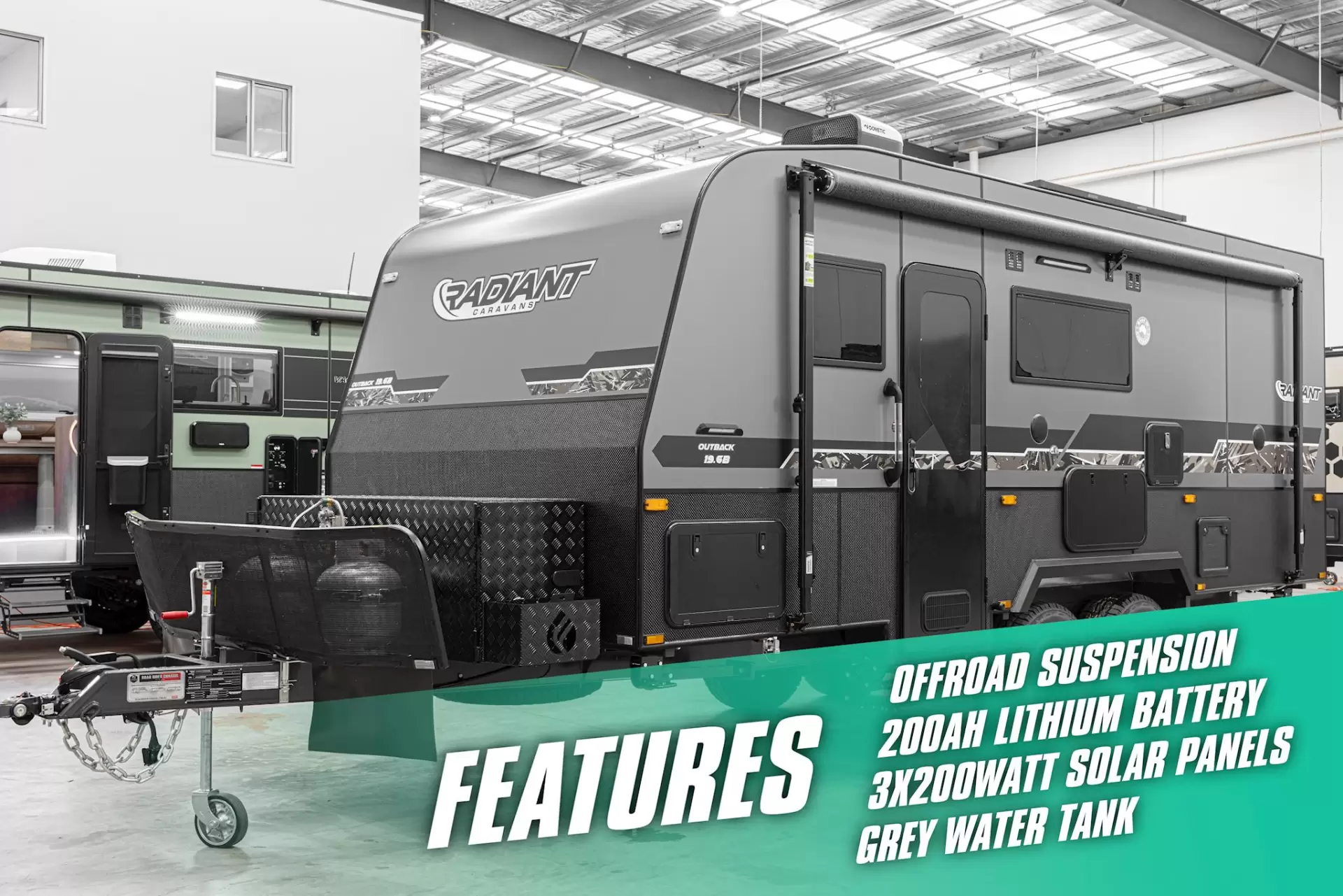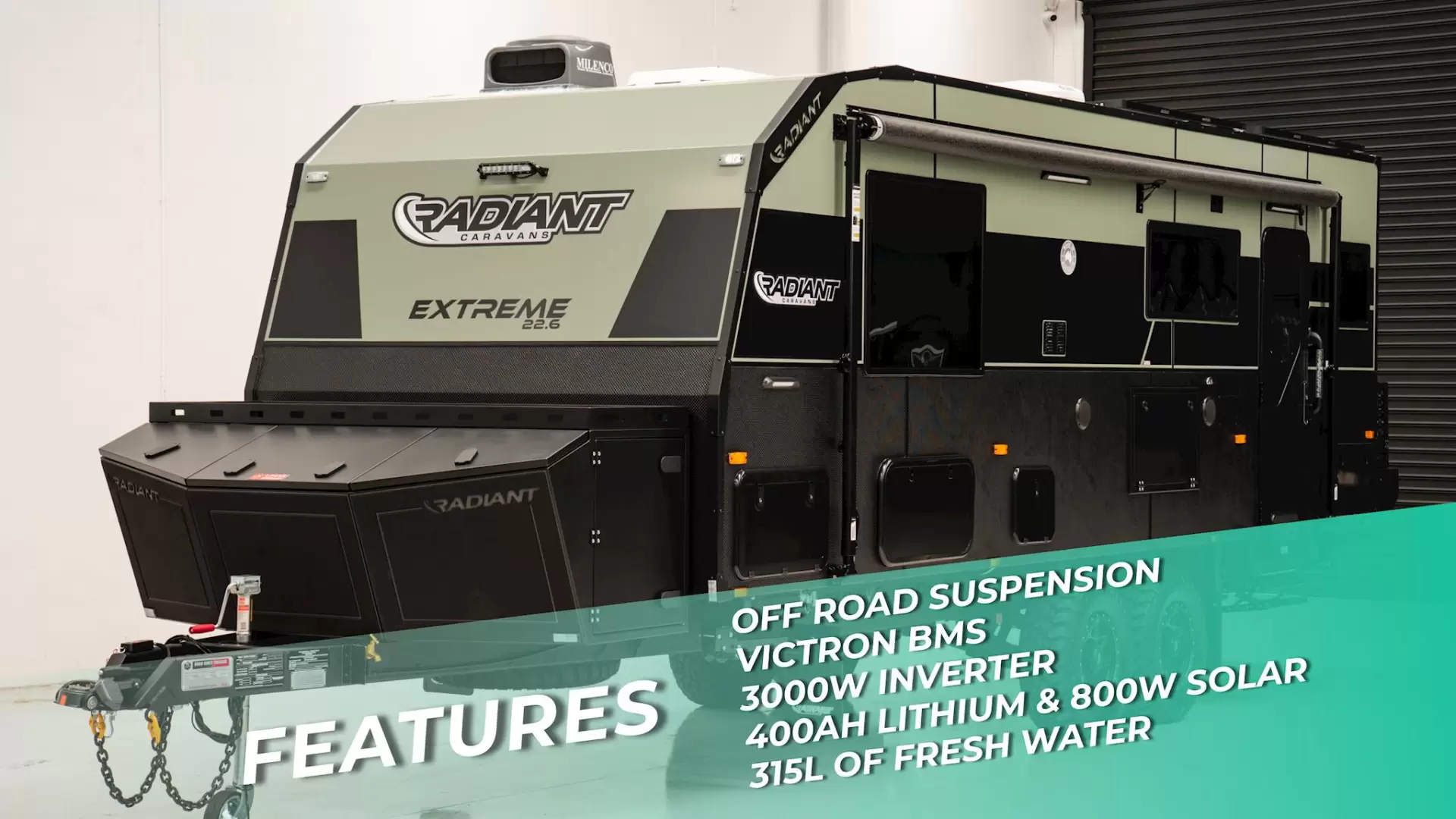 OFF GRID, OFF ROAD WITH MASSIVE TOOL BOXES 22.6 FT REAR CLUBKEY FEATURESTuff Ride Independent Coil Suspension – 4.5THeavy-Duty Extreme Front ToolboxExtreme Rear Box with 2 Jerry Can HoldersVictron BMS with Blue Smart Charger, DC-DC Charger, MPPT 100/50 and Cerbo GX4 x 200W Solar Panels2 x 200Ah Lithium Batteries3000W Baintech InverterEdge CappingOne-Piece Composite RoofOne-Piece Honeycomb FloorTruss ChassisRaptor-Coated Chassis265/75R16 Mud Terrain Tyres3 x 105L Fresh Water Tanks1 x 105L Grey Water TankDO45 Coupling – ATM 4500kgWaterfall BenchtopsFlat Blind Double-Glazed WindowsMilenco Dust Reduction System with TV Antenna900mm High Checkerplate270L Compressor FridgeSwift Induction Cooktop with 3-in-1 Air FryerTHIS VAN HAS BEEN UPGRADED WITH (NOT INCLUDED IN PRICE):GOLD PACK INSTANT HOT WATER SERVICEHERRINGBONE FLOOR EXTERNAL PANTRY ACOUSTIC WALL PANNELING MILITARY GREEN EXTERNAL COLOUR Introducing the Extreme by Radiant Caravans — a fully equipped off-road caravan built to handle Australia’s toughest conditions.The Extreme runs Tuff Ride independent coil suspension rated to 4.5T, supported by a truss chassis with Raptor coating, 265/75R16 mud-terrain tyres, and a DO45 coupling (ATM 4500kg) for confident towing on rough terrain. A heavy-duty Extreme front toolbox and Extreme rear box with dual jerry can holders provide serious storage for extended trips.Off-grid power is comprehensive, featuring 2 200Ah lithium batteries, 4 200W solar panels, a 3000W Baintech inverter, and a Victron battery management system with Blue Smart charger, DC-DC charger, MPPT 100/50, and Cerbo GX.Built with a one-piece honeycomb floor and one-piece composite roof, plus edge capping and 900mm high checkerplate, the Extreme is designed for durability and protection. Water capacity includes 3 105L fresh water tanks and a 105L grey water tank.Inside, the Extreme is packed with features, including waterfall benchtops, flat blind double-glazed windows, a 270L compressor fridge, Swift induction cooktop with 3-in-1 air fryer, and the Milenco dust reduction system with TV antenna — delivering comfort and capability wherever you go. FULL LIST OF FEATURES***CHASSIS***Tuff Ride Independent Coil Suspension – 4.5THeavy Duty Extreme Front ToolboxExtreme Rear Box with 2 Jerry Can HoldersOne-Piece Honeycomb FloorTruss ChassisRaptor-Coated Chassis265/75R16 Mud Terrain TyresDO45 Coupling – ATM 4500kg6” Heavy Duty A-FrameExtended A-Frame – 2100mmDouble Alloy Pull-Out StepGalvanised Protection to Water TanksA-Frame Tap Guard2 x 9kg Gas BottlesMudflapsJockey WheelTrail SafeDrop-Down Stabiliser LegsGalvanised Wheel Box***INTERNAL***Waterfall BenchtopsBlack Shower GlassCeramic Vanity BasinQueen Bed with Innerspring MattressEnsuite MirrorTowel RailRobe Nooks with USB, USB-C and 240VHidden Handles with Soft-Open Gas Struts to OverheadsSoft-Close DrawersRecessed Cooktop with Lift-Up Lid over StoveUpholstered BedheadUnder-Bed StorageToilet Roll HolderInternal TV BracketFire ExtinguisherSmoke Detector***EXTERNAL***Edge CappingOne-Piece Composite RoofFlat Blind Double-Glazed WindowsMilenco Dust Reduction System with TV Antenna900mm CheckerplateRoll-Out AwningFront Tunnel BootFold-Down Picnic Table with LED Light and USB2 x LED-Framed Sky HatchesMain Entry Door with BinCoast to Coast Access DoorsExternal TV Box12V Fan and LED Hatch to Shower and Toilet***ELECTRICAL***Victron BMS with Blue Smart Charger, DC-DC Charger, MPPT 100/50 and Cerbo GX4 x 200W Solar Panels2 x 200Ah Lithium Batteries3000W Baintech InverterSafety Dave Reverse Camera with Monitor KitLED Ceiling Downlights ThroughoutLED Strip Lighting in Overheads and Under KitchenLED Light over Sink and Vanity2 x 12V Fans in Bedroom1 x 12V Fan in Each Bunk (Family Van)3 x Large Heavy-Duty Annex LightsFront and Rear Work Lights2 x Lights in Tunnel BootLED TaillightsExternal TV Co-Ax Point2 x Reading Lights with USB and USB-C in Bedroom2 x Reading Lights with USB and USB-C in Seating Area1 x Internal TV Point***PLUMBING***3 x 105L Fresh Water Tanks1 x 105L Grey Water TankBlack Tapware ThroughoutExternal ShowerThetford ToiletHot Water SystemDigital Water Level GaugeLockable Water FillersMains Pressure Inlet12V Shurflo Water PumpFlick Mixer TapsExternal Gas Bayonet***APPLIANCES***270L Compressor FridgeSwift Induction Cooktop with 3-in-1 Air FryerGree Air Conditioner3.2kg Top-Loader Washing MachineFusion Radio with Bluetooth12V Rangehood24” Smart TVTare: 3066 KGATM: 4500KGBALL: 226 KGInternal Size: 22.6 FTExternal Size: 22.6 FTExplore our latest caravan models, now available with financing options. We accept trade-ins and offer consignment services. Additionally, we provide servicing, maintenance, and a wide range of accessories.Our Hours:Monday to Friday: 9:00 am - 5:00 pmSaturday: 9:00 am - 3:00 pmPlease note that we are closed on public holidaysPLEASE NOTE PRICE IS BASED ON PICK UP MELBOURNEADD 8,000 FOR WA FREIGHT AND REGOADD 3,000 FOR NSW FREIGHT AND REGOABOUT USStep into a new age of travel with our exceptional caravan selection, where urban sophistication meets the sunseeker's delight. As you journey through uncharted landscapes, our caravans redefine what's possible. From family getaways to off-road escapes, our models offer a retreat from the ordinary. Picture yourself as a true Lotus, blossoming amidst diverse terrains with grace and elegance, whether you're conquering tough landscapes or setting up bunks for a cozy night's sleep.Our caravans are crafted with a supreme level of design and care, standing as masterpieces ready to withstand the test of time, the rugged outdoors, and the discerning eye of design enthusiasts. Just like a Snowy River carving its path, our caravans navigate through challenges effortlessly, making you a Patriot of exploration. With features like 4x4 capability, ensuite facilities, and inbuilt toilets, you have the freedom to embrace the off-road journey fully.Imagine being on the move through beautiful landscapes, unwinding in a club lou