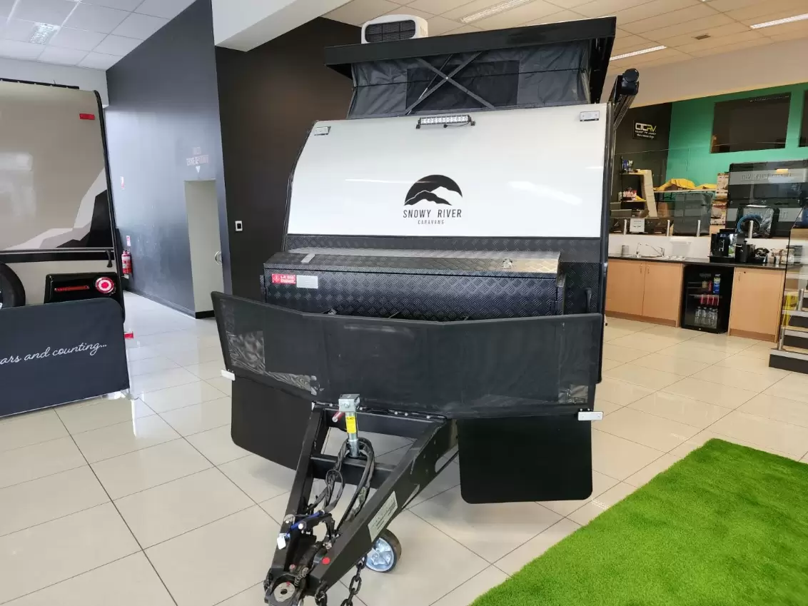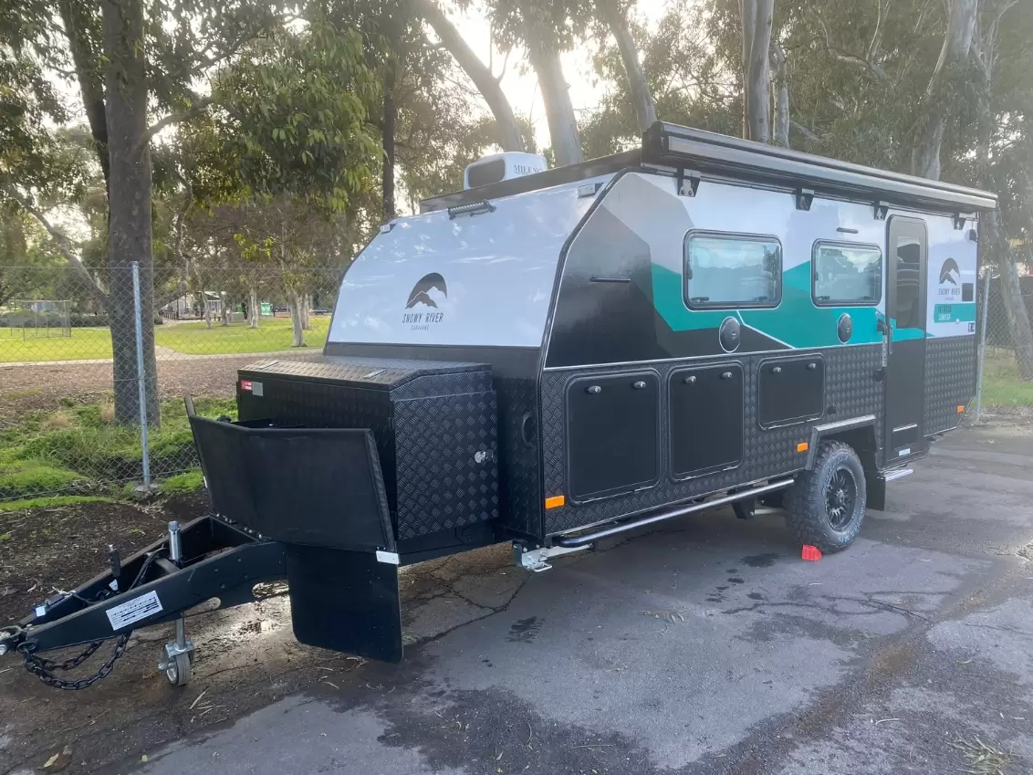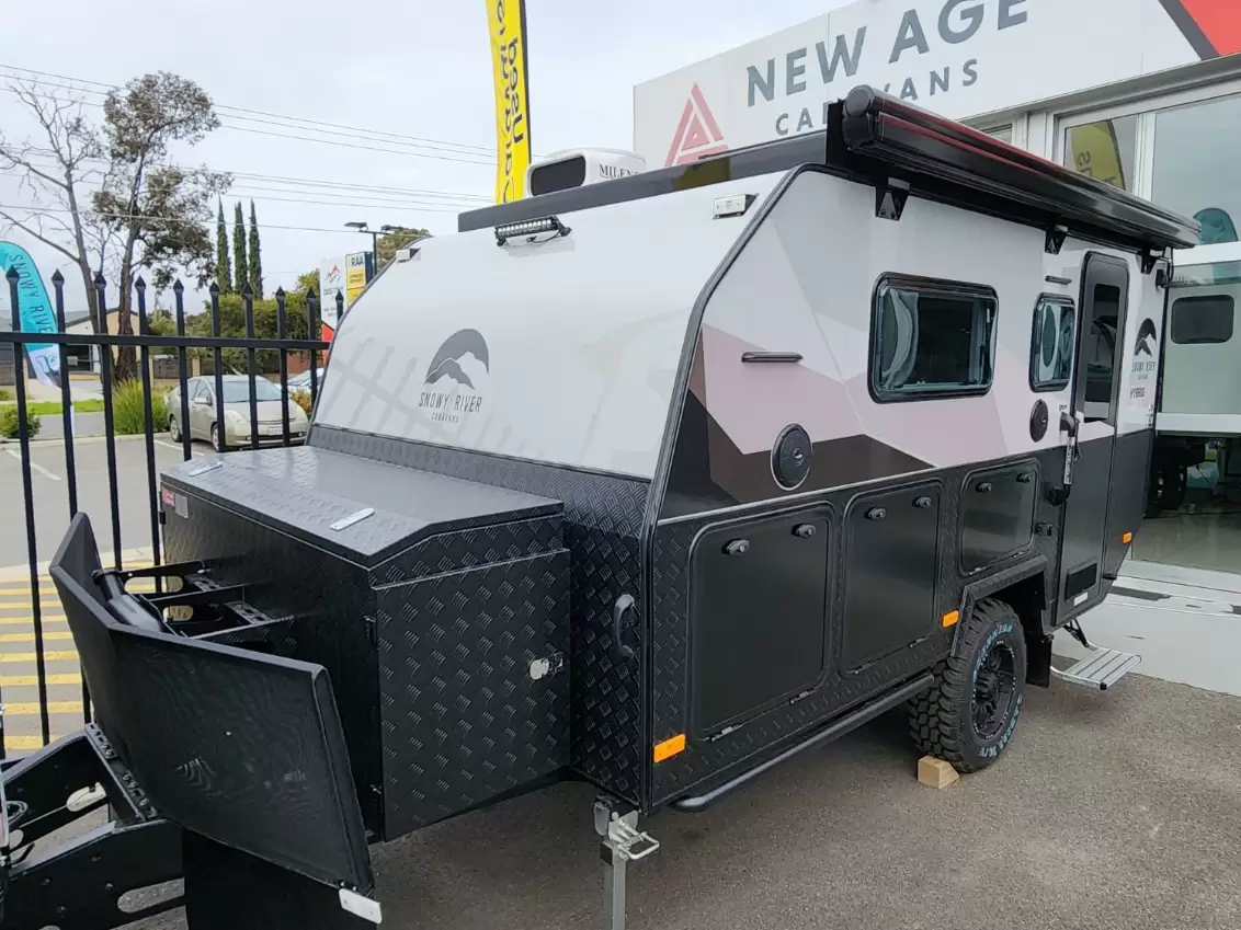 2025 Snowy River SRH13 - Big on features, Smooth on the Road, Amazing capability Off-RoadTravelling couples should feel indulgent, not restricted. But many caravans leave you feeling like you're sacrificing the comforts of home for life on the road. Lacking features, poorly laid out, and missing those thoughtful touches that turn a caravan into a lifestyle upgrade.Enter the 2025 SRH13 - where Rugged design, refined interiors, and Off-Road capability combine to create a truly comfortable Adventuring experience.Key Features:Spacious queen bed with inner-spring mattress and bed side storage podsPremium leather trim for added luxury and easy cleaning.Combo shower/toilet with curtain & vanity.Bed end fold up seat & bench seat dining area.Thetford 55L compressor fridge, Internal sinkBelair 2400 air conditioner, double glazed windows, blockout blindsMilenco DRA dust suppression2x 200Ah Lithium battery, 4x 150W solar panel, Renogy OffGrid Andventure battery management system2000W Inverter & charger2x120L fresh water tanks & 100L Grey Water tank, and gas on demand hot water systemSnowy River exclusive ALOPEX sandwich panel construction and modern styling throughoutSnowy River exclusive SR-Xplore suspensionRaptor coated chassis and goose neck A-frameWhy Choose the SRH13?With adavnced construction from body to suspension, don't settle for the run of the mill frame style Hybrid and Galvanised chassis, make life easier with electric roof and awning, unique slide out kitchen exclusive to Snowy River's Hybrid caravan range. Don't miss out one one of the best looking and best featured vans on the market!