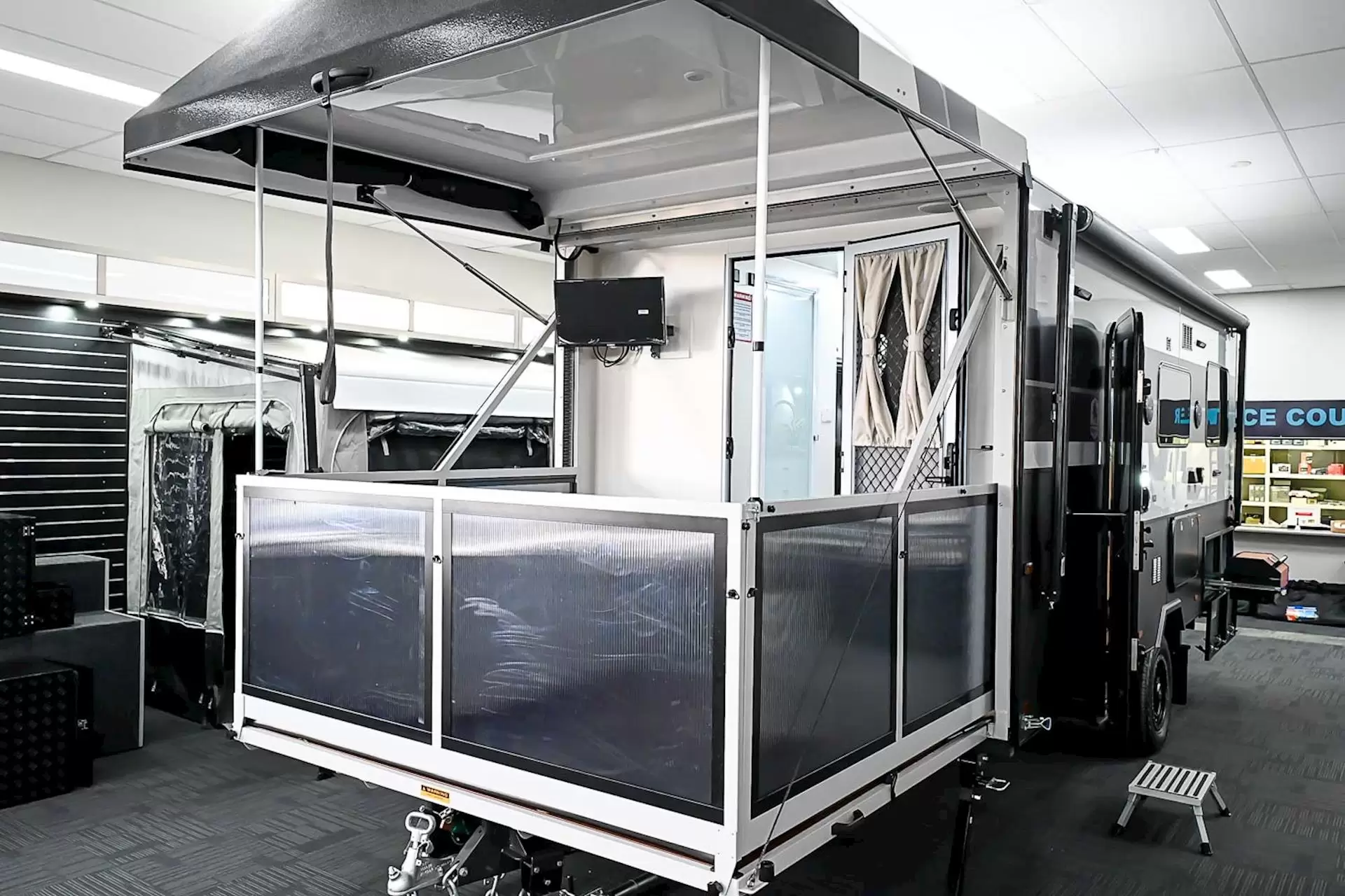 Step into something truly unique with the Royal Flair Piazza 16.1 — the compact van with a full fold-away deck, giving you the ultimate outdoor entertaining space wherever you travel. Inside, enjoy a smartly designed layout featuring a centre ensuite with toilet & shower, an electric lift bed, and a telescopic table with a club lounge, delivering comfort, convenience, and style in one impressive package.Premium Features Include:Tuffride Independent Suspension – smooth, stable towingElectronic Stability ControlDual Reverse Camera – safer reversing & easier hitching900W Flatbed MicrowaveSoft-Close Doors & Slimline Euro Windows16" Wheels (245/75) – extra clearance & off-road confidenceBMPRO Electrical System200Ah Lithium Battery System2 x 200W Solar Panels – stay off-grid longer138L 3-Way Fridge – efficient cooling anywhereCowfish AntennaInverter Compressor Air Conditioner – quieter, efficient coolingPillow-Top Mattress – premium comfort50mm Ball HitchWaterfall Benchtops – sleek, modern interior finishSlide-Out BBQ – outdoor cooking made easyPeace of Mind24/7 Roadside Assist5-Year Manufacturer WarrantyA compact footprint with massive entertaining potential — the Piazza 16.1 is built for travellers who want something truly different.At this reduced Plate Clearance price, it won’t last long!South East Melbourne & West Gippsland’s Premier Caravan DestinationLocated less than an hour east of Melbourne and just over an hour from Traralgon on the M1 freeway. Visit our modern dealership and chat with our friendly, experienced sales team.Onsite Finance – fast, same-day approvalsAustralia-Wide DeliveryOnsite Auto Electrician – car wiring & camera installation ready to go