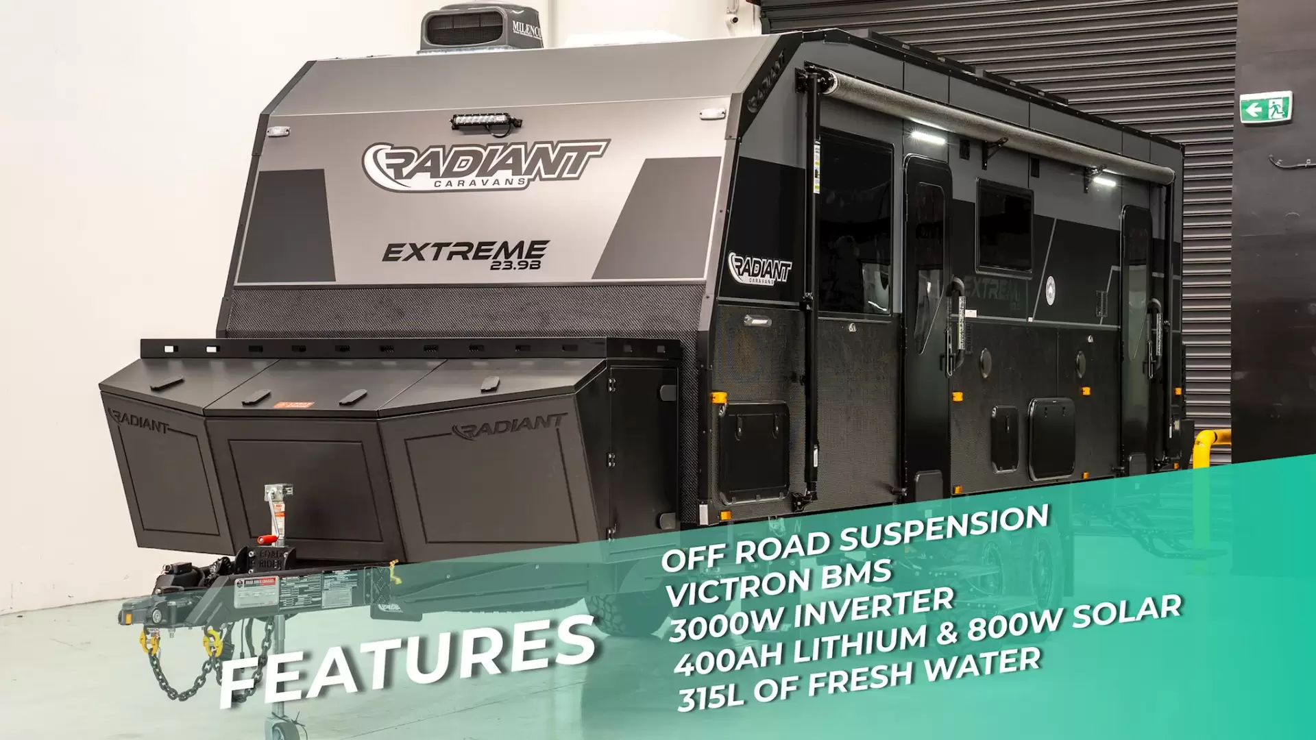 OFF GRID, OFF ROAD WITH MASSIVE TOOL BOXES 23.9 FT DOUBLE DOOR, 2 BUNKS FAMILY VAN***KEY FEATURES***Tuff Ride Independent Coil Suspension – 4.5THeavy-Duty Extreme Front ToolboxExtreme Rear Box with 2 Jerry Can HoldersVictron BMS with Blue Smart Charger, DC-DC Charger, MPPT 100/50 and Cerbo GX4 x 200W Solar Panels2 x 200Ah Lithium Batteries3000W Baintech InverterEdge CappingOne-Piece Composite RoofOne-Piece Honeycomb FloorTruss ChassisRaptor-Coated Chassis265/75R16 Mud Terrain Tyres3 x 105L Fresh Water Tanks1 x 105L Grey Water TankDO45 Coupling – ATM 4500kgWaterfall BenchtopsFlat Blind Double-Glazed WindowsMilenco Dust Reduction System with TV Antenna900mm High Checkerplate270L Compressor FridgeSwift Induction Cooktop with 3-in-1 Air FryerTHIS VAN HAS BEEN UPGRADED WITH (NOT INCLUDED IN PRICE):GOLD PACKINSTANT HOT WATER SERVICEHERRINGBONE FLOORIntroducing the Extreme by Radiant Caravans — a fully equipped off-road caravan built to handle Australia’s toughest conditions.The Extreme runs Tuff Ride independent coil suspension rated to 4.5T, supported by a truss chassis with Raptor coating, 265/75R16 mud-terrain tyres, and a DO45 coupling (ATM 4500kg) for confident towing on rough terrain. A heavy-duty Extreme front toolbox and Extreme rear box with dual jerry can holders provide serious storage for extended trips.Off-grid power is comprehensive, featuring 2 200Ah lithium batteries, 4 200W solar panels, a 3000W Baintech inverter, and a Victron battery management system with Blue Smart charger, DC-DC charger, MPPT 100/50, and Cerbo GX.Built with a one-piece honeycomb floor and one-piece composite roof, plus edge capping and 900mm high checkerplate, the Extreme is designed for durability and protection. Water capacity includes 3 105L fresh water tanks and a 105L grey water tank.Inside, the Extreme is packed with features, including waterfall benchtops, flat blind double-glazed windows, a 270L compressor fridge, Swift induction cooktop with 3-in-1 air fryer, and the Milenco dust reduction system with TV antenna — delivering comfort and capability wherever you go. FULL LIST OF FEATURES ***CHASSIS***Tuff Ride Independent Coil Suspension – 4.5THeavy Duty Extreme Front ToolboxExtreme Rear Box with 2 Jerry Can HoldersOne-Piece Honeycomb FloorTruss ChassisRaptor-Coated Chassis265/75R16 Mud Terrain TyresDO45 Coupling – ATM 4500kg6” Heavy Duty A-FrameExtended A-Frame – 2100mmDouble Alloy Pull-Out StepGalvanised Protection to Water TanksA-Frame Tap Guard2 x 9kg Gas BottlesMudflapsJockey WheelTrail SafeDrop-Down Stabiliser LegsGalvanised Wheel Box***INTERNAL***Waterfall BenchtopsBlack Shower GlassCeramic Vanity BasinQueen Bed with Innerspring MattressEnsuite MirrorTowel RailRobe Nooks with USB, USB-C and 240VHidden Handles with Soft-Open Gas Struts to OverheadsSoft-Close DrawersRecessed Cooktop with Lift-Up Lid over StoveUpholstered BedheadUnder-Bed StorageToilet Roll HolderInternal TV BracketFire ExtinguisherSmoke Detector***EXTERNAL***Edge CappingOne-Piece Composite RoofFlat Blind Double-Glazed WindowsMilenco Dust Reduction System with TV Antenna900mm CheckerplateRoll-Out AwningFront Tunnel BootFold-Down Picnic Table with LED Light and USB2 x LED-Framed Sky HatchesMain Entry Door with BinCoast to Coast Access DoorsExternal TV Box12V Fan and LED Hatch to Shower and Toilet***ELECTRICAL***Victron BMS with Blue Smart Charger, DC-DC Charger, MPPT 100/50 and Cerbo GX4 x 200W Solar Panels2 x 200Ah Lithium Batteries3000W Baintech InverterSafety Dave Reverse Camera with Monitor KitLED Ceiling Downlights ThroughoutLED Strip Lighting in Overheads and Under KitchenLED Light over Sink and Vanity2 x 12V Fans in Bedroom1 x 12V Fan in Each Bunk (Family Van)3 x Large Heavy-Duty Annex LightsFront and Rear Work Lights2 x Lights in Tunnel BootLED TaillightsExternal TV Co-Ax Point2 x Reading Lights with USB and USB-C in Bedroom2 x Reading Lights with USB and USB-C in Seating Area1 x Internal TV Point***PLUMBING***3 x 105L Fresh Water Tanks1 x 105L Grey Water TankBlack Tapware ThroughoutExternal ShowerThetford ToiletHot Water SystemDigital Water Level GaugeLockable Water FillersMains Pressure Inlet12V Shurflo Water PumpFlick Mixer TapsExternal Gas Bayonet***APPLIANCES***270L Compressor FridgeSwift Induction Cooktop with 3-in-1 Air FryerGree Air Conditioner3.2kg Top-Loader Washing MachineFusion Radio with Bluetooth12V Rangehood24” Smart TVTare: 3183KGATM: 4500KGBALL: 250KGInternal Size: 23.9 FT External Size: 23.9 FTExplore our latest caravan models, now available with financing options. We accept trade-ins and offer consignment services. Additionally, we provide servicing, maintenance, and a wide range of accessories.Our Hours:Monday to Friday: 9:00 am - 5:00 pmSaturday: 9:00 am - 3:00 pmPlease note that we are closed on public holidaysPLEASE NOTE PRICE IS BASED ON PICK UP MELBOURNEADD 8,000 FOR WA FREIGHT AND REGOADD 3,000 FOR NSW FREIGHT AND REGOABOUT USStep into a new age of travel with our exceptional caravan selection, where urban sophistication meets the sunseeker's delight. As you journey through uncharted landscapes, our caravans redefine what's possible. From family getaways to off-road escapes, our models offer a retreat from the ordinary. Picture yourself as a true Lotus, blossoming amidst diverse terrains with grace and elegance, whether you're conquering tough landscapes or setting up bunks for a cozy night's sleep.Our caravans are crafted with a supreme level of design and care, standing as masterpieces ready to withstand the test of time, the rugged outdoors, and the discerning eye of design enthusiasts. Just like a Snowy River carving its path, our caravans navigate through challenges effortlessly, making you a Patriot of exploration. With features like 4x4 capability, ensuite facilities, and inbuilt toilets, you have the freedom to embrace the off-road journey fully.Imagine being on the move through beautiful landscapes, unwinding in a club lounge after a day of adventure, or taking a ref