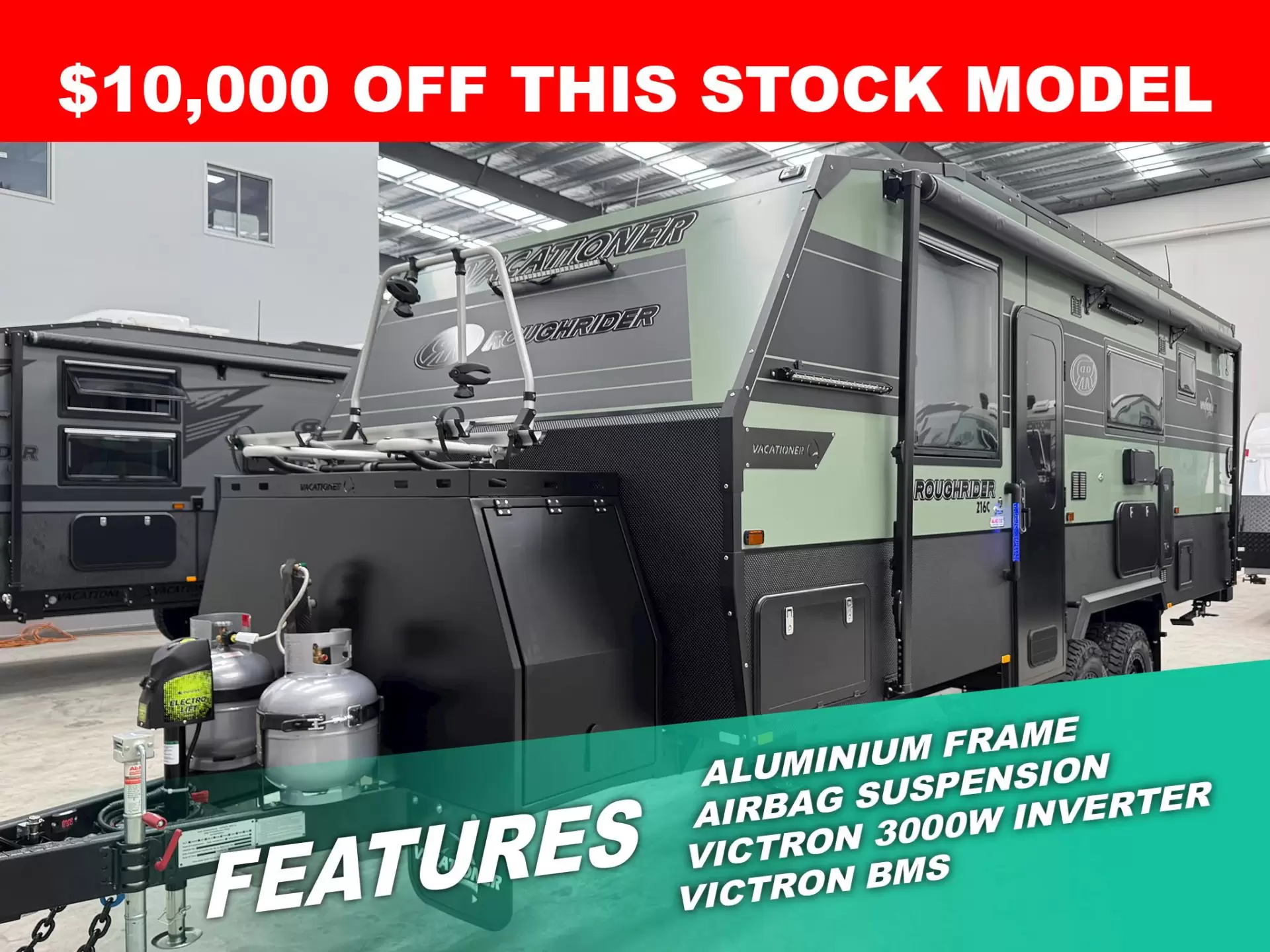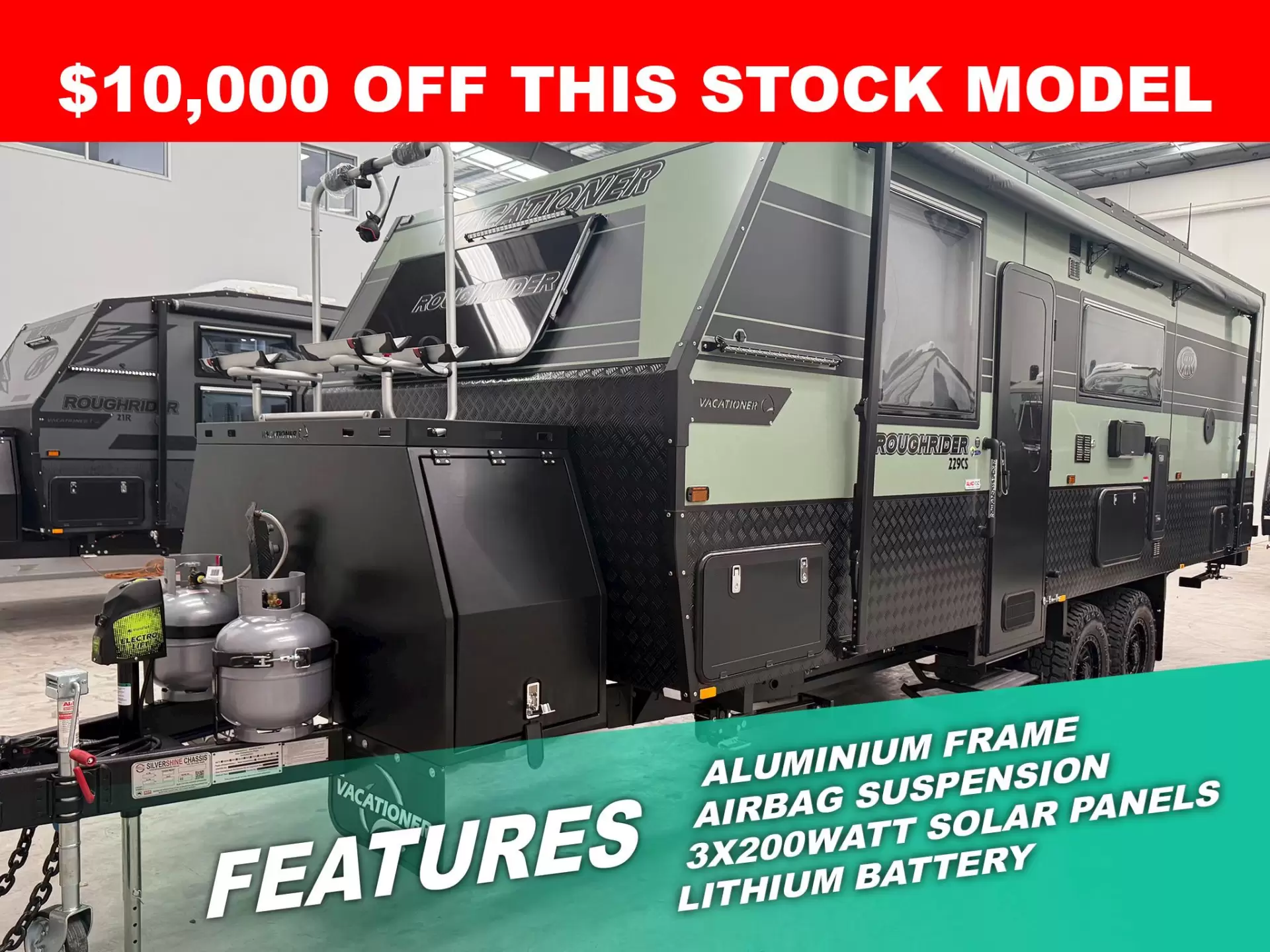 22.9FT REAR CLUB — WITH AIRBAG SUSPENSION, VICTRON OFF-GRID POWER, ALUMINIUM FRAME, AND 1000W OF SOLAR.KEY FEATURESALUMINIUM FRAME (HENROB RIVETED & TIG WELDED)AIRBAG SUSPENSION - TRACK HAWK LEVEL 2 MANUAL 4.5TONE PIECE FIBERGLASS INTERNAL WALLS AND ROOFXPS CLOSED CELL FOAM INSULATIONVICTRON OFF GRID SYSTEM – VICTRON 12V BATTERY MANAGEMENT SYSTEM VICTRON 12V MULTIPLUS 3000W-120A INVERTERVICTRON CERBO GX CONTROLLER GXTOUCH-50 MONITOR2 X 300AH (600AH) HIGH DISCHARGE IP67 LITHIUM BATTERIES2 X 30A VICTRON MPPT SMART SOLAR CONTROLLERS1 X 35A VICTRON MPPT SMART SOLAR CONTROLLERVICTRON 50A DC-DC CHARGER1050W OF SOLAR- 3 X 200W & 1 X 450W 2026 X-GEN ROUGRIDER EDGE CAPPINGX-GEN REAR WINGTRUSS CHASSISRAPTOR COATED CHASSIS12V ELECTRO JACK-JOCKEY WHEELSTARLINK MINI PROVISIONMICKEY THOMPSON BAJA BOSS AT TYRES (265/75R16)16" WRATH RIMS2 X 95L FRESH WATER TANKS110L GREY WATER TANKRECESSED DO-45 COUPLINGMINI X-GEN FRONT BOX WITH VACATIONER MUDFLAPSREAR TWIN WOODBOX WITH 1 X LID & 2 X JERRY CAN HOLDERS270L COMPRESSOR FRIDGEONE PIECE HONEYCOMB FLOORFUSION MARINE AUDIO ENTERTAINMENT12" BRAKES6" A-FRAME 5MM THICKTHIS VAN HAS BEEN UPGRADE WITH (INCLUDED IN TOTAL PRICE)BRUSHED GOLD PACK X-GEN REAR BOX OPTION 2 REAR WOOD BOX Introducing the 2026 Vacationer Rough Rider by Vacationer Caravans — a serious aluminium-frame off-road caravan built for Australia.Built with a full aluminium frame, one-piece fibreglass internal walls and roof, and a one-piece honeycomb floor, the Rough Rider uses zero timber in the walls for a waterproof, rot-free build, enhanced by XPS closed-cell foam insulation for superior thermal performance.Underneath, airbag suspension delivers ride comfort, stability, and control on rough tracks, supported by a truss chassis with Raptor coating, a 6” A-frame, DO-45 coupling, and Mickey Thompson tyres for serious off-road strength.Power comes from a full Victron off-grid electrical system with 600Ah lithium, 1050W solar, and a 3000W inverter, making it ready for extended remote touring. Finished with stealth styling, including a rear spoiler, massive front toolbox, and stealth edge capping, the Rough Rider is built tough and engineered to go the distance.FULL LIST OF FEATURES:***CHASSIS & SUSPENSION***AIRBAG SUSPENSION - TRACK HAWK LEVEL 2 MANUAL 4.5TTRUSS CHASSISRAPTOR COATED CHASSISMINI X-GEN FRONT BOX WITH VACATIONER MUDFLAPSREAR WOOD BOX WITH LID & 2 X JERRY CAN HOLDERSTIE DOWN POINTS ON CHASSIS TO HOLD UP SUSPENSION ARM4-ARM STRAIGHT OFF-ROAD REAR BARMICKEY THOMPSON BAJA BOSS AT TYRES (265/75R16)16" WRATH RIMS12" BRAKESONE PIECE HONEYCOMB FLOORRECESSED DO-45 COUPLING6" A-FRAME 5MM THICKORANGE NEON CHASSIS STRIP LIGHTINGRATED SAFETY CHAINS WITH CHASSIS MOUNTING BRACKET12V ELECTRO JACK-JOCKEY WHEELEUROFLEK DOUBLE JOCKEY WHEELCHECKERPLATE WATER TANK GUARDSCHECKERPLATE GREY WATER TANK COVERDROP DOWN LEGSVACATIONER LOGO MUDFLAPSFLAT FLOOR CHASSIS***ELECTRICAL***VICTRON OFF GRID SYSTEM – VICTRON 12V BATTERY MANAGEMENT SYSTEM VICTRON 12V MULTIPLUS 3000W-120A INVERTERVICTRON CERBO GX CONTROLLER GXTOUCH-50 MONITOR2 X 300AH (600AH) HIGH DISCHARGE IP67 LITHIUM BATTERIES2 X 30A VICTRON MPPT SMART SOLAR CONTROLLERS1 X 35A VICTRON MPPT SMART SOLAR CONTROLLERVICTRON 50A DC-DC CHARGER1050W OF SOLAR- 3 X 200W & 1 X 450W 50A BLUE ANDERSON PLUG FOR PORTABLE SOLAR50A BLACK ANDERSON PLUG FOR POWER OUT IN TOOLBOX DOORSIDEVICTRON GX LTE 4G MODEM WITH 4G ANTENNA WITH 1 YEAR SIMSTARLINK MINI PROVISIONALKO ESC (ELECTRONIC STA BILLITY CONTROL)SAFETY DAVE REAR VIEW CAMERA WITH 7" CAR MONITOREUROFLEK OMNI DIRECTIONAL ANTENNA24" LED SMART TV INTERNALFUSION RA210 AUDIO SYSTEM2 X FUSION INTERNAL ROOF SPEAKERSFUSION SOUND PANELLIGHT, 12V USB/USBC, DOUBLE 240V P/POINTS IN BEDROOMLIGHT, 12V USB/USBC, DOUBLE 240V P/POINTS AT SEATING AREABAR LIGHT WHITE/AMBER LIGHTS FRONT AND BACKBAR LIGHT WHITE/AMBER ROADSIDEBAR LIGHT WHITE/AMBER DOORSIDEBAR LIGHT WHITE/AMBER ABOVE TUNNELBOOT DOORSIDESMALL ADJUSTABLE SQUARE WORK LIGHT ON FRONT WALLDOORSIDE12V FAN OVER MAIN BED12V FAN AT LOUNGE12V FAN AT EACH BUNKLED STRIP LIGHT AROUND STEPWELLPREMIUM POWER POINTS & SWITCHESEXTERNAL TV ENTERTAINMENT HATCH 32" SMART LED TV 2 X 32" IN-BUILT SMART LED TVS FUSION RA670 AUDIO SYSTEM WITH SOUNDBARS 2 X 12V FAN AT LOUNGE ON REAR CLUBS***PLUMBING***ENDLESS HOT WATER SYSTEMTHETFORD CERAMIC TOILET WITH BUILT IN CABINET2 X 95L FRESH WATER TANKS110L GREY WATER TANKGREY WATER BYPASS12V PUMPBRASS MANIFOLD SYSTEMEXTERNAL SHOWER2 X 7.5KG COMPOSITE GAS BOTTLES3 WAY SINK MIXER TAP WITH BUILT IN WATER FILTER OUTLETGAS BAYONET***OUTSIDE***MINI X-GEN FRONT BOX WITH VACATIONER MUDFLAPSREAR TWIN WOODBOX WITH 1 X LID & 2 X JERRY CAN HOLDERSONE PIECE EXTERNAL FIBREGLASS ROOF2026 X-GEN ROUGRIDER EDGE CAPPINGX-GEN REAR WING12V DUST SUPPRESSION SYSTEMLED SKYLIGHT IN ROOFEUROFLEK LED HATCH OVER SHOWER & TOILETEUROFLEK FLAT BLIND WINDOWSMOULDED STEPWELL WITH LEDAUTOMATIC ELECTRIC EUROFLEK LED PULLOUT STEP2 X 7.5KG COMPOSITE GAS BOTTLESPICNIC TABLE, KEYLESS WITH LED LIGHTSAIL TRACK ROADSIDELED ROLL OUT AWNINGELECTRIC DOUBLE LED PULL OUT STEP***INSIDE***ALUMINIUM FRAME (HENROB RIVETED & TIG WELDED)XPS CLOSED CELL FOAM INSULATIONONE PIECE FIBERGLASS INTERNAL WALLS AND ROOFNEW VACATIONER BACKLIT BEDHEAD WITH 2026 LOGO'SWHITE LED MOOD LIGHTING LUXURY SOFT FURNISHINGS WITH A DISTINCT HIGH-END FEELPREMIUM PILLOW TOP INNERSPRING MATTRESSLUXURY VINYL FLOORING WITH FELT UNDERLAYPREMIUM SPLASHBACKSBLACK SINK, VANITY BASIN, TAPWARE & BATHROOM ACCESSORIESTITUS TECFORM METAL SOFT CLOSE DRAWER RUNNERSWATERFALL BENCHTOPSROBE CUTOUTSLARGE SHOWER WITH MIRRORED DOORFRAMELESS ENSUITE MIRROR WITH BACKLIT LEDSLIDING DOOR TO ENSUITEMIRROR DOOR SHAVING CABINET WITH SHELVES***APPLICANCES***270L COMPRESSOR FRIDGESWIFT HAWK TWIN INDUCTION HOBNCE 4 IN 1 MICROWAVE OVEN IN DOORSIDE KITCHENGREE 3.5KW INVERTERAIRCONFUSION MARINE AUDIO ENTERTAINMENT12V RANGEHOOD24” LED SMART TV INTERNALEXTERNAL ENTERTAINMENT HATCHFUSION EXTERNAL STEREO PANELEXTRA GREE 2.5KW INVERTER AIRCON3KG WALL MOUNT WASHING