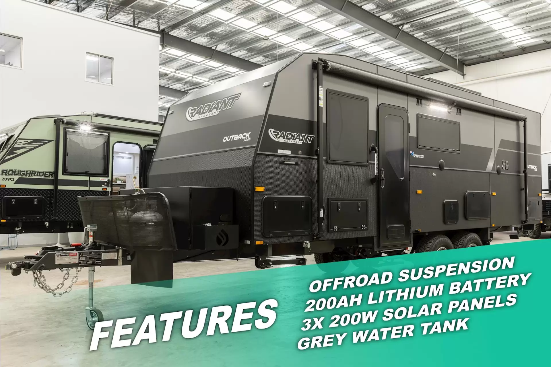 FULL OFF-ROAD WITH LITHIUM AND LOTS OF SOLAR- BEST VAULE VAN IN AUSTRALIA 2026 22.6 FT REAR BUNK FULL OFF-ROAD FAMILY CARAVAN KEY FEATURES Tuff Rider Independent Coil Suspension1 x 200AH Lithium batteries3x 200w SOLAR panelHoneycomb flooring- One PieceOne Piece Composite RoofDometic Dust Reduction System265/75R16 All terrain tyresLarge Front Toolbox In Black Enamal 2 Jerry Can Holders On Toolbox2 x 105L Fresh water tanks1 x 105L Grey Water tank900mm Checker Plate SidesFront stone guard 12" BrakesOutside TV Box6 ”Heavy duty A- FrameWater Fall Bench topsDO35 CouplingFUSION RA60 Radio270L Compressor Fridge GREE Air ConditionerBM PRO Battery plus35-II-HA with OdysseyInverter ProvisionSafety Dave reverse camera with Car monitor kitTHIS VAN HAS BEEN UPGRADED WITH (NOT INCLUDED IN PRICE)GOLD PACK SUBURBAN INSTANT HOT WATER SERVICEDiscover the unparalleled quality and exceptional value of Radiant Caravans, the best value caravan in Australia. Designed with premium features and cutting-edge technology, this caravan ensures a luxurious and comfortable travel experience.Featuring the TUFF RIDE independent coil suspension and 16” all-terrain tyres, the Radiant caravan promises you the freedom to take this van anywhere offroad. It is equipped with a 200AH lithium battery and 3x 200W solar panels, offering reliable power for your free camping adventures. The honeycomb flooring and one-piece composite roof enhance durability and longevity. This caravan comes with a large front toolbox, a 100L grey water tank, and a front stone guard for added convenience and protection. Inside, you'll find waterfall bench tops and a spacious 270L fridge compressor for a touch of luxury. FULL LIST OF FEATURES ***CHASSIS***Tuff Rider Independent Coil Suspension - ATM 3500 KG265/75R16 All terrain tyresLarge Front Toolbox In Black Enamal 2 Jerry Can Holders On Tool Box12" Brakes6 ”Heavy duty A- FrameHoneycomb flooring- One PieceDO35 CouplingExtra chassis mounted battery boxSupa gal Chassis2x9kg Gas bottlesEntry step3 Arm heavy duty bumper barRear wood Box Front stone guard Jockey WheelBmpro TrailsafeGalvanized protection to water tanksExtended A frame - 1900mmDrop down stabilizer legsMud Flaps***ELECTRICAL***1 x 200AH Lithium batteries3x 200w SOLAR panelBM PRO Battery plus35-II-HA with OdysseyInverter ProvisionSafety Dave reverse camera with Car monitor kit1 x 12v fan in Living room 1 x 12v in each bunks *If Applicable LED ceiling down lights throughoutExternal Anderson Plug for Solar Blanket Grey Anderson Plug 50 amp12 Pin Flat car plug2 x reading lights with US B in bedroom and seating areaTv Co-ax external point1x Large heavy duty Annex lights 2 x Lights in tunnel boot LED Taillights240v 15amp inlet and 240v and 10 amp outletTV antennaLed light over sink and vanityLed strip on overhead and under kitchen***PLUMBING***2 x 105L Fresh water tanks1 x 105L Grey Water tankBlack tap ware throughoutFibreglass showerThetford Cassette toiletA-Frame mains pressure tapExternal gas bayonetFlick Mixer tapsExternal ShowerDigital water level gaugeA- Frame tap guardLockable water fillersMains Pressure inlet12v Shurflo water pump***EXTNERAL***One piece composite roofDometic Dust Reduction System900mm Checker Plate SidesOutside TV BoxRoll out AwningFront tunnel bootFold down picnic table2 x LED framed sky hatchesBubble entry door handleDouble glazed large Ranger windowsMain Entry doorCoast to coast access doorHigh quality vinyl decals12v Fan and LED hatch to shower and toilet***INTERNAL***Water fall Bench topsFrosted shower doorCeramic Vanity basinKitchen PantryQueen bed with Innerspring mattressEnsuite mirrorNooks in Robes with USB US B C and 240Hidden handles and soft open gas struts on overheadsSoft close drawersRecessed cooktop with lift-top over stoveUpholstered bed headTowel railToilet Roll holderInternal tv bracketUnder bed storage***APPLIANCES***FUSION RA60 Radio270L SPHERE fridge Washing machineGREE Air conditioner24” smart LED TVMicrowave12v RangehoodSwift 3 Gas/1 Electric, Grill and ovenTare: 2751 KGATM: 3500 KGBALL: 184 KGInternal Size: 22.6 FT External Size: 22.6 FTExplore our latest caravan models, now available with financing options. We accept trade-ins and offer consignment services. Additionally, we provide servicing, maintenance, and a wide range of accessories.Our Hours:Monday to Friday: 9:00 am - 5:00 pmSaturday: 9:00 am - 3:00 pmPlease note that we are closed on public holidaysPLEASE NOTE PRICE IS BASED ON PICK UP MELBOURNEADD 8,000 FOR WA FRIGHT AND REGOADD 3,000 FOR NSW FRIGHT AND REGOABOUT USStep into a new age of travel with our exceptional caravan selection, where urban sophistication meets the sunseeker's delight. As you journey through uncharted landscapes, our caravans redefine what's possible. From family getaways to off-road escapes, our models offer a retreat from the ordinary. Picture yourself as a true Lotus, blossoming amidst diverse terrains with grace and elegance, whether you're conquering tough landscapes or setting up bunks for a cozy night's sleep.Our caravans are crafted with a supreme level of design and care, standing as masterpieces ready to withstand the test of time, the rugged outdoors, and the discerning eye of design enthusiasts. Just like a Snowy River carving its path, our caravans navigate through challenges effortlessly, making you a Patriot of exploration. With features like 4x4 capability, ensuite facilities, and inbuilt toilets, you have the freedom to embrace the off-road journey fully.Imagine being on the move through beautiful landscapes, unwinding in a club lounge after a day of adventure, or taking a refreshing shower amidst nature's bounty. Whether you're setting off on an off-road adventure or enjoying a night in a cozy bunk setup, our caravans are designed to offer maximum comfort and convenience. So go ahead, embrace the off-road freedom, and set out on a semi off-road journey where you become the hero of your own story.From the urban jungle to the untouched wildern