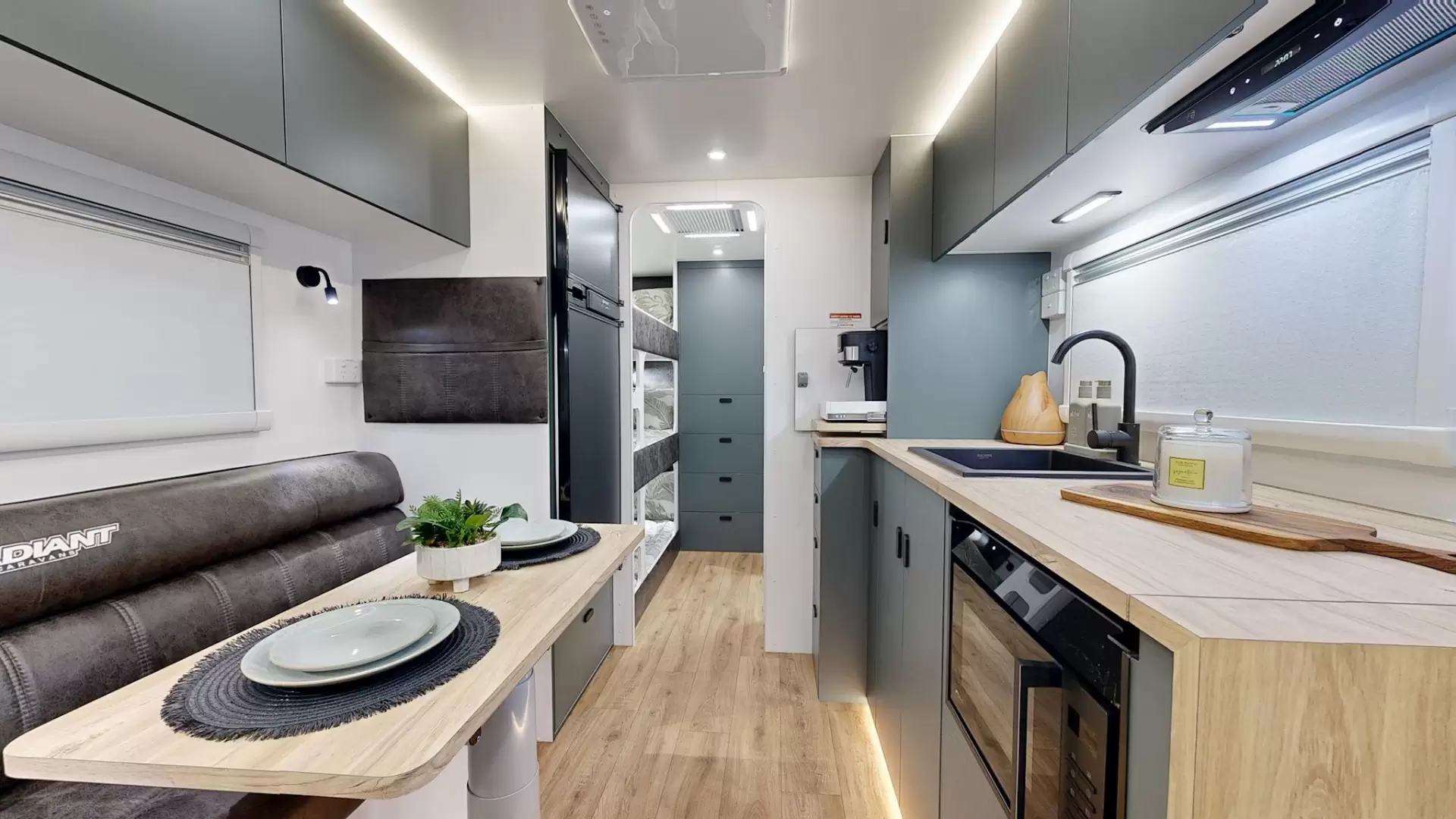 OFF GRID, OFF ROAD WITH AIRBAGS AND MASSIVE TOOL BOXES 19.6 FT, 2 BUNKS FAMILY VAN!KEY FEATURESCruisemaster XTAirbags With Body Control SystemHeavy-Duty Extreme Front ToolboxExtreme Rear Box with 2 Jerry Can HoldersVictron BMS with Blue Smart Charger, DC-DC Charger, MPPT 100/50 and Cerbo GX4 x 200W Solar Panels2 x 200Ah Lithium Batteries3000W Baintech InverterEdge CappingOne-Piece Composite RoofOne-Piece Honeycomb FloorTruss ChassisRaptor-Coated Chassis265/75R16 Mud Terrain Tyres3 x 105L Fresh Water Tanks1 x 105L Grey Water TankDO45 Coupling – ATM 4500kgWaterfall BenchtopsFlat Blind Double-Glazed WindowsMilenco Dust Reduction System with TV Antenna900mm High Checkerplate270L Compressor FridgeSwift Induction Cooktop with 3-in-1 Air FryerTHIS VAN HAS BEEN UPGRADED WITH (INCLUDED IN PRICE):INSTANT HOT WATER SERVICEWALLMOUNT WASHER & DRAWERS IN BUNK ROBE ARMY GREEN CLADDINGTRIPLE BUNK OPTIONCRUISEMASTER XT & BCSIntroducing the Extreme by Radiant Caravans — a fully equipped off-road caravan built to handle Australia’s toughest conditions.The Extreme runs independent coil suspension rated to 4.5T, supported by a truss chassis with Raptor coating, 265/75R16 mud-terrain tyres, and a DO45 coupling (ATM 4500kg) for confident towing on rough terrain. A heavy-duty Extreme front toolbox and Extreme rear box with dual jerry can holders provide serious storage for extended trips.Off-grid power is comprehensive, featuring 2 200Ah lithium batteries, 4 200W solar panels, a 3000W Baintech inverter, and a Victron battery management system with Blue Smart charger, DC-DC charger, MPPT 100/50, and Cerbo GX.Built with a one-piece honeycomb floor and one-piece composite roof, plus edge capping and 900mm high checkerplate, the Extreme is designed for durability and protection. Water capacity includes 3 105L fresh water tanks and a 105L grey water tank.Inside, the Extreme is packed with features, including waterfall benchtops, flat blind double-glazed windows, a 270L compressor fridge, Swift induction cooktop with 3-in-1 air fryer, and the Milenco dust reduction system with TV antenna — delivering comfort and capability wherever you go. FULL LIST OF FEATURES***CHASSIS***Cruisemaster XTAirbags With Body Control SystemHeavy Duty Extreme Front ToolboxExtreme Rear Box with 2 Jerry Can HoldersOne-Piece Honeycomb FloorTruss ChassisRaptor-Coated Chassis265/75R16 Mud Terrain TyresDO45 Coupling – ATM 4500kg6” Heavy Duty A-FrameExtended A-Frame – 2100mmDouble Alloy Pull-Out StepGalvanised Protection to Water TanksA-Frame Tap Guard2 x 9kg Gas BottlesMudflapsJockey WheelTrail SafeDrop-Down Stabiliser LegsGalvanised Wheel Box***INTERNAL***Waterfall BenchtopsBlack Shower GlassCeramic Vanity BasinQueen Bed with Innerspring MattressEnsuite MirrorTowel RailRobe Nooks with USB, USB-C and 240VHidden Handles with Soft-Open Gas Struts to OverheadsSoft-Close DrawersRecessed Cooktop with Lift-Up Lid over StoveUpholstered BedheadUnder-Bed StorageToilet Roll HolderInternal TV BracketFire ExtinguisherSmoke Detector***EXTERNAL***Edge CappingOne-Piece Composite RoofFlat Blind Double-Glazed WindowsMilenco Dust Reduction System with TV Antenna900mm CheckerplateRoll-Out AwningFront Tunnel BootFold-Down Picnic Table with LED Light and USB2 x LED-Framed Sky HatchesMain Entry Door with BinCoast to Coast Access DoorsExternal TV Box12V Fan and LED Hatch to Shower and Toilet***ELECTRICAL***Victron BMS with Blue Smart Charger, DC-DC Charger, MPPT 100/50 and Cerbo GX4 x 200W Solar Panels2 x 200Ah Lithium Batteries3000W Baintech InverterSafety Dave Reverse Camera with Monitor KitLED Ceiling Downlights ThroughoutLED Strip Lighting in Overheads and Under KitchenLED Light over Sink and Vanity2 x 12V Fans in Bedroom1 x 12V Fan in Each Bunk (Family Van)3 x Large Heavy-Duty Annex LightsFront and Rear Work Lights2 x Lights in Tunnel BootLED TaillightsExternal TV Co-Ax Point2 x Reading Lights with USB and USB-C in Bedroom2 x Reading Lights with USB and USB-C in Seating Area1 x Internal TV Point***PLUMBING***3 x 105L Fresh Water Tanks1 x 105L Grey Water TankBlack Tapware ThroughoutExternal ShowerThetford ToiletHot Water SystemDigital Water Level GaugeLockable Water FillersMains Pressure Inlet12V Shurflo Water PumpFlick Mixer TapsExternal Gas Bayonet***APPLIANCES***270L Compressor FridgeSwift Induction Cooktop with 3-in-1 Air FryerGree Air Conditioner3.2kg Top-Loader Washing MachineFusion Radio with Bluetooth12V Rangehood24” Smart TVTare: 2894 KGATM: 4500KGBALL: 245 KGInternal Size: 19.6 FTExternal Size: 19.6 FTExplore our latest caravan models, now available with financing options. We accept trade-ins and offer consignment services. Additionally, we provide servicing, maintenance, and a wide range of accessories.Our Hours:Monday to Friday: 9:00 am - 5:00 pmSaturday: 9:00 am - 3:00 pmPlease note that we are closed on public holidaysPLEASE NOTE PRICE IS BASED ON PICK UP MELBOURNEADD 8,000 FOR WA FRIGHT AND REGOADD 3,000 FOR NSW FRIGHT AND REGOABOUT USStep into a new age of travel with our exceptional caravan selection, where urban sophistication meets the sunseeker's delight. As you journey through uncharted landscapes, our caravans redefine what's possible. From family getaways to off-road escapes, our models offer a retreat from the ordinary. Picture yourself as a true Lotus, blossoming amidst diverse terrains with grace and elegance, whether you're conquering tough landscapes or setting up bunks for a cozy night's sleep.Our caravans are crafted with a supreme level of design and care, standing as masterpieces ready to withstand the test of time, the rugged outdoors, and the discerning eye of design enthusiasts. Just like a Snowy River carving its path, our caravans navigate through challenges effortlessly, making you a Patriot of exploration. With features like 4x4 capability, ensuite facilities, and inbuilt toilets, you have the freedom to embrace the off-road journey fully.Imagine being on the move through beautiful landscapes, unwinding in a 