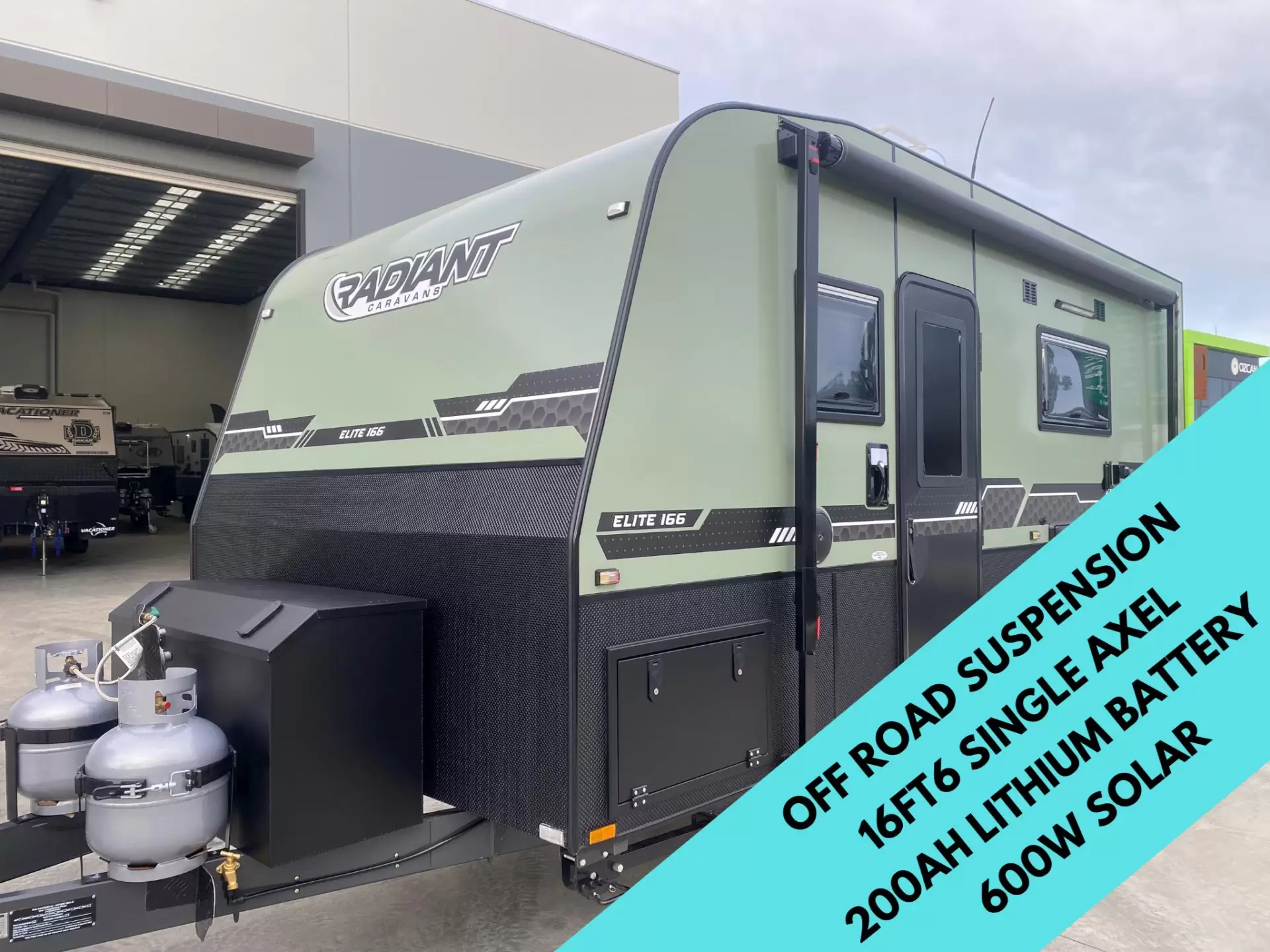 COMPACT SINGLE AXEL FULL OFF-ROAD WITH LITHIUM AND LOTS OF SOLAR - BEST VAULE VAN IN AUSTRALIA 16.6 FT FT FULL OFF-ROAD Discover the unparalleled quality and exceptional value of Radiant Caravans, the best value caravan in Australia for under 100k. Designed with premium features and cutting-edge technology, this caravan ensures a luxurious and comfortable travel experience.Featuring the TUFF RIDE independent coil suspension and 16” all-terrain tyres, the Radiant caravan promises you the freedom to take this van anywhere offroad. It is equipped with a 200AH lithium battery and 3x 200W solar panels, offering reliable power for your free camping adventures. The honeycomb flooring and one-piece composite roof enhance durability and longevity. This caravan comes with a large front toolbox, a 100L grey water tank, and a front stone guard for added convenience and protection. Inside, you'll find waterfall bench tops and a spacious 188L fridge compressor for a touch of luxury. ***KEY FEATURES***Tuff Ride Independent coil Suspension 1 x 200AH lithium battery3x200W solar panel Honeycomb floorOne piece composite roofDometic Dust Reduction SystemFront stone guardDO - 35 Coupling16” All terrain tyres2 x 105L Fresh water tanks1 x 105L Grey Water tankExternal showerLarge front Tool Box6”Heavy duty A- Frame188L Fridge CompressorFusion RA60 RadioOutside TV BoxFULL LIST OF FEATURES ***CHASSIS***Tuff Ride Independent coil Suspension ATM - 3500KGHoneycomb floorFront stone guard16” All terrain tyresPainted Supagal chassis6”Heavy duty A- FrameLarge front Tool BoxJockey WheelA- Frame tap guardGas Regulator cover3 Arm heavy duty bumper bar with wood storageGalvanized wheel boxGalvanized protection to water tanksDouble alloy pull out stepDrop down stabilizer legsExtended A frame - 1900mmBmpro Trailsafe2x9kg Gas bottlesDO - 35 CouplingWaterfall BenchtopsSoft close drawersSparre Wheel Under Chassis***ELECTRICAL*** 1 x 200AH lithium battery3x200W solar panel BM PRO Battery plus35-II-HA with Odyssey1x Large heavy duty Annex lightsLED TaillightsInvertor provision12 Pin Flat car plug and Grey Anderson Plug 50 amp1 x 12v fanSafety Dave reverse camera with Car monitor kitTV antennaLED ceiling down lights throughout2 x reading lights with USB in bedroom2 x reading lights with USB in seating area1 x internal tv pointLed light over sink and vanityLed strip on overhead, under kitchen and entry door step2 x Lights in tunnel bootTv Co-ax external point240v 15amp inlet and 240v and 10 amp outlet***PLUMBING***2 x 105L Fresh water tanks1 x 105L Grey Water tankExternal showerDigital water level gaugeBlack tapware throughoutMains Pressure inletSwift Gas (3 gas,1 electric)Swift hot water systemCassette toiletLockable water fillersFlick Mixer taps12v Shurflo water pumpExternal gas bayonetA-Frame mains pressure tapShower***EXTERNAL***One piece composite roofDometic Dust Reduction SystemOutside TV BoxRoll out AwningDouble glazed large Ranger windowsMain entry door2 x LED framed sky hatchesBubble entry door handle12v Fan and LED hatch to shower and toiletFold down picnic tableCoast to coast access doorsFront tunnelbootHigh quality vinyl decals***INTERNAL***Waterfall BenchtopsSoft close drawersNooks in Robes with USB USB C and 240Queen bed with innerspring mattressUpholstered bed headUnder bed storageRecessed cooktop with lift-top over stoveInternal tv bracketHidden handles and soft open gas struts on overheadsFrosted shower doorLarge Ensuite mirrorKitchen PantriesChoice of L shape/Cafe seatingCeramic Vanity basinSliding door to ensuiteFire ExtinguisherSmoke detectorToilet Roll holderTowel rail***APPLIANCES***188L Fridge CompressorFusion RA60 RadioAir conditionerMicrowaveWashing machineSwift 3 Gas/1 Electric, Grill and oven12v Rangehood24” smart LED TVOur Hours:Monday to Friday: 9:00 am - 5:00 pmSaturday: 9:00 am - 3:00 pmPlease note that we are closed on public holidaysPLEASE NOTE PRICE IS BASED ON PICK UP MELBOURNEADD 8,000 FOR WA FREIGHT AND REGOADD 3,000 FOR NSW FREIGHT AND REGOABOUT USStep into a new age of travel with our exceptional caravan selection, where urban sophistication meets the sunseeker's delight. As you journey through uncharted landscapes, our caravans redefine what's possible. From family getaways to off-road escapes, our models offer a retreat from the ordinary. Picture yourself as a true Lotus, blossoming amidst diverse terrains with grace and elegance, whether you're conquering tough landscapes or setting up bunks for a cozy night's sleep.Our caravans are crafted with a supreme level of design and care, standing as masterpieces ready to withstand the test of time, the rugged outdoors, and the discerning eye of design enthusiasts. Just like a Snowy River carving its path, our caravans navigate through challenges effortlessly, making you a Patriot of exploration. With features like 4x4 capability, ensuite facilities, and inbuilt toilets, you have the freedom to embrace the off-road journey fully.Imagine being on the move through beautiful landscapes, unwinding in a club lounge after a day of adventure, or taking a refreshing shower amidst nature's bounty. Whether you're setting off on an off-road adventure or enjoying a night in a cozy bunk setup, our caravans are designed to offer maximum comfort and convenience. So go ahead, embrace the off-road freedom, and set out on a semi off-road journey where you become the hero of your own story.From the urban jungle to the untouched wilderness, let our caravans be your Atlas. This is your caravan – your titanium haven in an ever-changing world, designed to thrive in both urban environments and off-road adventures. Embody the spirit of a true crusader as you discover unforgettable experiences with Royal Flair – the essential companion for your journey, linking you to a vast network of possibilities, including the Great Aussie spirit that fuels your wonderland.We're not just limited to our own brand. We proudly trade in a number of reputable brands, includin
