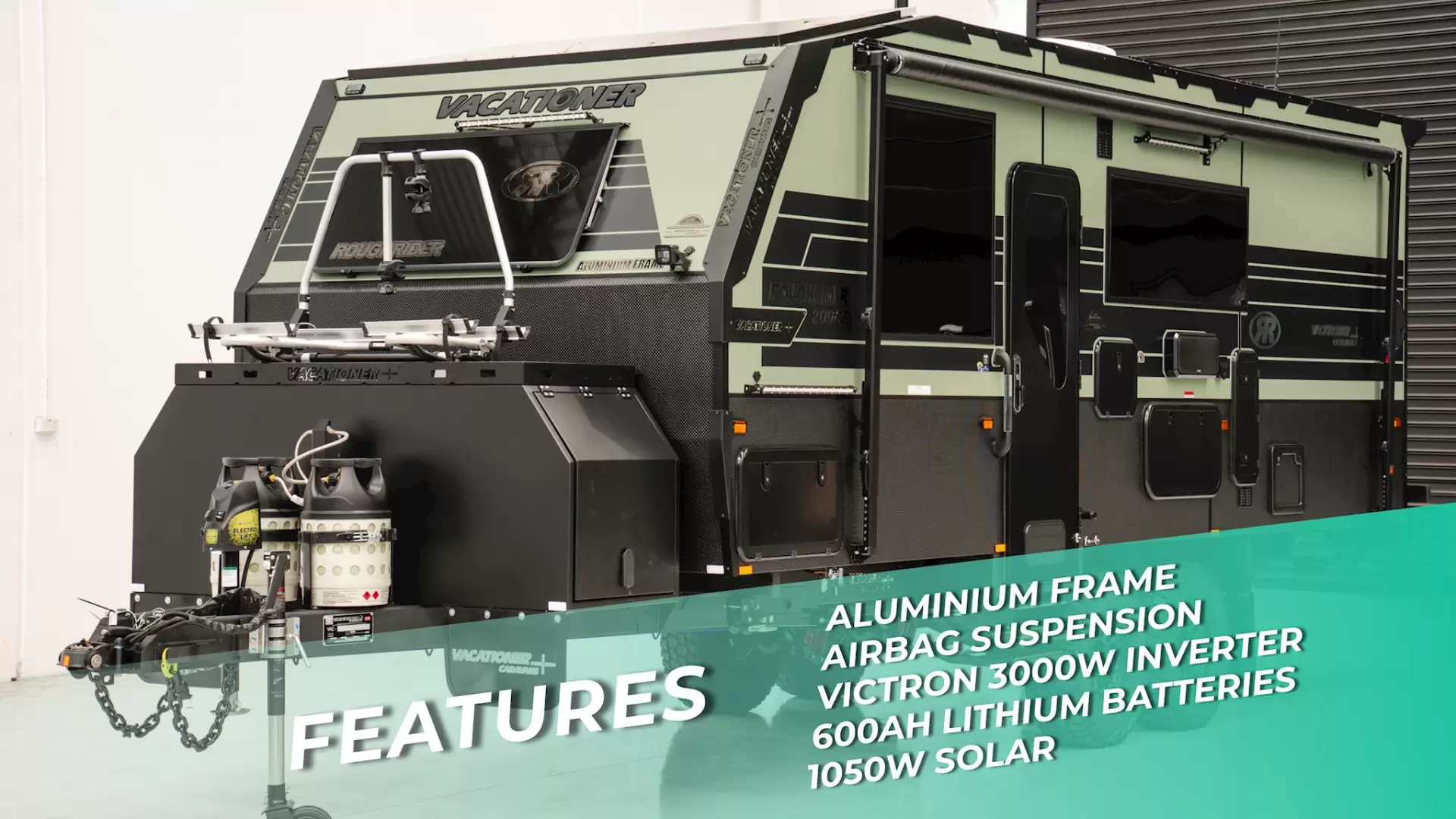 21FT REAR CLUB — WITH AIRBAG SUSPENSION, VICTRON OFF-GRID POWER, ALUMINIUM FRAME, AND 1000W OF SOLAR.KEY FEATURESALUMINIUM FRAME (HENROB RIVETED & TIG WELDED)AIRBAG SUSPENSION - TRACK HAWK LEVEL 2 MANUAL 4.5TONE PIECE FIBERGLASS INTERNAL WALLS AND ROOFXPS CLOSED CELL FOAM INSULATIONVICTRON OFF GRID SYSTEM – VICTRON 12V BATTERY MANAGEMENT SYSTEM VICTRON 12V MULTIPLUS 3000W-120A INVERTERVICTRON CERBO GX CONTROLLER GXTOUCH-50 MONITOR2 X 300AH (600AH) HIGH DISCHARGE IP67 LITHIUM BATTERIES2 X 30A VICTRON MPPT SMART SOLAR CONTROLLERS1 X 35A VICTRON MPPT SMART SOLAR CONTROLLERVICTRON 50A DC-DC CHARGER1050W OF SOLAR- 3 X 200W & 1 X 450W 2026 X-GEN ROUGRIDER EDGE CAPPINGX-GEN REAR WINGTRUSS CHASSISRAPTOR COATED CHASSIS12V ELECTRO JACK-JOCKEY WHEELSTARLINK MINI PROVISIONMICKEY THOMPSON BAJA BOSS AT TYRES (265/75R16)16" WRATH RIMS2 X 95L FRESH WATER TANKS110L GREY WATER TANKRECESSED DO-45 COUPLINGMINI X-GEN FRONT BOX WITH VACATIONER MUDFLAPSREAR TWIN WOODBOX WITH 1 X LID & 2 X JERRY CAN HOLDERS270L COMPRESSOR FRIDGEONE PIECE HONEYCOMB FLOORFUSION MARINE AUDIO ENTERTAINMENT12" BRAKES6" A-FRAME 5MM THICKTHIS VAN HAS BEEN UPGRADE WITH (INCLUDED IN PRICE)WHITE AND GOLD PACKDOUBLE WINDOW Introducing the 2026 Vacationer Rough Rider by Vacationer Caravans — a serious aluminium-frame off-road caravan built for Australia.Built with a full aluminium frame, one-piece fibreglass internal walls and roof, and a one-piece honeycomb floor, the Rough Rider uses zero timber in the walls for a waterproof, rot-free build, enhanced by XPS closed-cell foam insulation for superior thermal performance.Underneath, airbag suspension delivers ride comfort, stability, and control on rough tracks, supported by a truss chassis with Raptor coating, a 6” A-frame, DO-45 coupling, and Mickey Thompson tyres for serious off-road strength.Power comes from a full Victron off-grid electrical system with 600Ah lithium, 1050W solar, and a 3000W inverter, making it ready for extended remote touring. Finished with stealth styling, including a rear spoiler, massive front toolbox, and stealth edge capping, the Rough Rider is built tough and engineered to go the distance.FULL LIST OF FEATURES:***CHASSIS & SUSPENSION***AIRBAG SUSPENSION - TRACK HAWK LEVEL 2 MANUAL 4.5TTRUSS CHASSISRAPTOR COATED CHASSISMINI X-GEN FRONT BOX WITH VACATIONER MUDFLAPSREAR WOOD BOX WITH LID & 2 X JERRY CAN HOLDERSTIE DOWN POINTS ON CHASSIS TO HOLD UP SUSPENSION ARM4-ARM STRAIGHT OFF-ROAD REAR BARMICKEY THOMPSON BAJA BOSS AT TYRES (265/75R16)16" WRATH RIMS12" BRAKESONE PIECE HONEYCOMB FLOORRECESSED DO-45 COUPLING6" A-FRAME 5MM THICKORANGE NEON CHASSIS STRIP LIGHTINGRATED SAFETY CHAINS WITH CHASSIS MOUNTING BRACKET12V ELECTRO JACK-JOCKEY WHEELEUROFLEK DOUBLE JOCKEY WHEELCHECKERPLATE WATER TANK GUARDSCHECKERPLATE GREY WATER TANK COVERDROP DOWN LEGSVACATIONER LOGO MUDFLAPSSPARE WHEEL UNDERSLUNG ON SOME LAYOUTSFLAT FLOOR CHASSIS***ELECTRICAL***VICTRON OFF GRID SYSTEM – VICTRON 12V BATTERY MANAGEMENT SYSTEM VICTRON 12V MULTIPLUS 3000W-120A INVERTERVICTRON CERBO GX CONTROLLER GXTOUCH-50 MONITOR2 X 300AH (600AH) HIGH DISCHARGE IP67 LITHIUM BATTERIES2 X 30A VICTRON MPPT SMART SOLAR CONTROLLERS1 X 35A VICTRON MPPT SMART SOLAR CONTROLLERVICTRON 50A DC-DC CHARGER1050W OF SOLAR- 3 X 200W & 1 X 450W 50A BLUE ANDERSON PLUG FOR PORTABLE SOLAR50A BLACK ANDERSON PLUG FOR POWER OUT IN TOOLBOX DOORSIDEVICTRON GX LTE 4G MODEM WITH 4G ANTENNA WITH 1 YEAR SIMSTARLINK MINI PROVISIONALKO ESC (ELECTRONIC STA BILLITY CONTROL)SAFETY DAVE REAR VIEW CAMERA WITH 7" CAR MONITOREUROFLEK OMNI DIRECTIONAL ANTENNA24" LED SMART TV INTERNALFUSION RA210 AUDIO SYSTEM2 X FUSION INTERNAL ROOF SPEAKERSFUSION SOUND PANELLIGHT, 12V USB/USBC, DOUBLE 240V P/POINTS IN BEDROOMLIGHT, 12V USB/USBC, DOUBLE 240V P/POINTS AT SEATING AREABAR LIGHT WHITE/AMBER LIGHTS FRONT AND BACKBAR LIGHT WHITE/AMBER ROADSIDEBAR LIGHT WHITE/AMBER DOORSIDEBAR LIGHT WHITE/AMBER ABOVE TUNNELBOOT DOORSIDESMALL ADJUSTABLE SQUARE WORK LIGHT ON FRONT WALLDOORSIDE12V FAN OVER MAIN BED12V FAN AT LOUNGE12V FAN AT EACH BUNKLED STRIP LIGHT AROUND STEPWELLPREMIUM POWER POINTS & SWITCHESEXTERNAL TV ENTERTAINMENT HATCH 32" SMART LED TV 2 X 32" IN-BUILT SMART LED TVSFUSION RA670 AUDIO SYSTEM WITH SOUNDBARS 2 X 12V FAN AT LOUNGE ***PLUMBING***ENDLESS HOT WATER SYSTEMTHETFORD CERAMIC TOILET WITH BUILT IN CABINET2 X 95L FRESH WATER TANKS110L GREY WATER TANKGREY WATER BYPASS12V PUMPBRASS MANIFOLD SYSTEMEXTERNAL SHOWER2 X 7.5KG COMPOSITE GAS BOTTLES3 WAY SINK MIXER TAP WITH BUILT IN WATER FILTER OUTLETGAS BAYONET***OUTSIDE***MINI X-GEN FRONT BOX WITH VACATIONER MUDFLAPSREAR TWIN WOODBOX WITH 1 X LID & 2 X JERRY CAN HOLDERSONE PIECE EXTERNAL FIBREGLASS ROOF2026 X-GEN ROUGRIDER EDGE CAPPINGX-GEN REAR WING12V DUST SUPPRESSION SYSTEMLED SKYLIGHT IN ROOFEUROFLEK LED HATCH OVER SHOWER & TOILETEUROFLEK FLAT BLIND WINDOWSMOULDED STEPWELL WITH LEDAUTOMATIC ELECTRIC EUROFLEK LED PULLOUT STEP2 X 7.5KG COMPOSITE GAS BOTTLESPICNIC TABLE, KEYLESS WITH LED LIGHTSAIL TRACK ROADSIDELED ROLL OUT AWNINGREAR HATCH UNDER CLUB LOUNGE ELECTRIC DOUBLE LED PULL OUT STEP***INSIDE***ALUMINIUM FRAME (HENROB RIVETED & TIG WELDED)XPS CLOSED CELL FOAM INSULATIONONE PIECE FIBERGLASS INTERNAL WALLS AND ROOFNEW VACATIONER BACKLIT BEDHEAD WITH 2026 LOGO'SWHITE LED MOOD LIGHTING LUXURY SOFT FURNISHINGS WITH A DISTINCT HIGH-END FEELPREMIUM PILLOW TOP INNERSPRING MATTRESSLUXURY VINYL FLOORING WITH FELT UNDERLAYPREMIUM SPLASHBACKSBLACK SINK, VANITY BASIN, TAPWARE & BATHROOM ACCESSORIESTITUS TECFORM METAL SOFT CLOSE DRAWER RUNNERSWATERFALL BENCHTOPSROBE CUTOUTSLARGE SHOWER WITH MIRRORED DOORFRAMELESS ENSUITE MIRROR WITH BACKLIT LEDSLIDING DOOR TO ENSUITEMIRROR DOOR SHAVING CABINET WITH SHELVES***APPLICANCES***270L COMPRESSOR FRIDGESWIFT HAWK TWIN INDUCTION HOBNCE 4 IN 1 MICROWAVE OVEN IN DOORSIDE KITCHENGREE 3.5KW INVERTERAIRCONFUSION MARINE AUDIO ENTERTAINMENT12V RANGEHOOD24” LED SMART TV INTERNALEXTERNAL ENTERTAINMENT HATCHFUSION EXTERNAL STEREO PANELEXTRA GREE 2.5KW INVERTER AIRCON