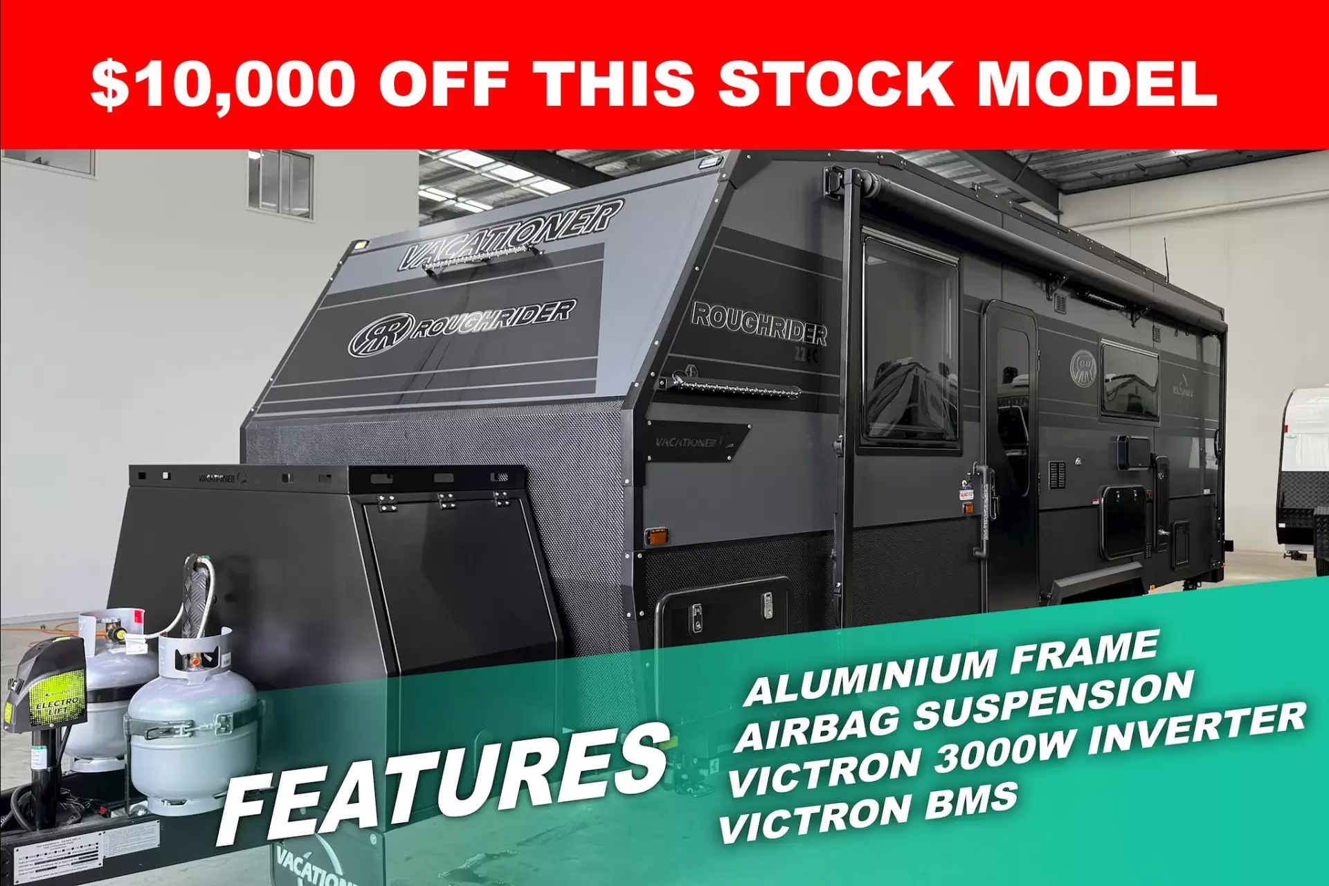 QUAD BUNK— WITH AIRBAG SUSPENSION, VICTRON OFF-GRID POWER, ALUMINIUM FRAME, AND 1000W OF SOLAR.KEY FEATURESALUMINIUM FRAME (HENROB RIVETED & TIG WELDED)AIRBAG SUSPENSION - TRACK HAWK LEVEL 2 MANUAL 4.5TONE PIECE FIBERGLASS INTERNAL WALLS AND ROOFXPS CLOSED CELL FOAM INSULATIONVICTRON OFF GRID SYSTEM – VICTRON 12V BATTERY MANAGEMENT SYSTEM VICTRON 12V MULTIPLUS 3000W-120A INVERTERVICTRON CERBO GX CONTROLLER GXTOUCH-50 MONITOR2 X 300AH (600AH) HIGH DISCHARGE IP67 LITHIUM BATTERIES2 X 30A VICTRON MPPT SMART SOLAR CONTROLLERS1 X 35A VICTRON MPPT SMART SOLAR CONTROLLERVICTRON 50A DC-DC CHARGER1050W OF SOLAR- 3 X 200W & 1 X 450W 2026 X-GEN ROUGRIDER EDGE CAPPINGX-GEN REAR WINGTRUSS CHASSISRAPTOR COATED CHASSIS12V ELECTRO JACK-JOCKEY WHEELSTARLINK MINI PROVISIONMICKEY THOMPSON BAJA BOSS AT TYRES (265/75R16)16" WRATH RIMS2 X 95L FRESH WATER TANKS110L GREY WATER TANKRECESSED DO-45 COUPLINGMINI X-GEN FRONT BOX WITH VACATIONER MUDFLAPSREAR TWIN WOODBOX WITH 1 X LID & 2 X JERRY CAN HOLDERS270L COMPRESSOR FRIDGEONE PIECE HONEYCOMB FLOORFUSION MARINE AUDIO ENTERTAINMENT12" BRAKES6" A-FRAME 5MM THICKIntroducing the 2026 Vacationer Rough Rider by Vacationer Caravans — a serious aluminium-frame off-road caravan built for Australia.Built with a full aluminium frame, one-piece fibreglass internal walls and roof, and a one-piece honeycomb floor, the Rough Rider uses zero timber in the walls for a waterproof, rot-free build, enhanced by XPS closed-cell foam insulation for superior thermal performance.Underneath, airbag suspension delivers ride comfort, stability, and control on rough tracks, supported by a truss chassis with Raptor coating, a 6” A-frame, DO-45 coupling, and Mickey Thompson tyres for serious off-road strength.Power comes from a full Victron off-grid electrical system with 600Ah lithium, 1050W solar, and a 3000W inverter, making it ready for extended remote touring. Finished with stealth styling, including a rear spoiler, massive front toolbox, and stealth edge capping, the Rough Rider is built tough and engineered to go the distance.FULL LIST OF FEATURES:***CHASSIS & SUSPENSION***AIRBAG SUSPENSION - TRACK HAWK LEVEL 2 MANUAL 4.5TTRUSS CHASSISRAPTOR COATED CHASSISMINI X-GEN FRONT BOX WITH VACATIONER MUDFLAPSREAR WOOD BOX WITH LID & 2 X JERRY CAN HOLDERSTIE DOWN POINTS ON CHASSIS TO HOLD UP SUSPENSION ARM4-ARM STRAIGHT OFF-ROAD REAR BARMICKEY THOMPSON BAJA BOSS AT TYRES (265/75R16)16" WRATH RIMS12" BRAKESONE PIECE HONEYCOMB FLOORRECESSED DO-45 COUPLING6" A-FRAME 5MM THICKORANGE NEON CHASSIS STRIP LIGHTINGRATED SAFETY CHAINS WITH CHASSIS MOUNTING BRACKET12V ELECTRO JACK-JOCKEY WHEELEUROFLEK DOUBLE JOCKEY WHEELCHECKERPLATE WATER TANK GUARDSCHECKERPLATE GREY WATER TANK COVERDROP DOWN LEGSVACATIONER LOGO MUDFLAPSFLAT FLOOR CHASSIS***ELECTRICAL***VICTRON OFF GRID SYSTEM – VICTRON 12V BATTERY MANAGEMENT SYSTEM VICTRON 12V MULTIPLUS 3000W-120A INVERTERVICTRON CERBO GX CONTROLLER GXTOUCH-50 MONITOR2 X 300AH (600AH) HIGH DISCHARGE IP67 LITHIUM BATTERIES2 X 30A VICTRON MPPT SMART SOLAR CONTROLLERS1 X 35A VICTRON MPPT SMART SOLAR CONTROLLERVICTRON 50A DC-DC CHARGER1050W OF SOLAR- 3 X 200W & 1 X 450W 50A BLUE ANDERSON PLUG FOR PORTABLE SOLAR50A BLACK ANDERSON PLUG FOR POWER OUT IN TOOLBOX DOORSIDEVICTRON GX LTE 4G MODEM WITH 4G ANTENNA WITH 1 YEAR SIMSTARLINK MINI PROVISIONALKO ESC (ELECTRONIC STA BILLITY CONTROL)SAFETY DAVE REAR VIEW CAMERA WITH 7" CAR MONITOREUROFLEK OMNI DIRECTIONAL ANTENNA24" LED SMART TV INTERNALFUSION RA210 AUDIO SYSTEM2 X FUSION INTERNAL ROOF SPEAKERSFUSION SOUND PANELLIGHT, 12V USB/USBC, DOUBLE 240V P/POINTS IN BEDROOMLIGHT, 12V USB/USBC, DOUBLE 240V P/POINTS AT SEATING AREABAR LIGHT WHITE/AMBER LIGHTS FRONT AND BACKBAR LIGHT WHITE/AMBER ROADSIDEBAR LIGHT WHITE/AMBER DOORSIDEBAR LIGHT WHITE/AMBER ABOVE TUNNELBOOT DOORSIDESMALL ADJUSTABLE SQUARE WORK LIGHT ON FRONT WALLDOORSIDE12V FAN OVER MAIN BED12V FAN AT LOUNGE12V FAN AT EACH BUNKLED STRIP LIGHT AROUND STEPWELLPREMIUM POWER POINTS & SWITCHES***PLUMBING***ENDLESS HOT WATER SYSTEMTHETFORD CERAMIC TOILET WITH BUILT IN CABINET2 X 95L FRESH WATER TANKS110L GREY WATER TANKGREY WATER BYPASS12V PUMPBRASS MANIFOLD SYSTEMEXTERNAL SHOWER2 X 7.5KG COMPOSITE GAS BOTTLES3 WAY SINK MIXER TAP WITH BUILT IN WATER FILTER OUTLETGAS BAYONET***OUTSIDE***MINI X-GEN FRONT BOX WITH VACATIONER MUDFLAPSREAR TWIN WOODBOX WITH 1 X LID & 2 X JERRY CAN HOLDERSONE PIECE EXTERNAL FIBREGLASS ROOF2026 X-GEN ROUGRIDER EDGE CAPPINGX-GEN REAR WING12V DUST SUPPRESSION SYSTEMLED SKYLIGHT IN ROOFEUROFLEK LED HATCH OVER SHOWER & TOILETEUROFLEK FLAT BLIND WINDOWSMOULDED STEPWELL WITH LEDAUTOMATIC ELECTRIC EUROFLEK LED PULLOUT STEP2 X 7.5KG COMPOSITE GAS BOTTLESPICNIC TABLE, KEYLESS WITH LED LIGHTSAIL TRACK ROADSIDELED ROLL OUT AWNINGACCESS HATCH UNDER BED ROADSIDEFRONT WINDOW AND SHADE ACCESS HATCH UNDER BUNK BIKE CARRIER TO TOOLBOXELECTRIC DOUBLE LED PULL OUT STEP***INSIDE***ALUMINIUM FRAME (HENROB RIVETED & TIG WELDED)XPS CLOSED CELL FOAM INSULATIONONE PIECE FIBERGLASS INTERNAL WALLS AND ROOFNEW VACATIONER BACKLIT BEDHEAD WITH 2026 LOGO'SWHITE LED MOOD LIGHTING LUXURY SOFT FURNISHINGS WITH A DISTINCT HIGH-END FEELPREMIUM PILLOW TOP INNERSPRING MATTRESSLUXURY VINYL FLOORING WITH FELT UNDERLAYPREMIUM SPLASHBACKSBLACK SINK, VANITY BASIN, TAPWARE & BATHROOM ACCESSORIESTITUS TECFORM METAL SOFT CLOSE DRAWER RUNNERSWATERFALL BENCHTOPSROBE CUTOUTSLARGE SHOWER WITH MIRRORED DOORFRAMELESS ENSUITE MIRROR WITH BACKLIT LEDSLIDING DOOR TO ENSUITEMIRROR DOOR SHAVING CABINET WITH SHELVES***APPLICANCES***270L COMPRESSOR FRIDGESWIFT HAWK TWIN INDUCTION HOBNCE 4 IN 1 MICROWAVE OVEN IN DOORSIDE KITCHENGREE 3.5KW INVERTERAIRCONFUSION MARINE AUDIO ENTERTAINMENT12V RANGEHOOD24” LED SMART TV INTERNALEXTERNAL ENTERTAINMENT HATCHFUSION EXTERNAL STEREO PANEL3KG FRONT LOAD WASHING MACHINE ON SOME LAYOUTSPLUS MUCH MORETare: 3260 KGATM: 4500 KGBALL: KGInternal Size: 23 FTExternal Size: 23 FTExplore our latest caravan models, now available with financing options. We accept trade-ins and