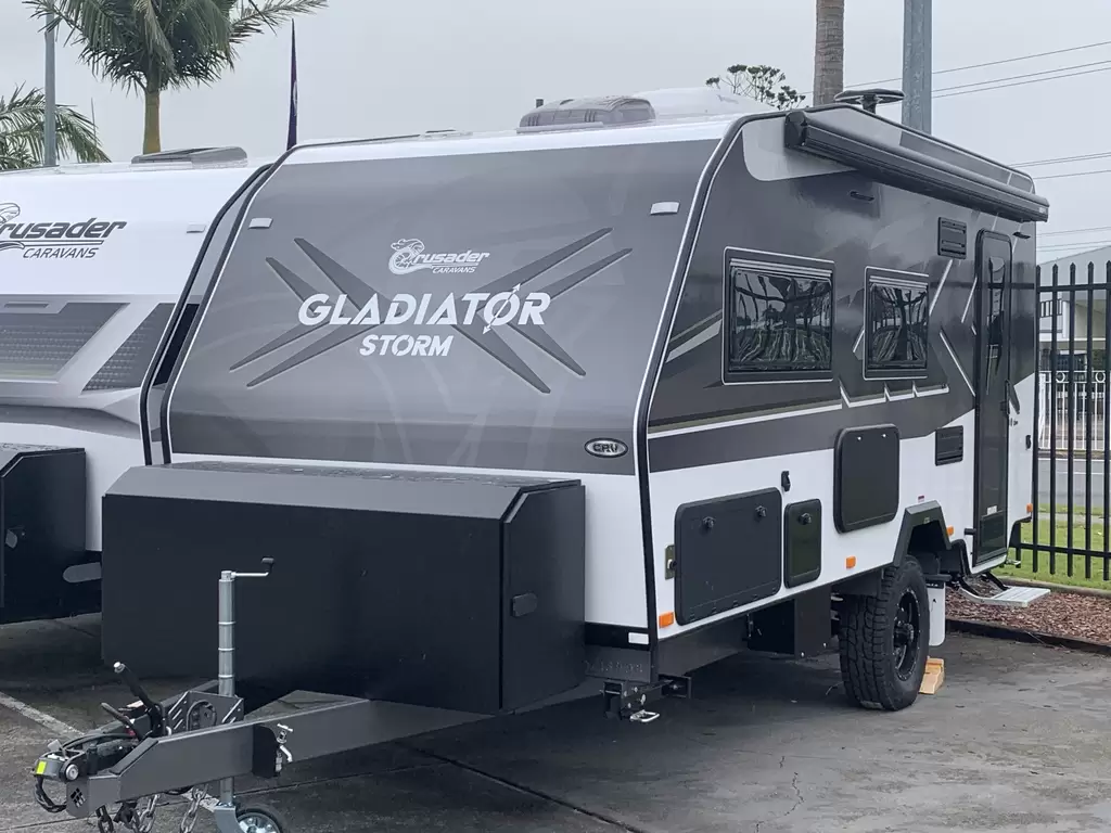 2025 PLATE STOCK CLEARANCE SALE!!**WAS 81,490 NOW 75,490**The Gladiator Storm is designed for off-road adventurers seeking a versatile caravan that adapts to modern lifestyles. Embracing the global trend of remote work, it features a flexible office space with a dedicated desk, perfect for staying productive while on the road. Alternatively, customers can opt for customisable configurations instead of the desk, including additional storage, an extra dinette area, or pet-friendly amenities such as a day bed and integrated bowls. With a standard café-style seating area, a functional kitchen, shower, and toilet, the Gladiator Storm is ideal for tailoring your off-road experience to suit both your work and leisure needs.
