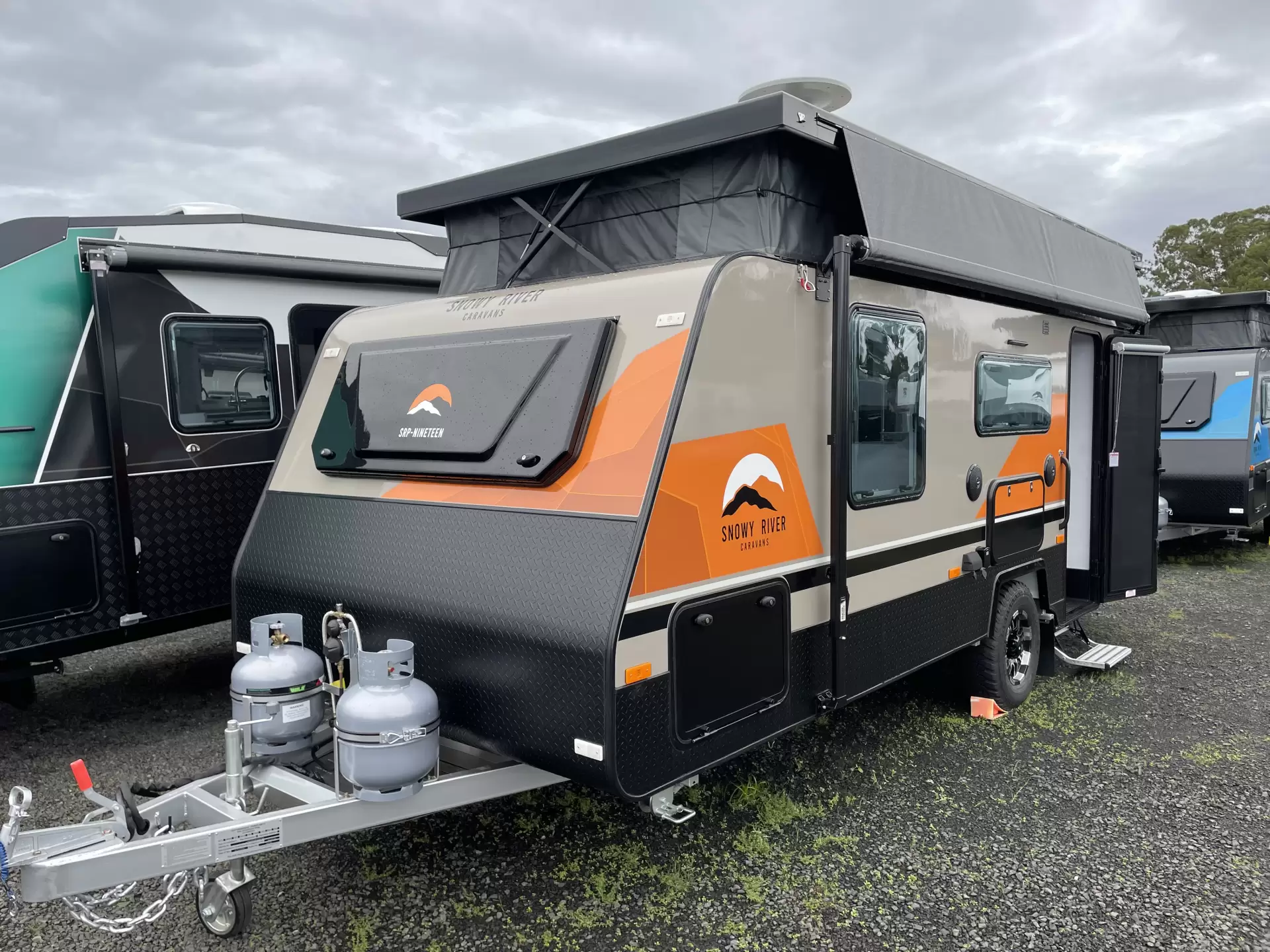 The SRP-19 is a 19ft pop top caravan with shower and toilet that offers the features of a full-size caravan while maintaining a compact and easy-to-tow design that takes the stress out of travelling. Perfect for couples, the SRP-19 features a north-south island queen bed, a generous galley kitchen, comfortable L-shaped lounge, and a full-width rear ensuite to wash off the dust of a day's travel.Factory options fitted to this caravan include brass colour pack, grey water tank, leather upholstery, fan on ceiling at foot of bed, Projecta PM300-BT BMS, and 2 USB reading lights in the bedroom.